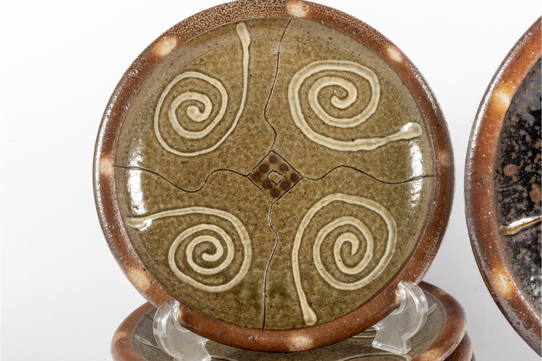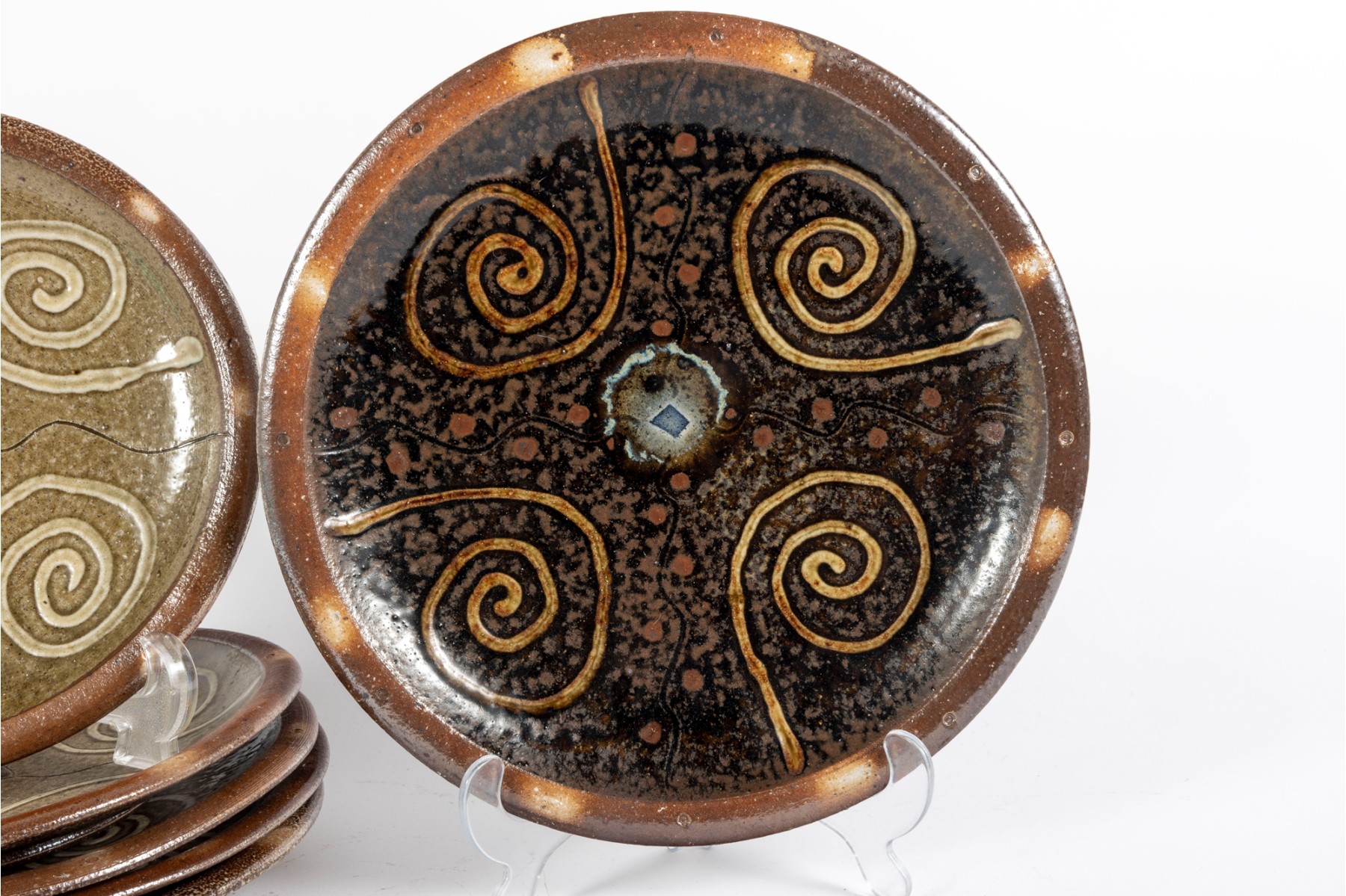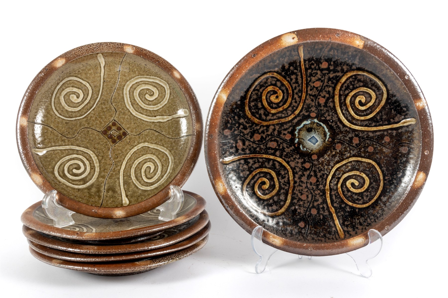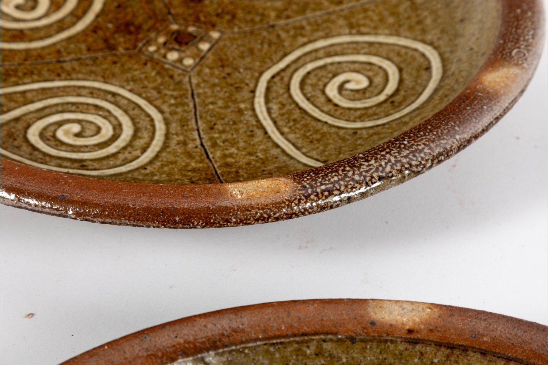 Salt glazed stoneware plates by Mark Hewitt emblazoned with spiral slip clay accents, all stamped on the underside with the potter's glyph and an incised number "77" representing the 77th firing.