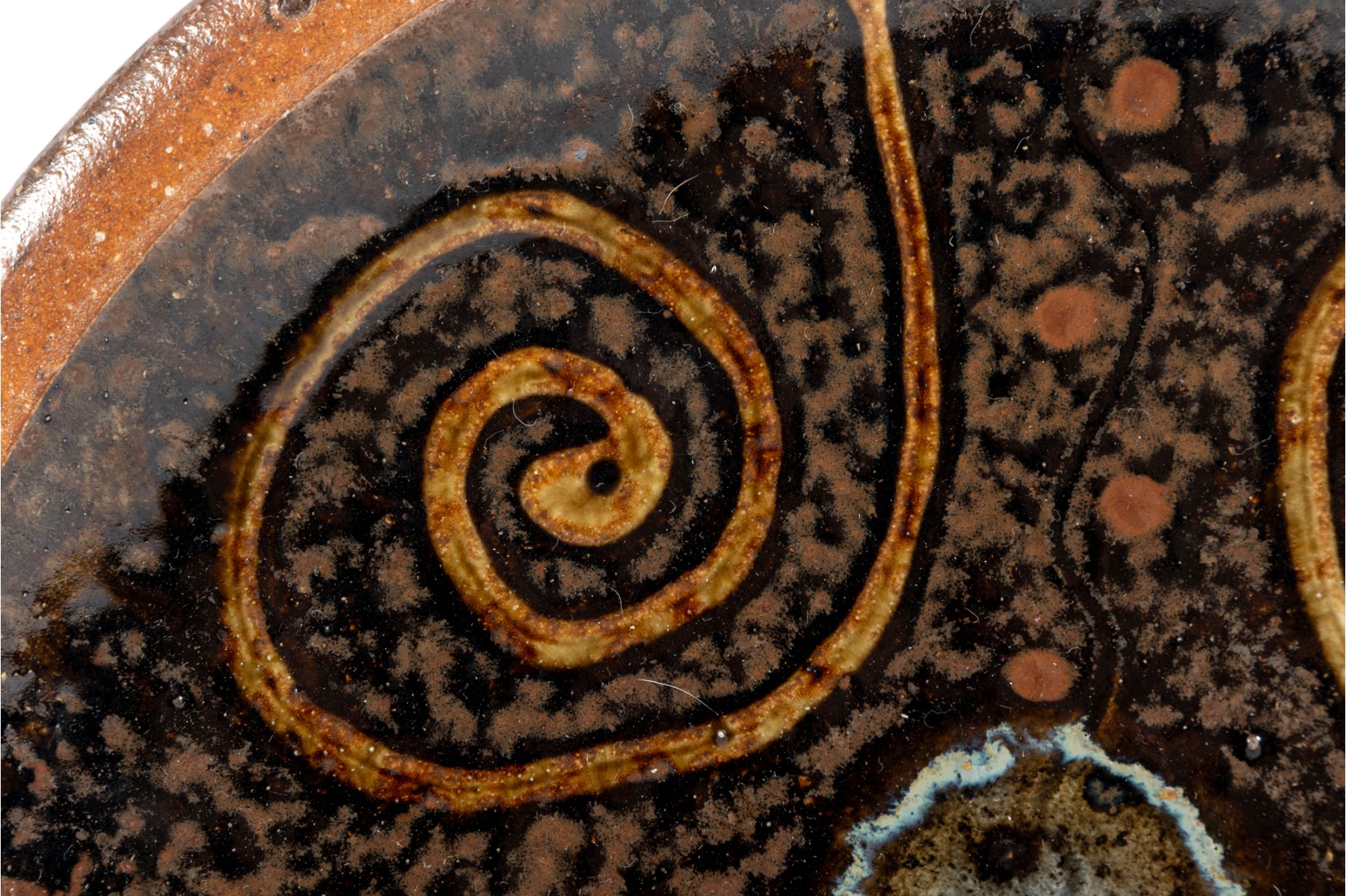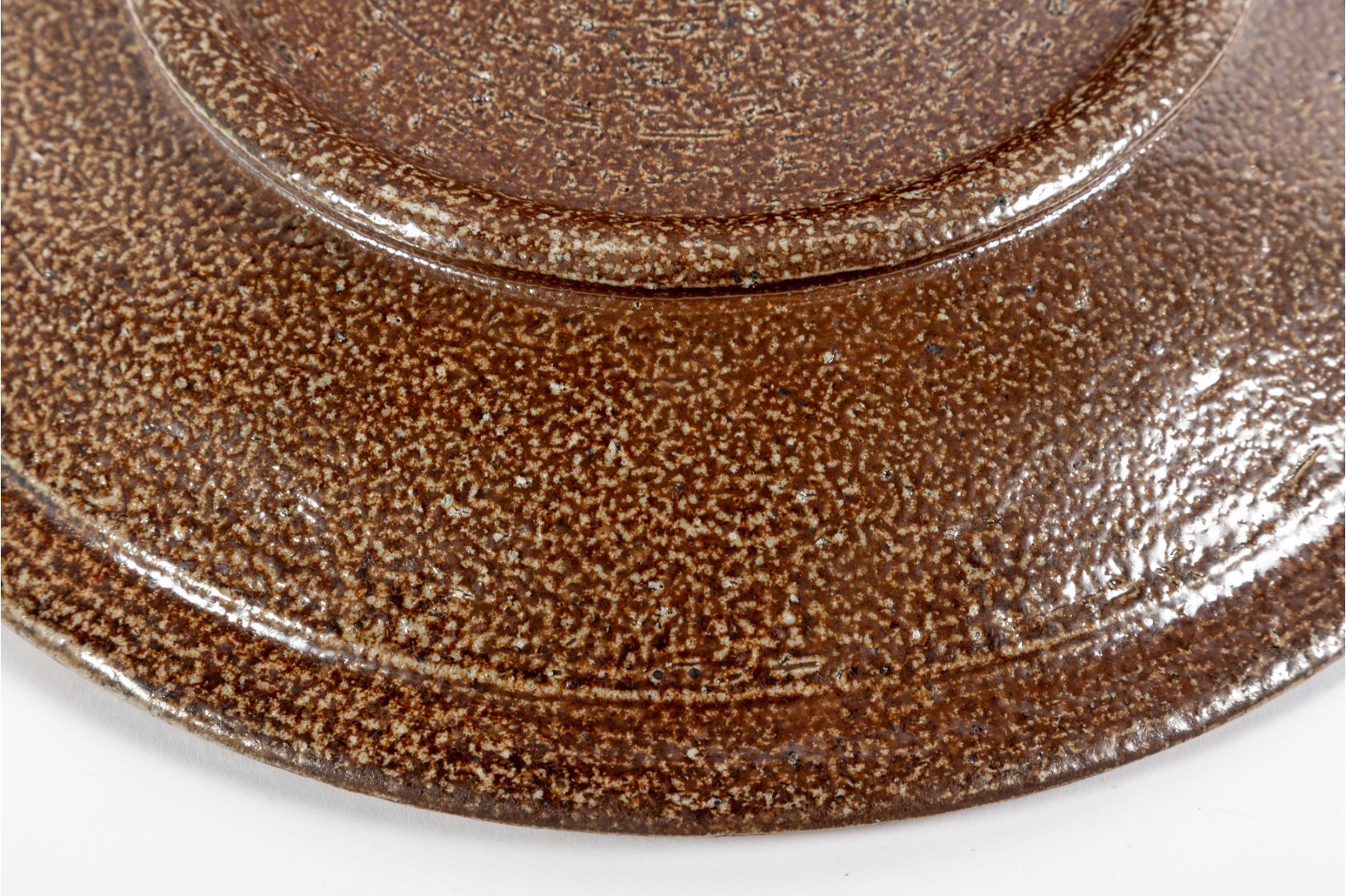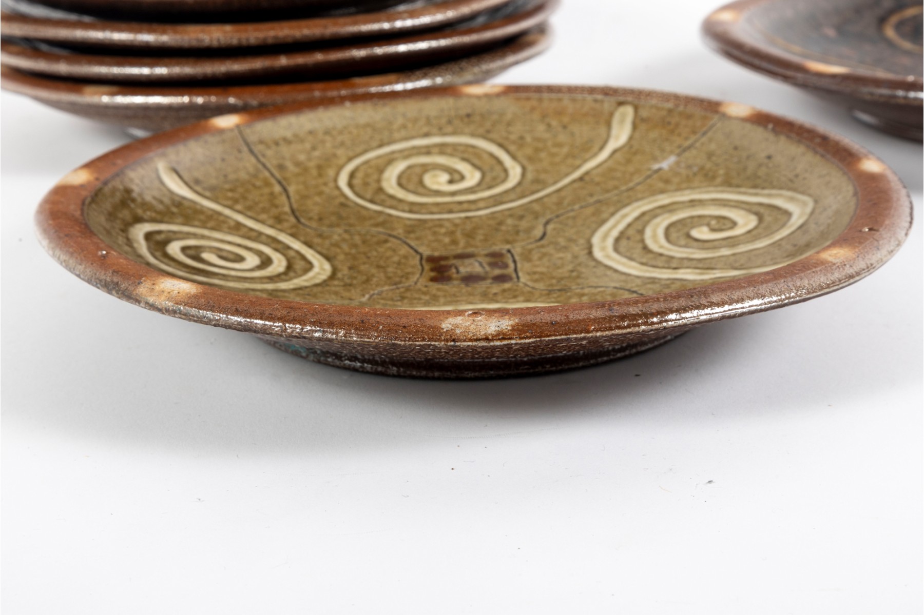 Salt glazed stoneware plates by Mark Hewitt emblazoned with spiral slip clay accents, all stamped on the underside with the potter's glyph and an incised number "77" representing the 77th firing.
