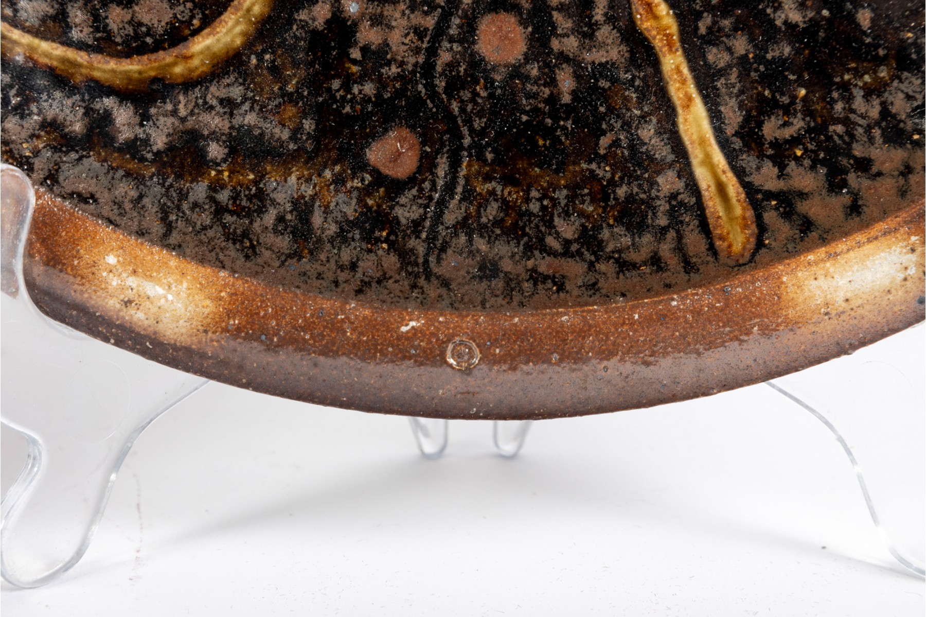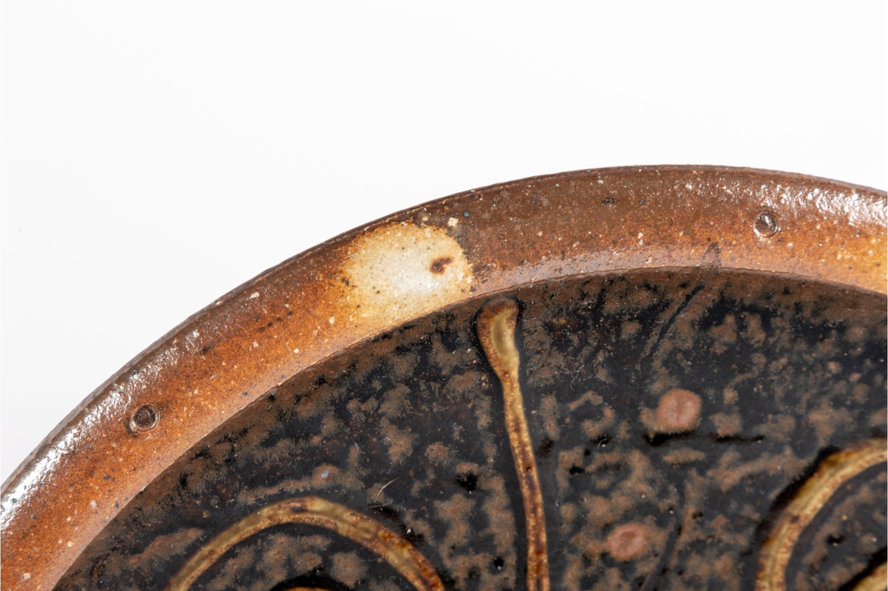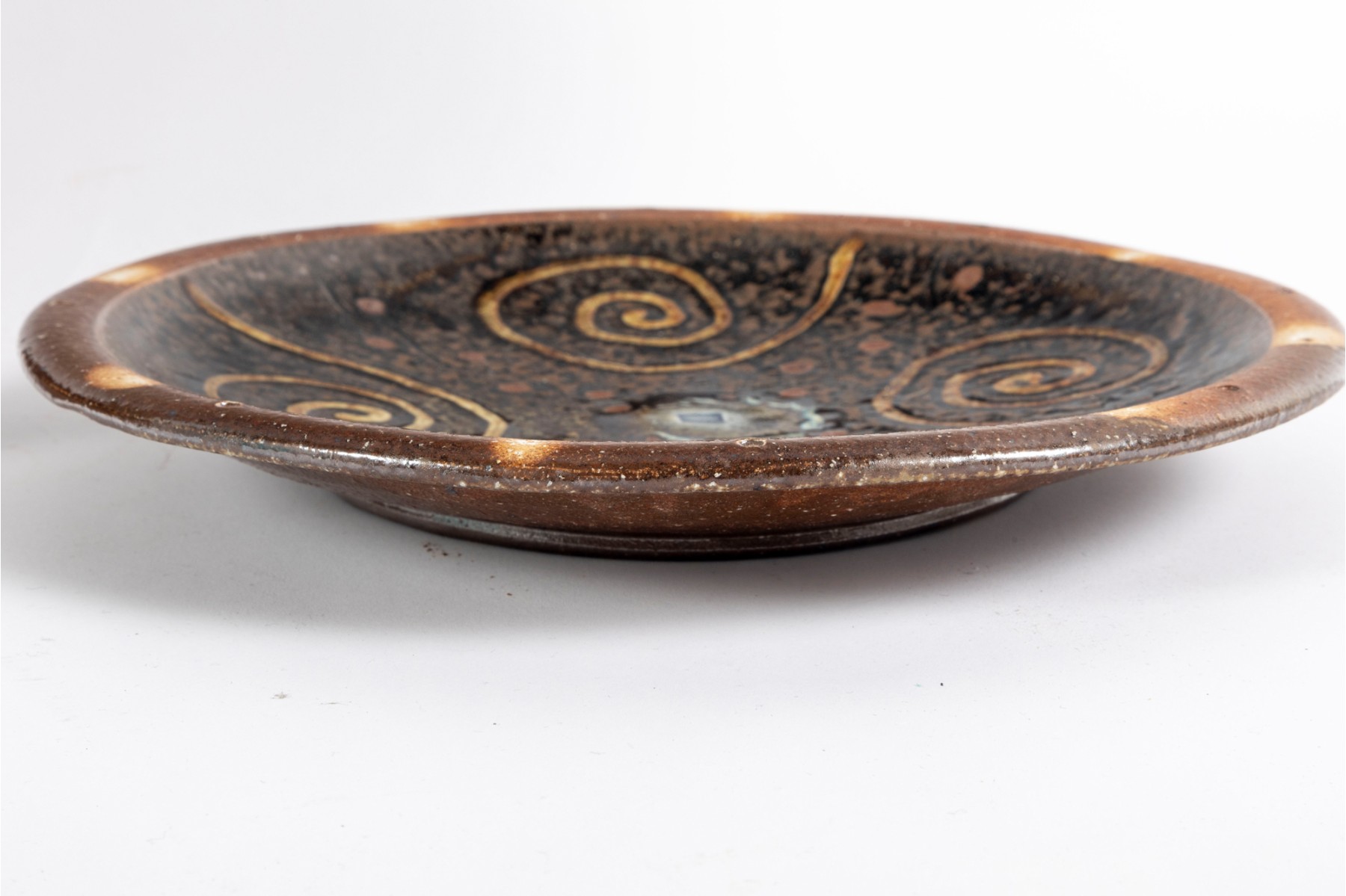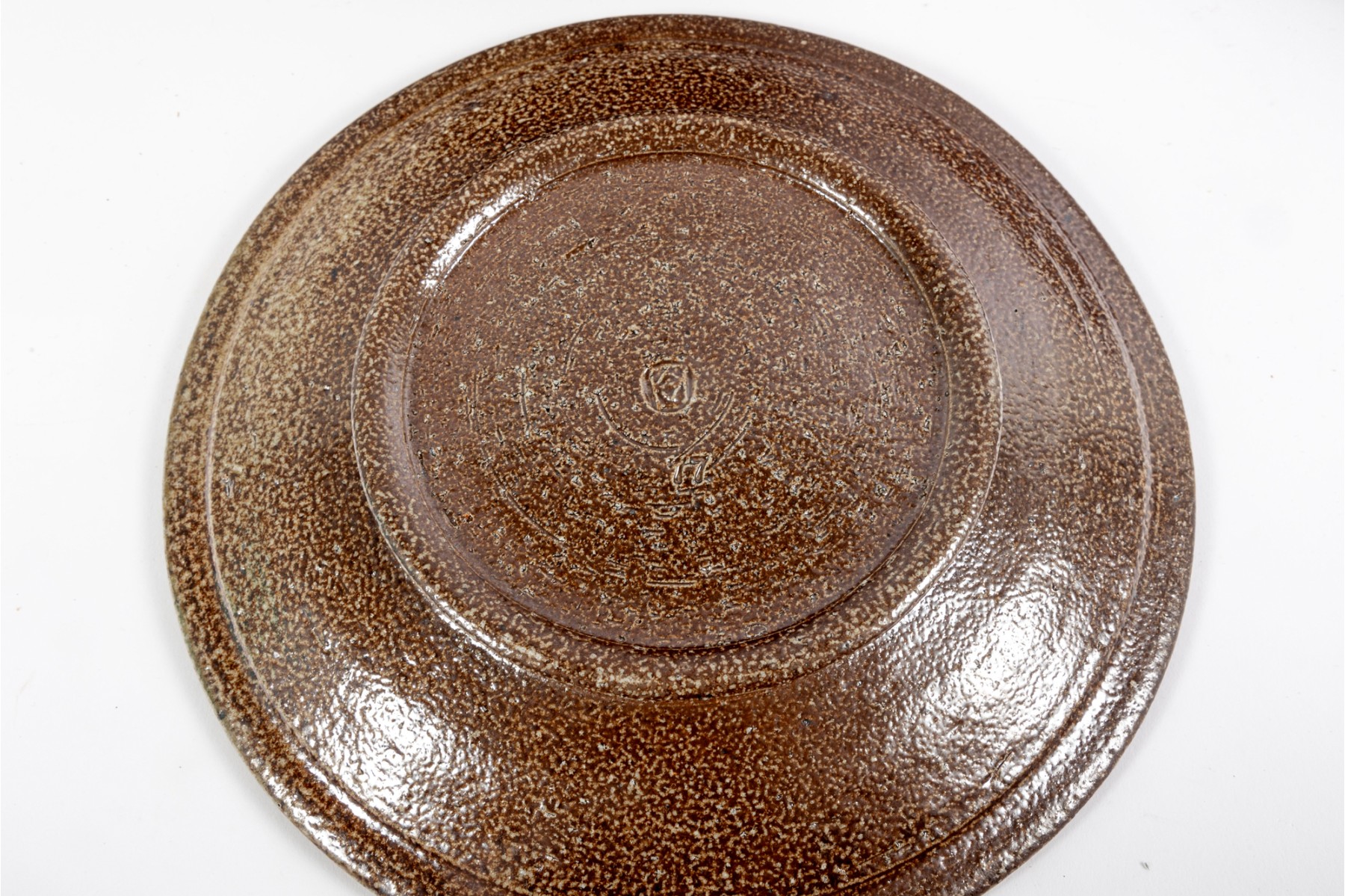 Salt glazed stoneware plates by Mark Hewitt emblazoned with spiral slip clay accents, all stamped on the underside with the potter's glyph and an incised number "77" representing the 77th firing.
