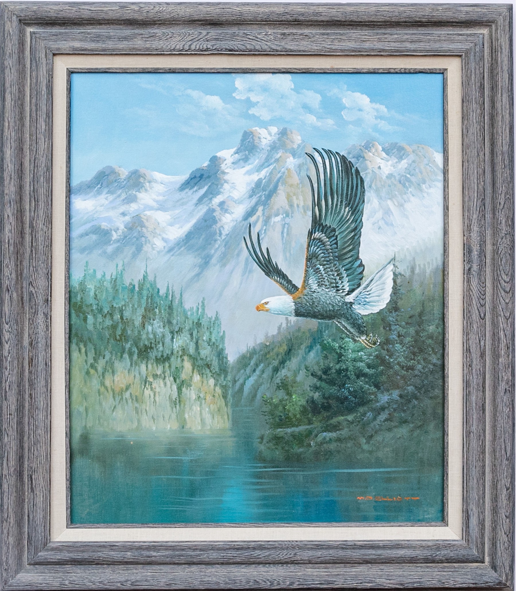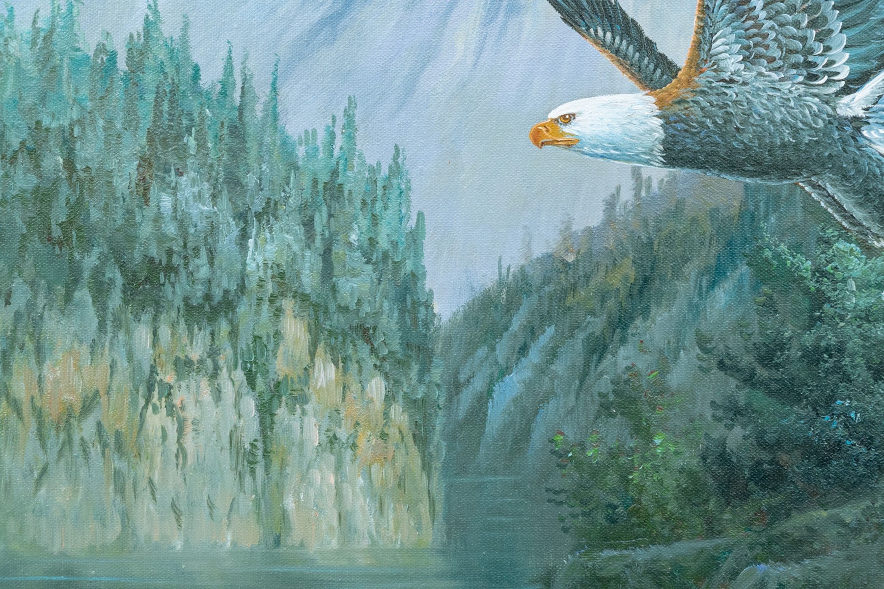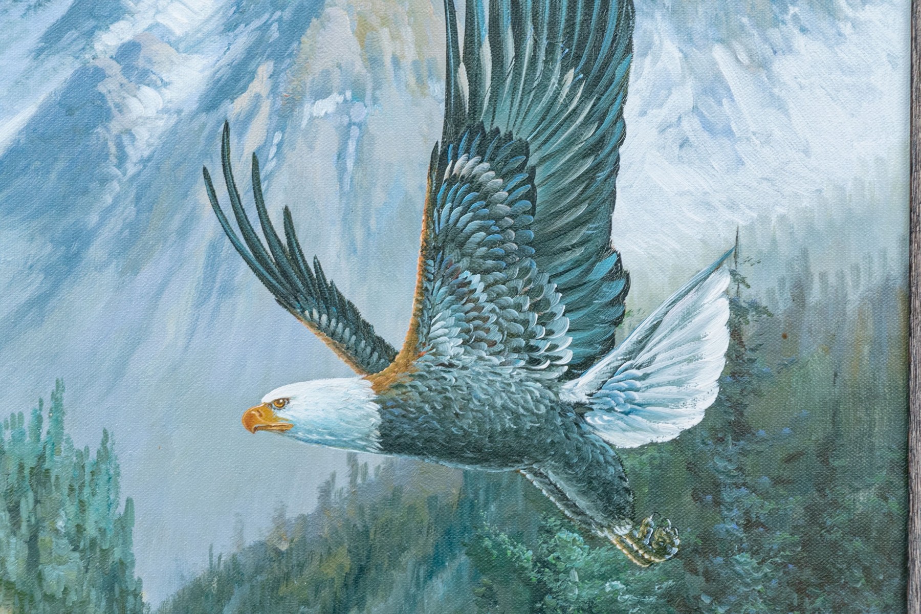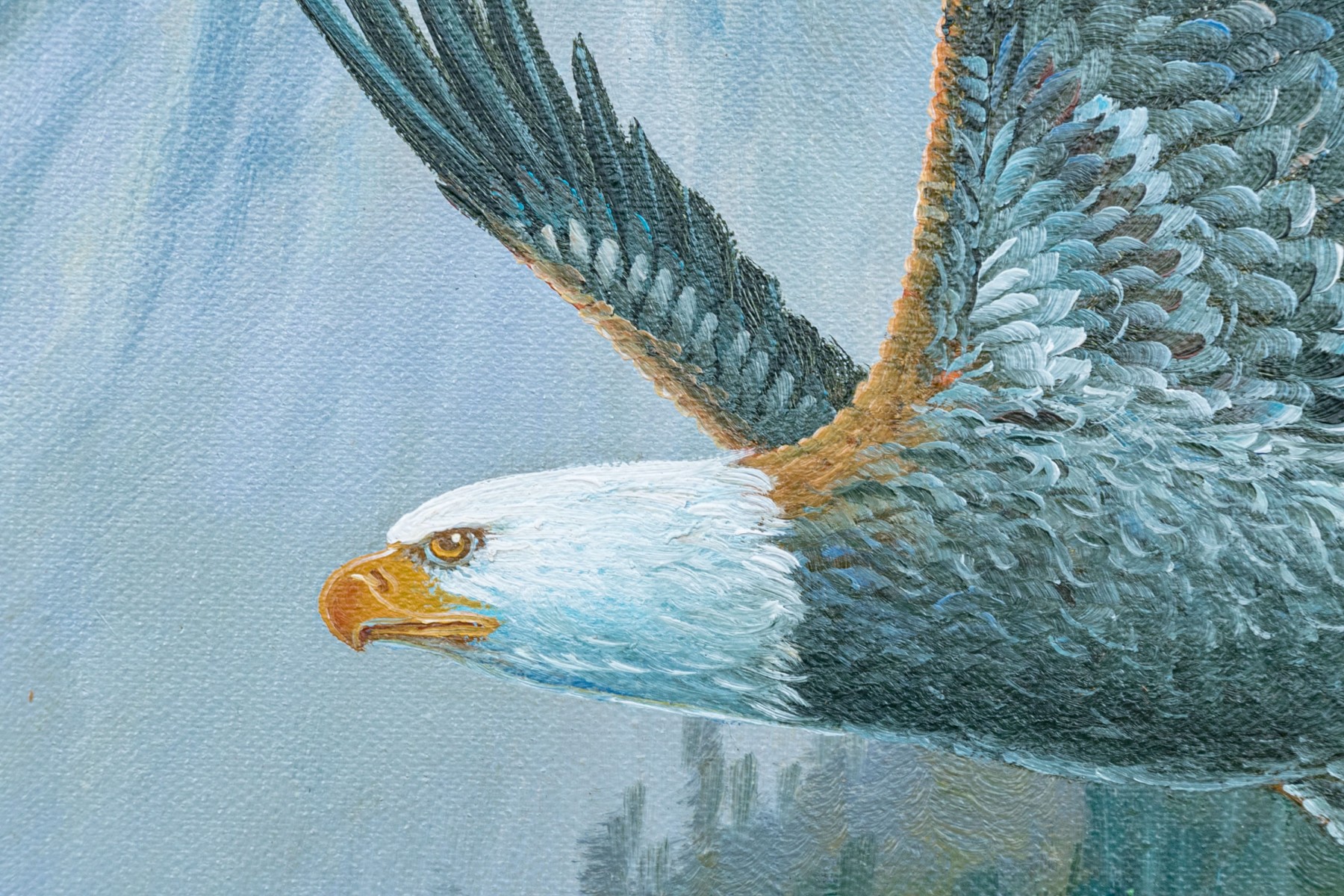 This is a truly patriotic painting depicting a fabulous eagle flying over calm waters with snow capped mountains in the background. The whole in a nice wooden and linen filet frame.