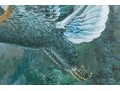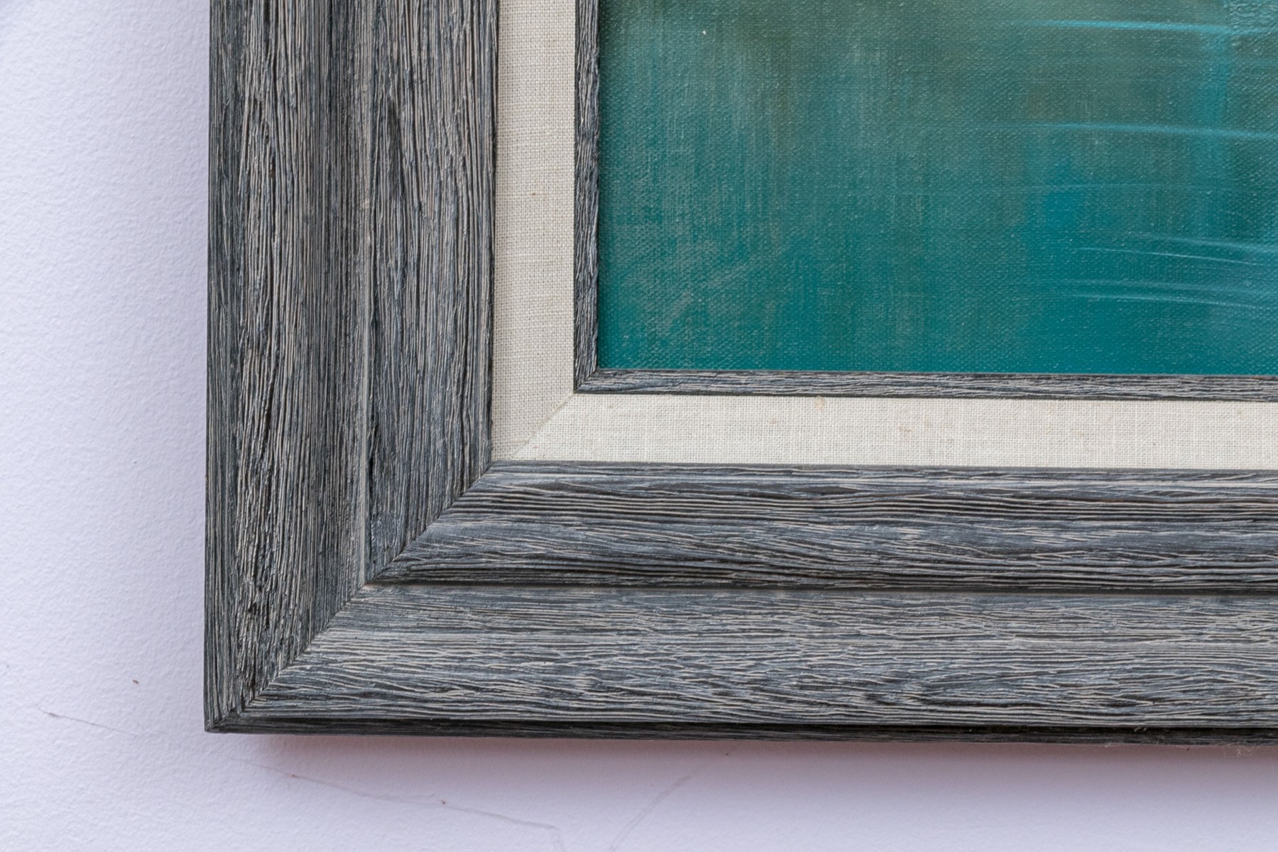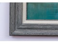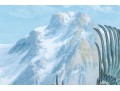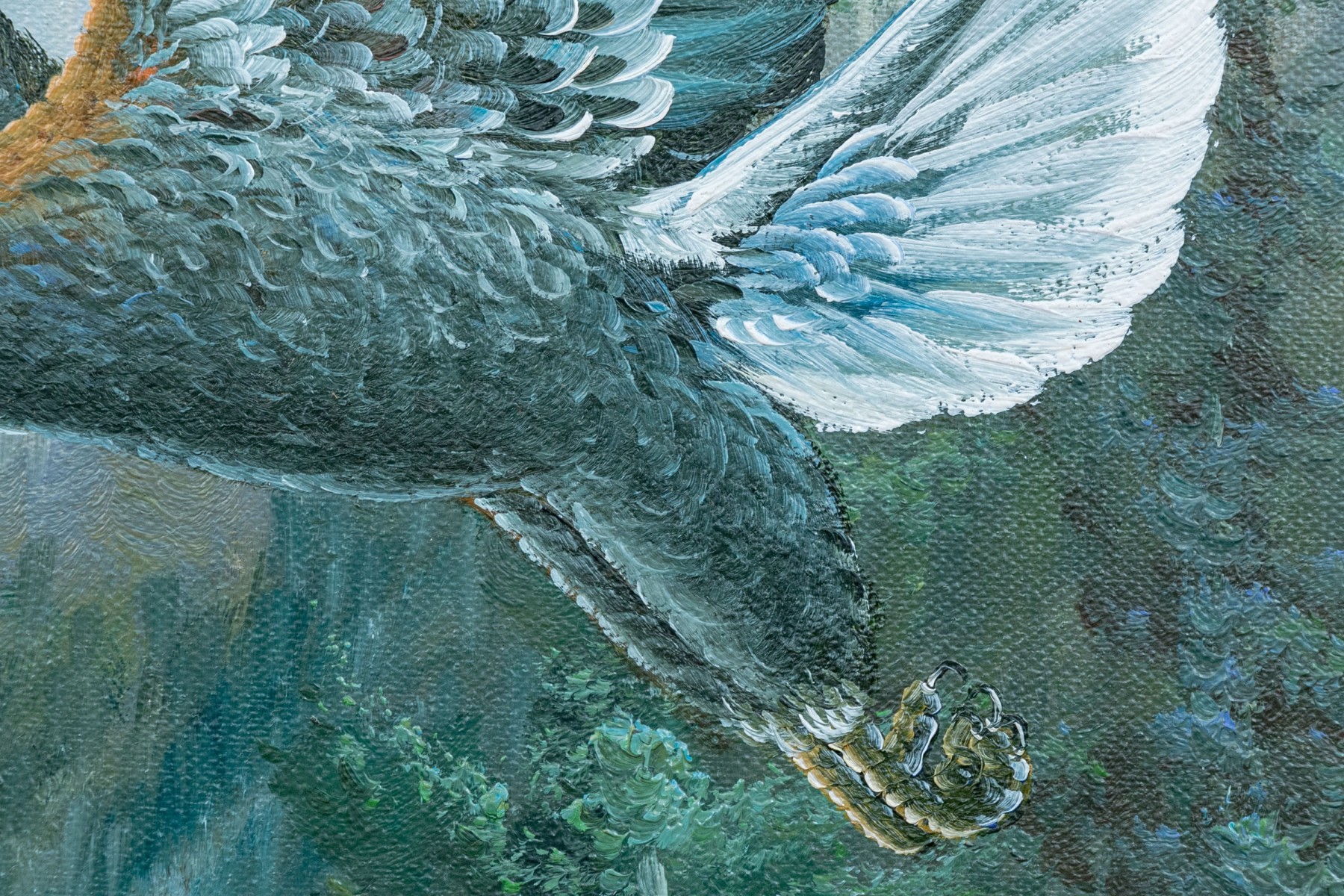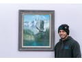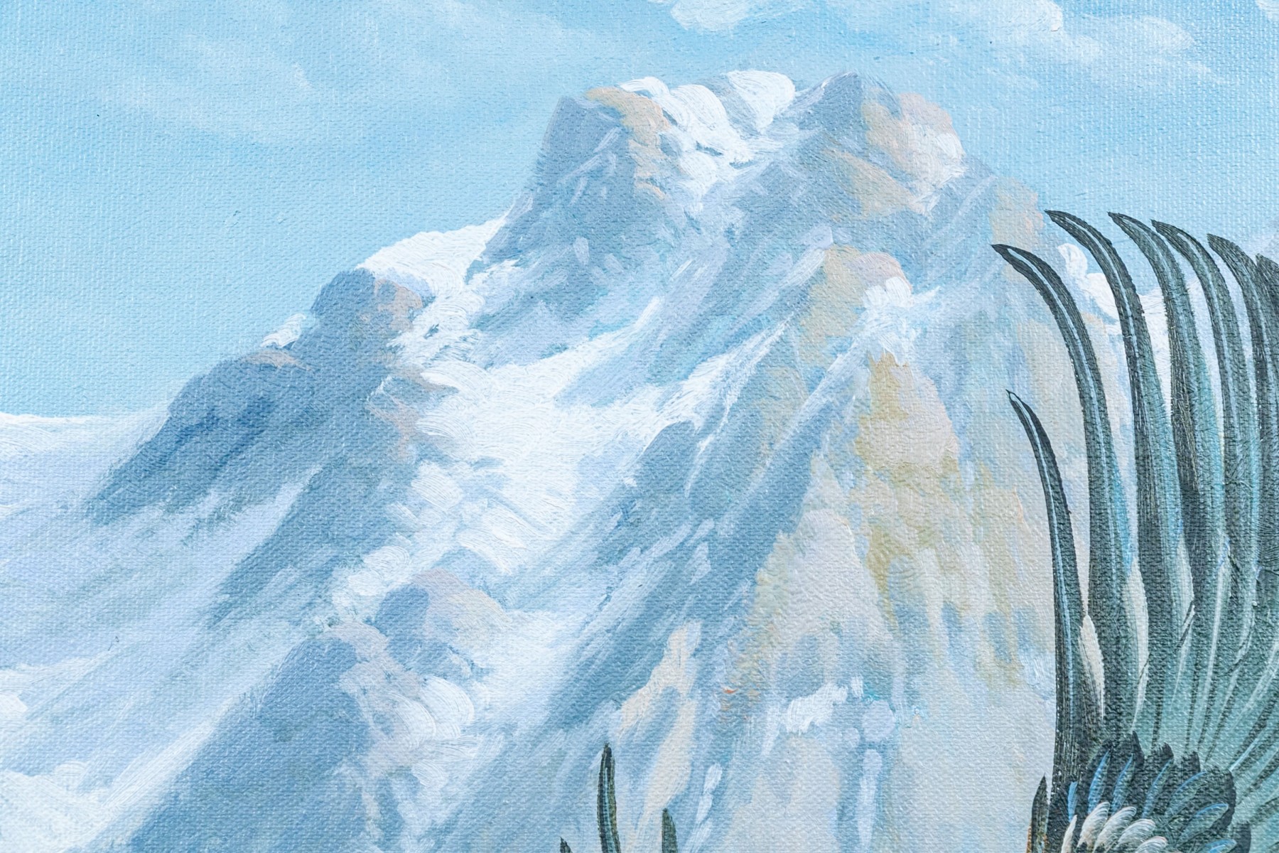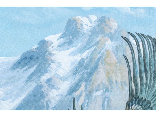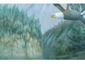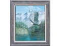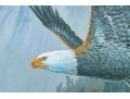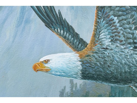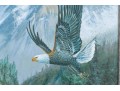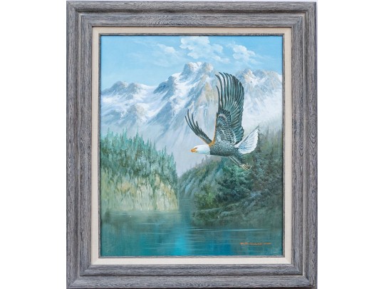 This is a truly patriotic painting depicting a fabulous eagle flying over calm waters with snow capped mountains in the background. The whole in a nice wooden and linen filet frame.