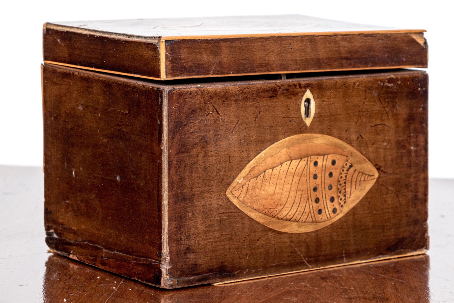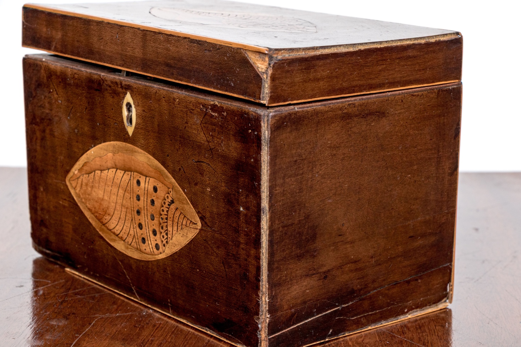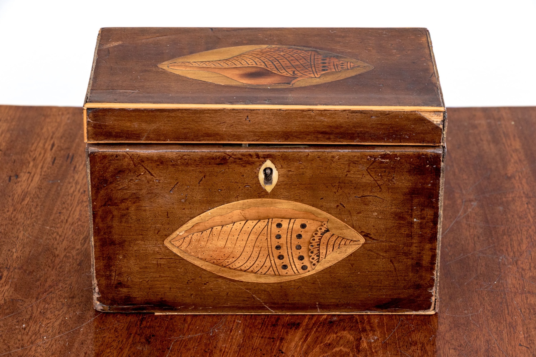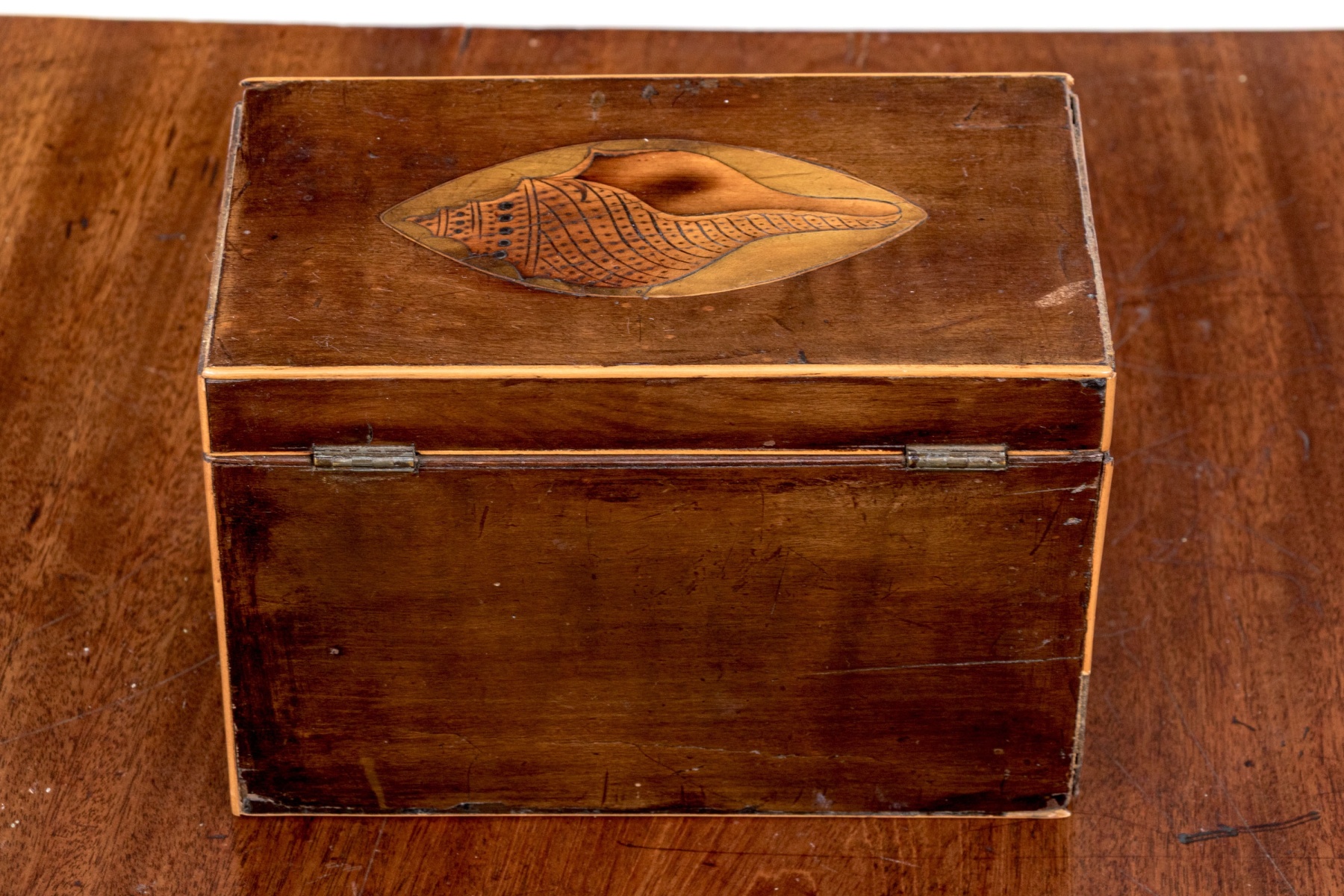 A delightful antique tea caddy in traditional style, showcasing a rectangular form veneered in warm-toned medium brown wood. Lighter orange-brown inlaid trims around the edges add a nice pop of contrast, complimenting navette marquetry medallions of seashells on the lid and center front. The hinged lid opens to two compartments within.