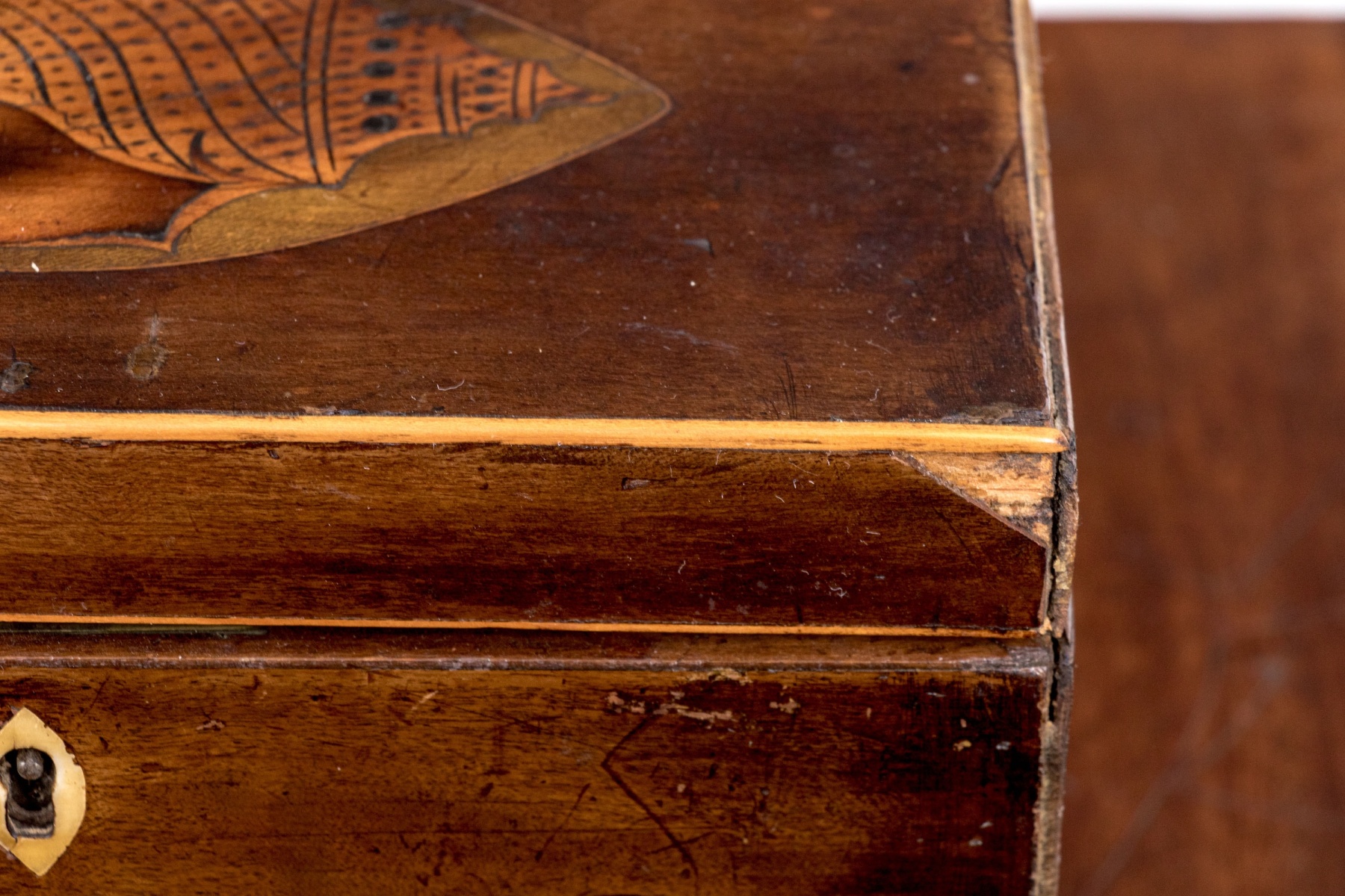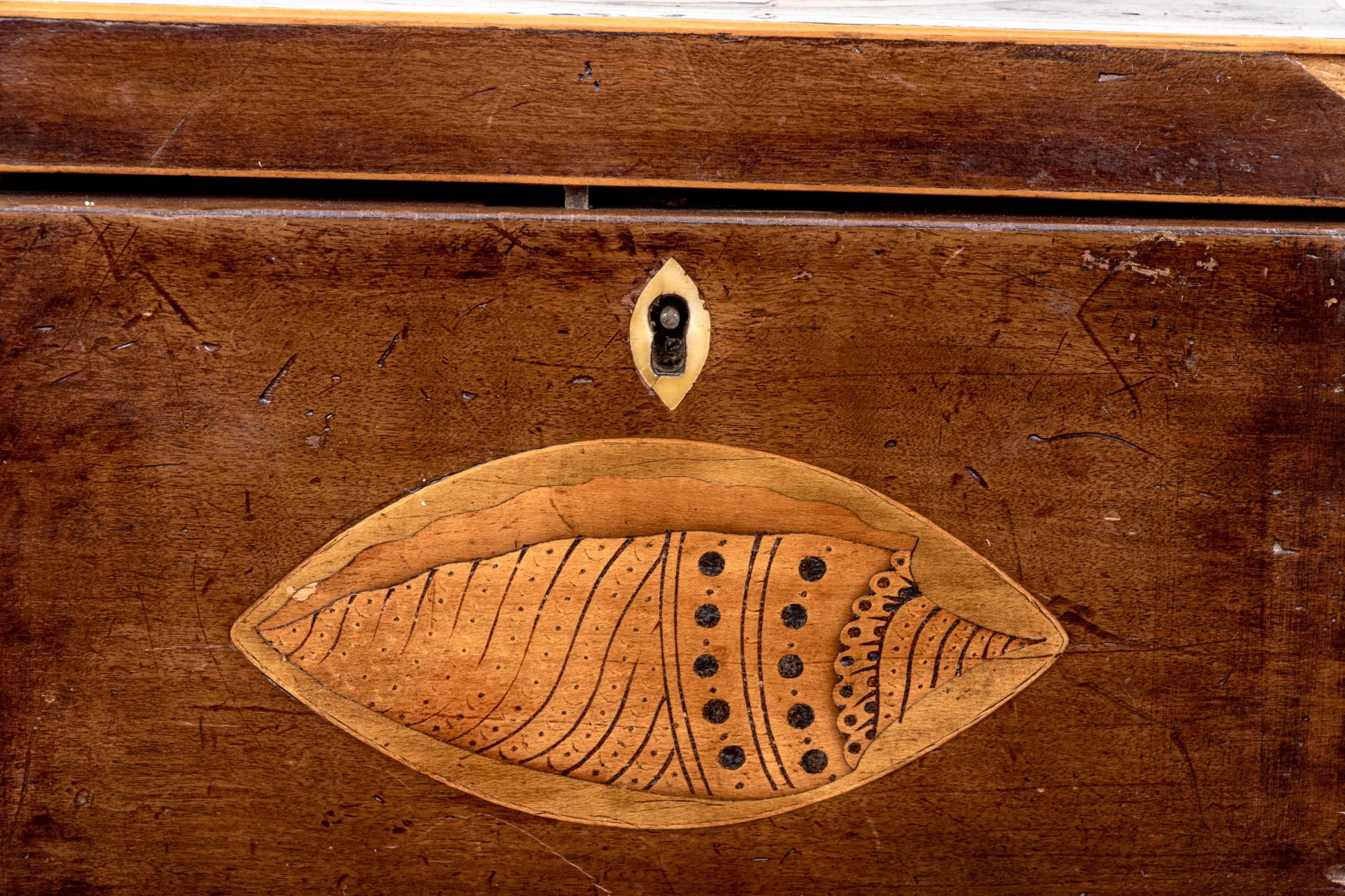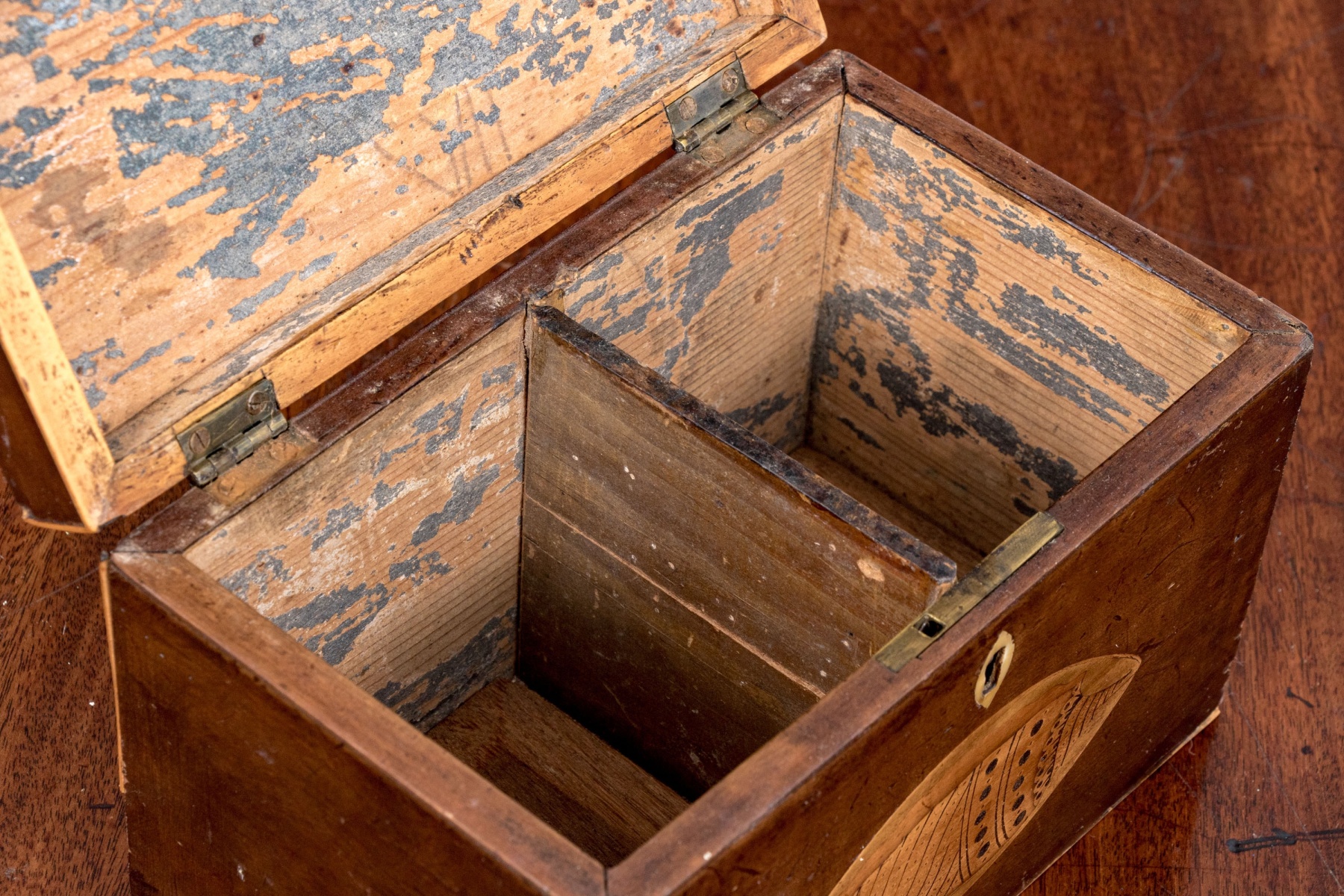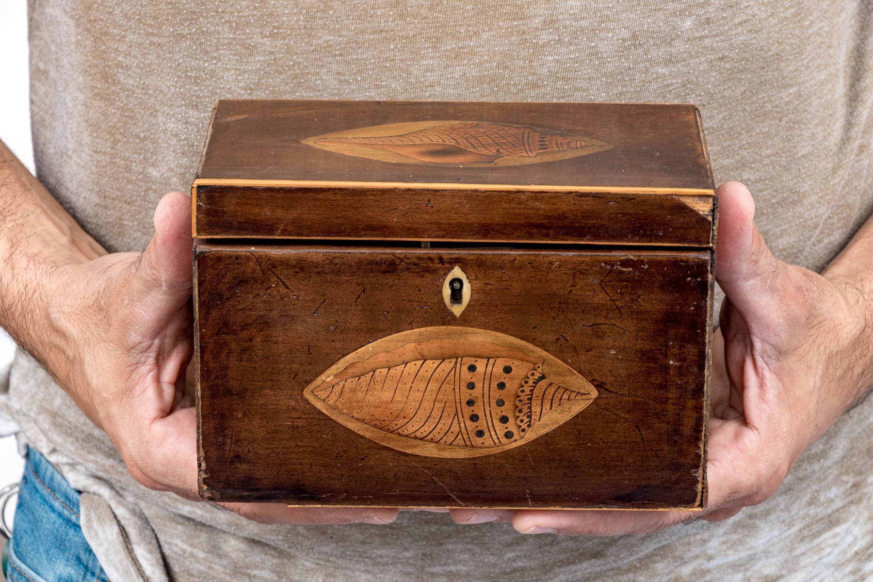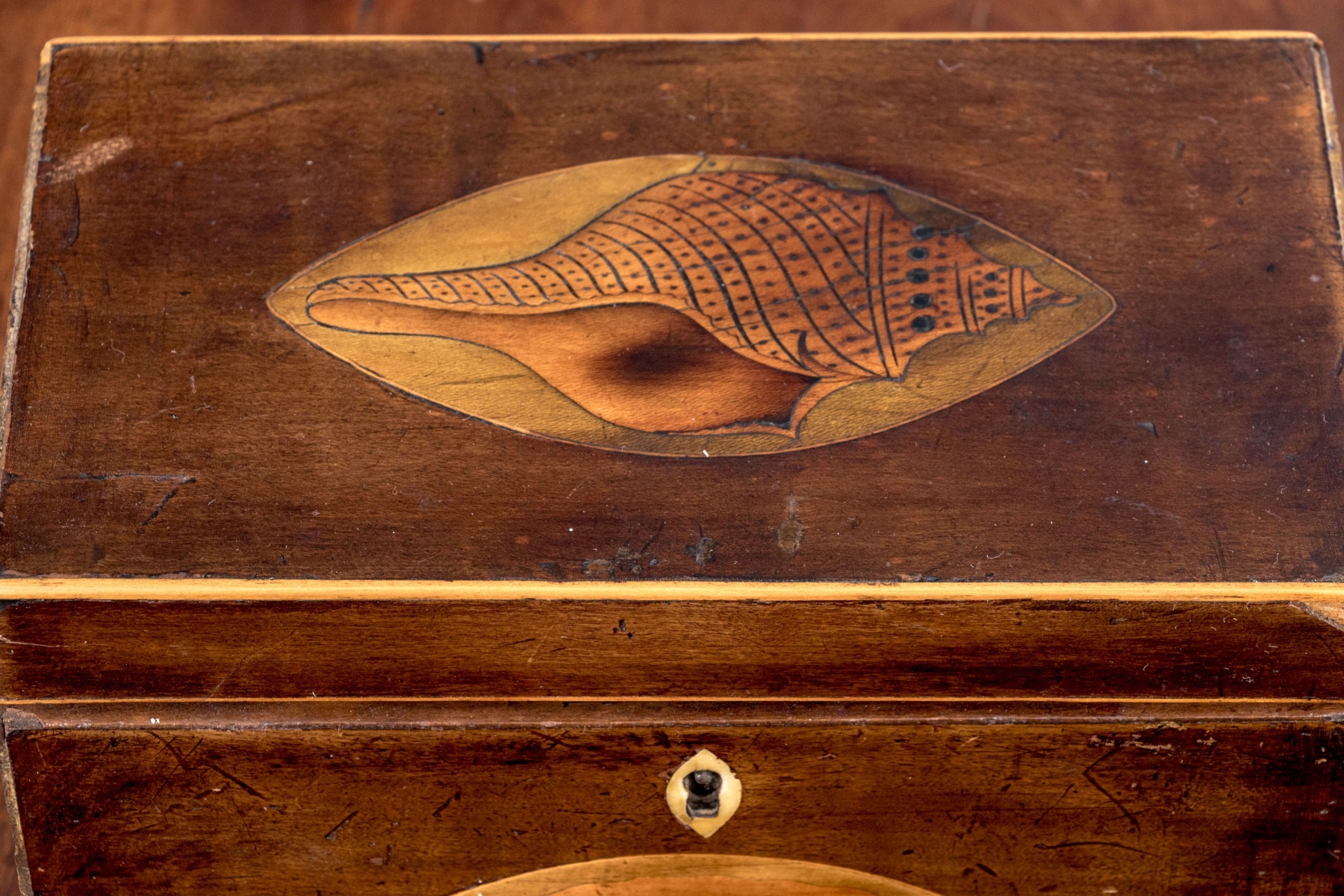A delightful antique tea caddy in traditional style, showcasing a rectangular form veneered in warm-toned medium brown wood. Lighter orange-brown inlaid trims around the edges add a nice pop of contrast, complimenting navette marquetry medallions of seashells on the lid and center front. The hinged lid opens to two compartments within.