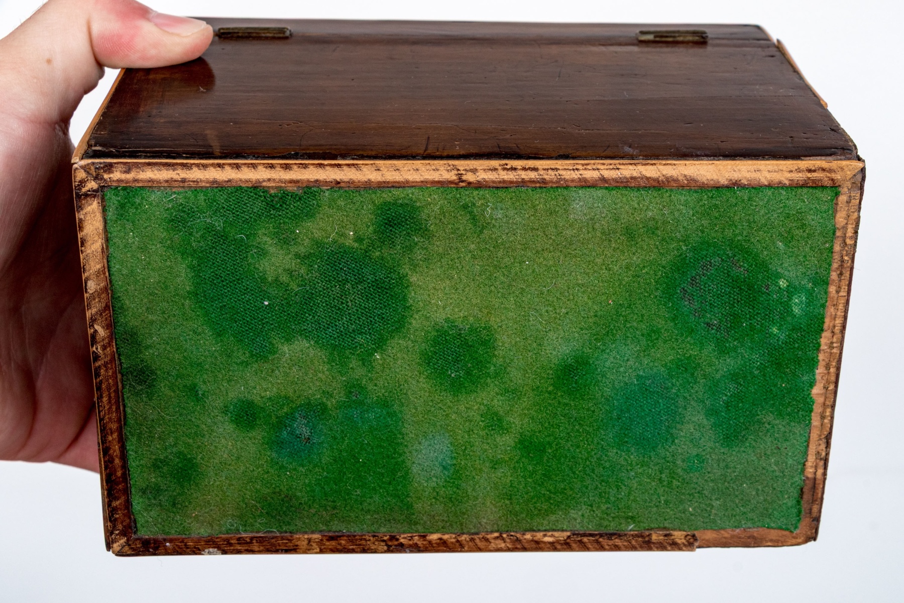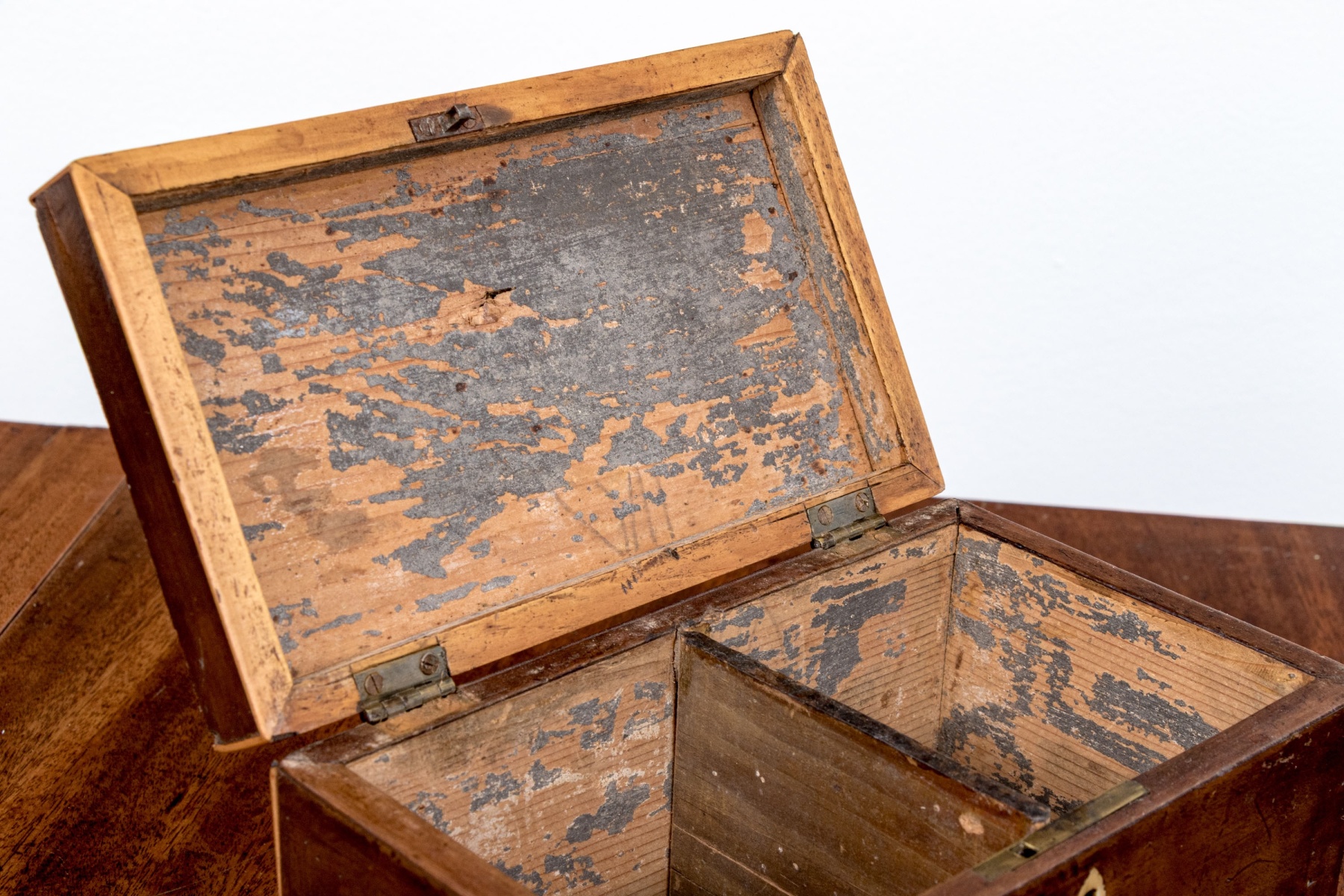 Does not include a key. A chip to the trim of one interior lid and losses to the body veneer along the trims, most noticeably to the lower left body. Interior lids fall in as the compartments are missing supports to keep the lids lifted. Despite wear still a very handsome piece.