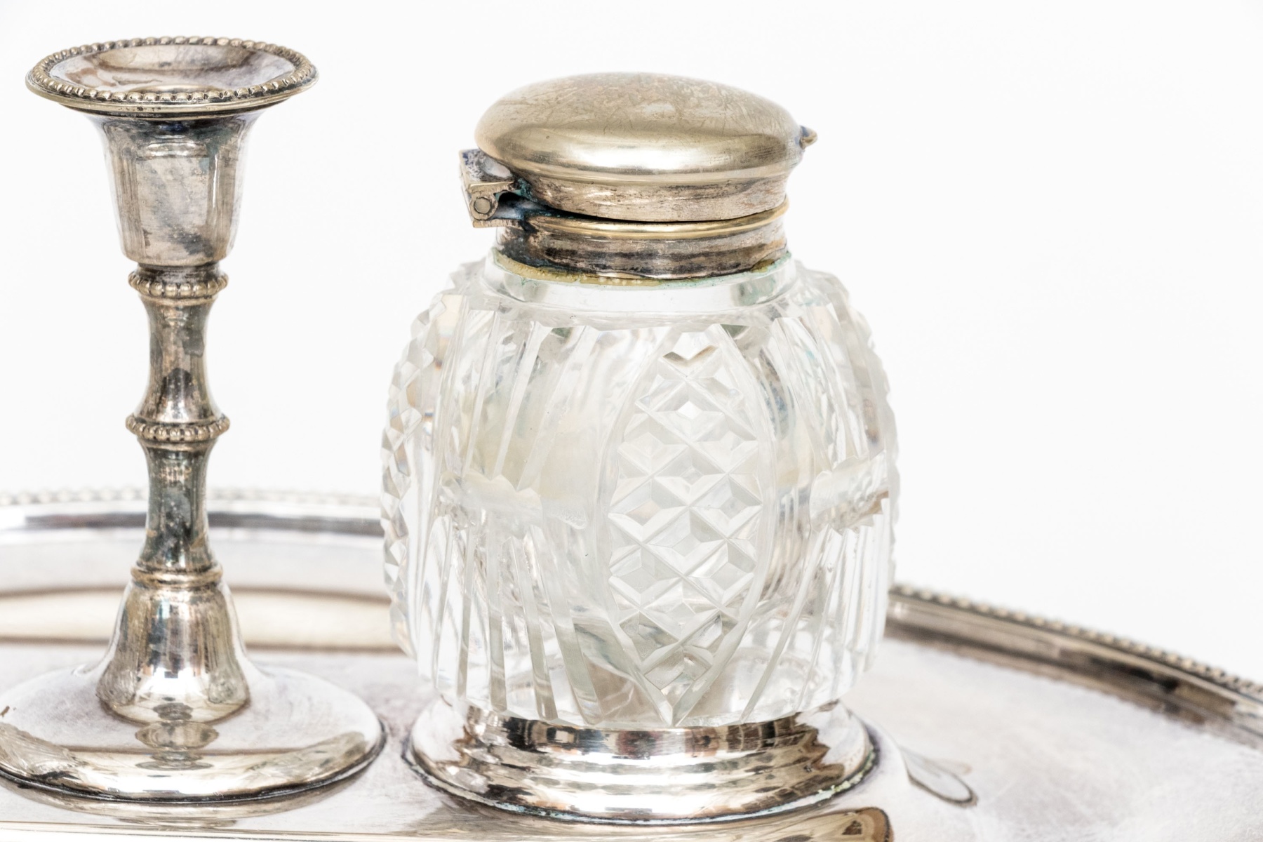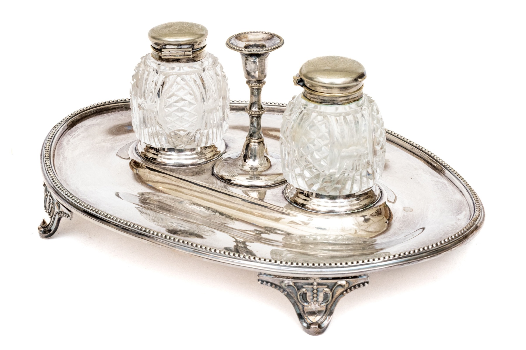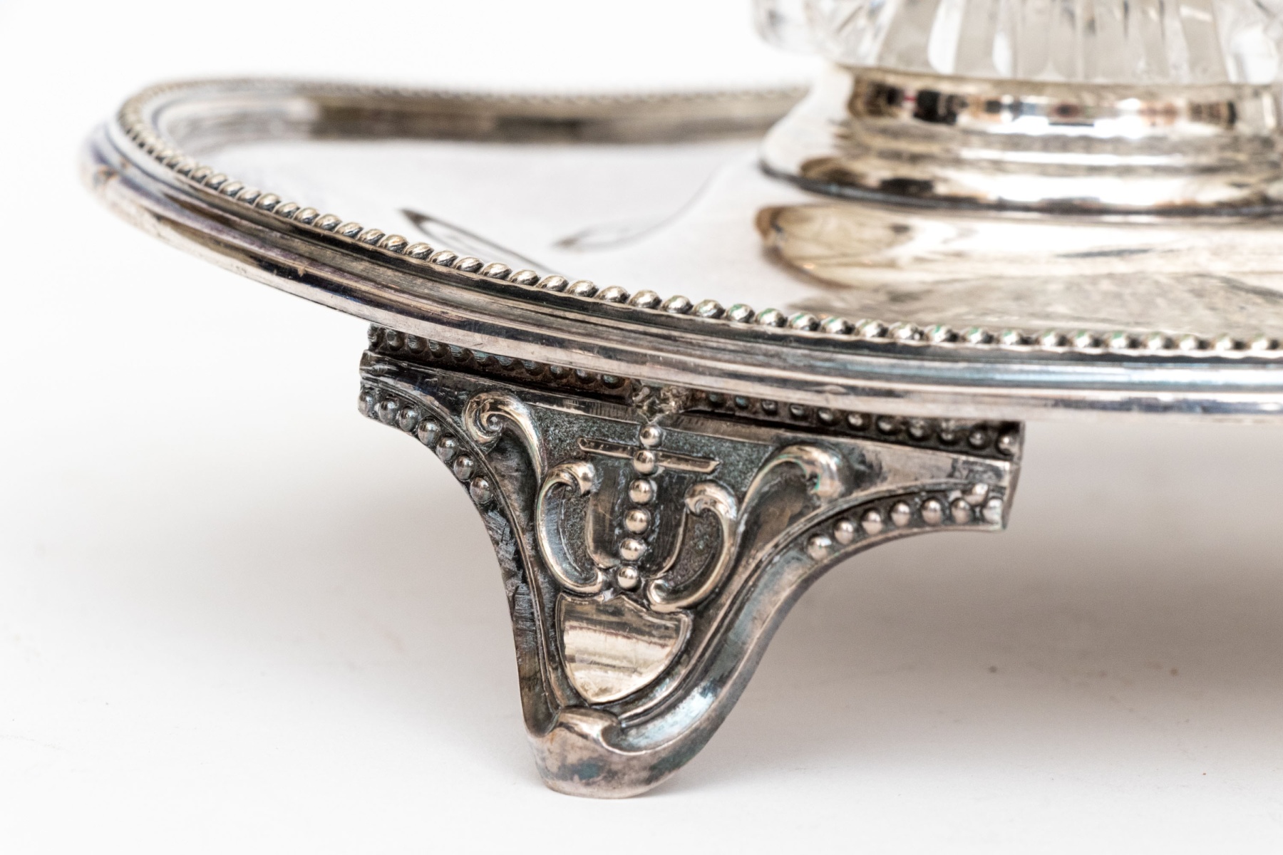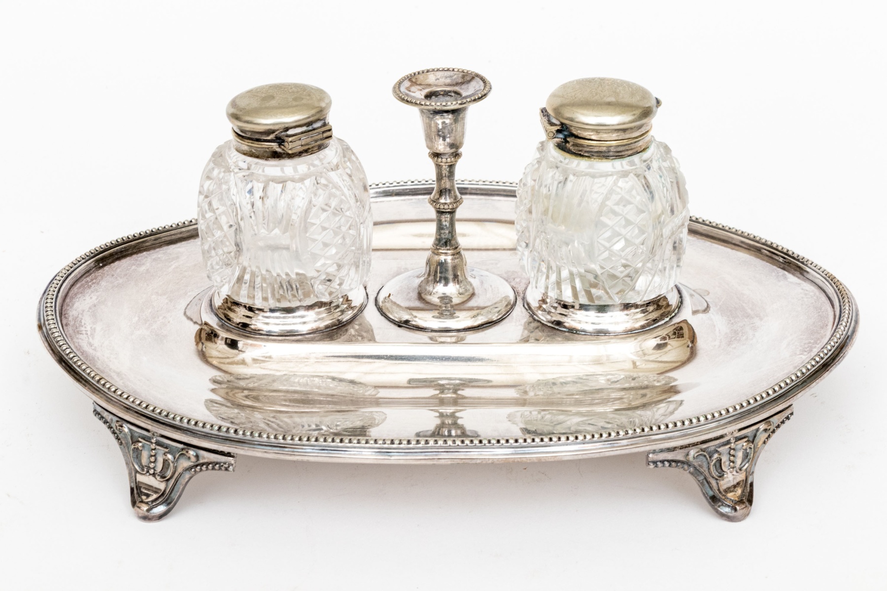 A fabulous Martin, Hall & Co. silver plated desk caddy showcasing two cut crystal lidded bottles and a diminutive candlestick at the center of an oval tray with a beaded rim. The tray is raised on four triangular feet with stately, decorative relief. Marked underfoot.