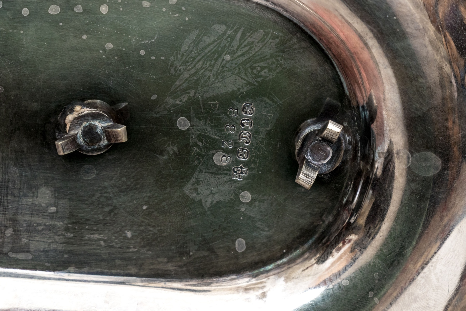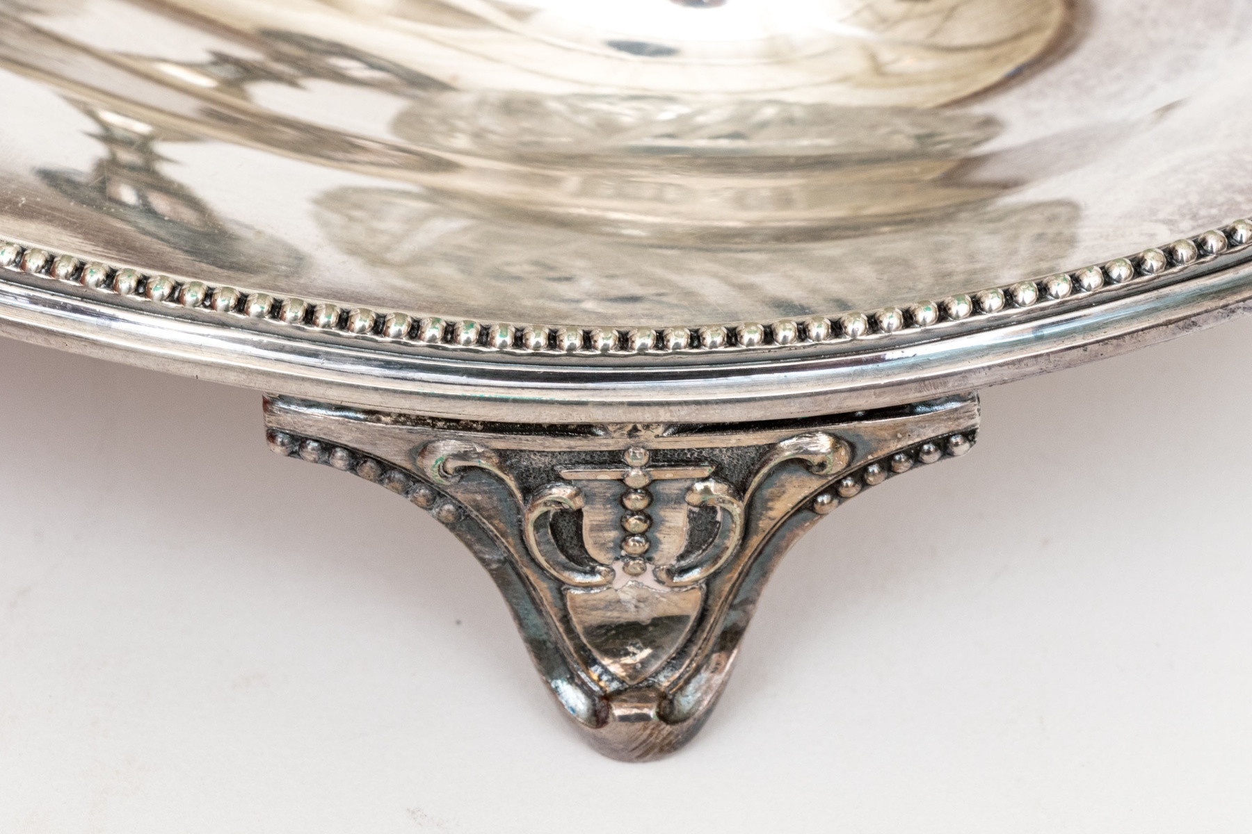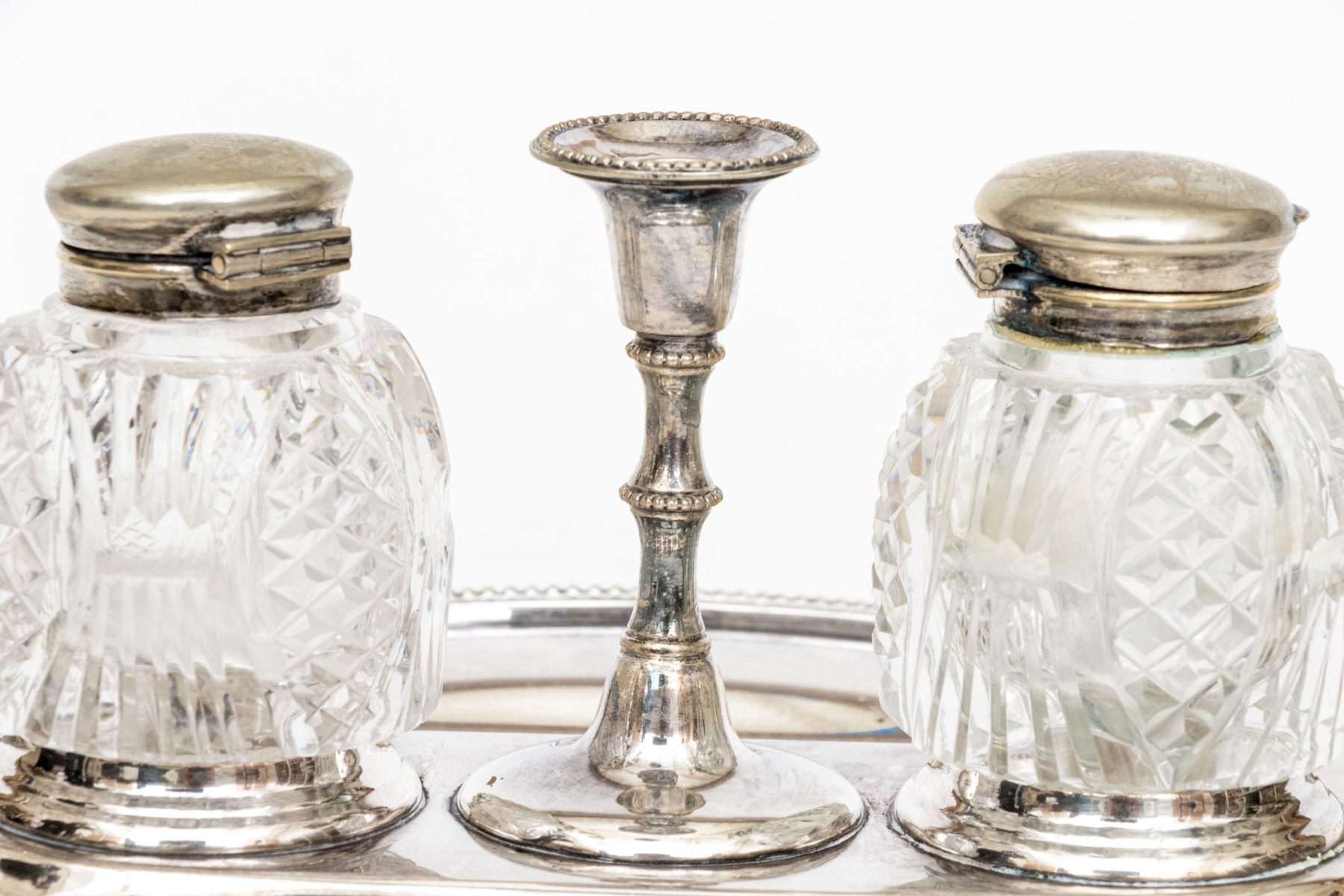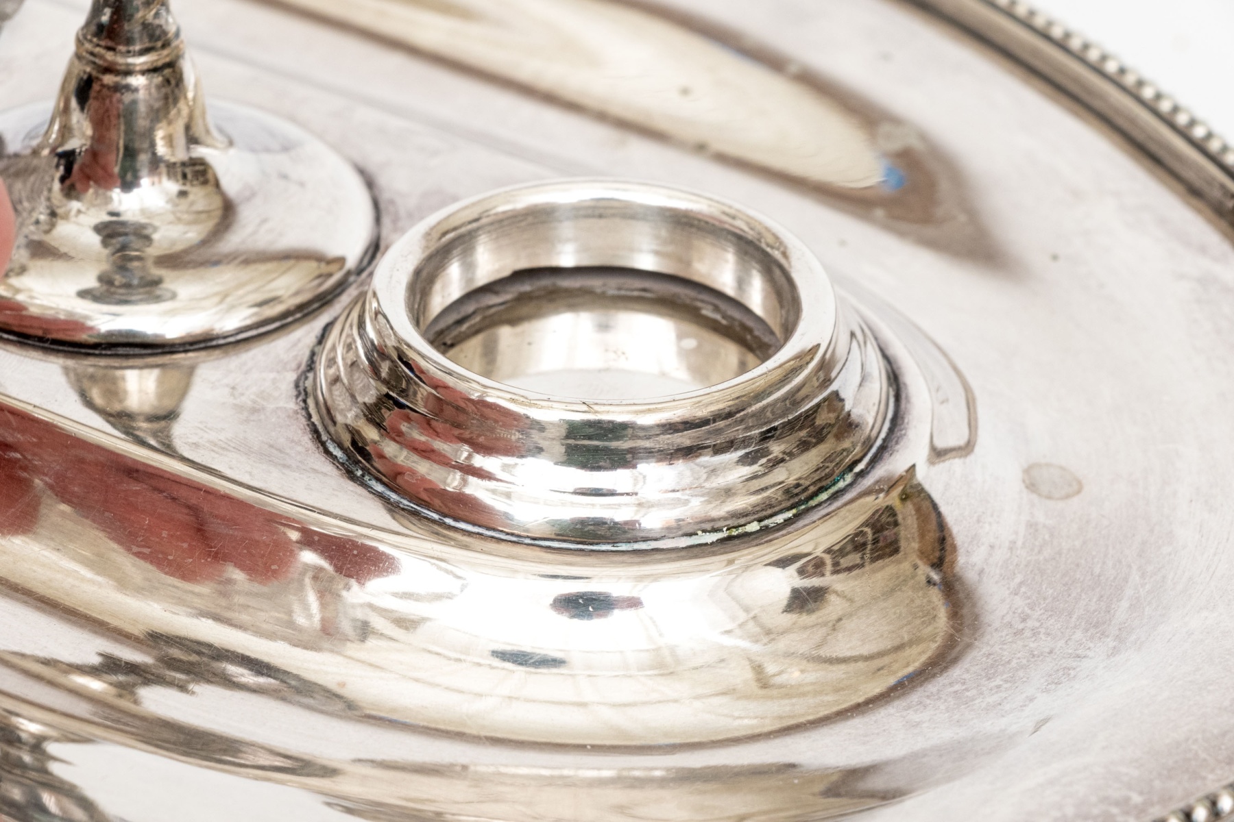 A fabulous Martin, Hall & Co. silver plated desk caddy showcasing two cut crystal lidded bottles and a diminutive candlestick at the center of an oval tray with a beaded rim. The tray is raised on four triangular feet with stately, decorative relief. Marked underfoot.