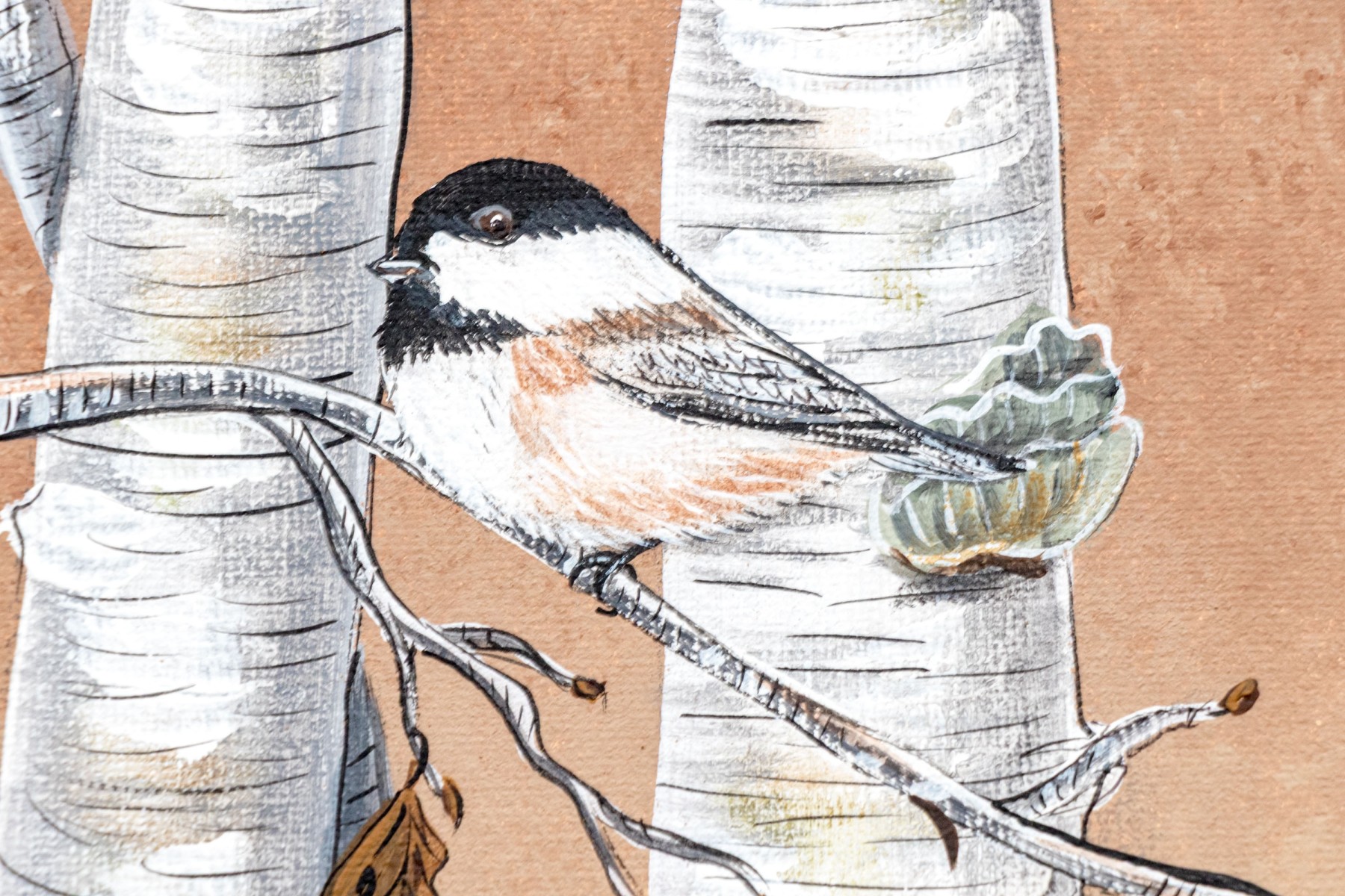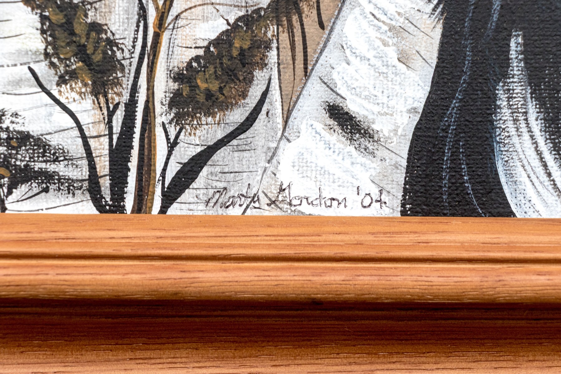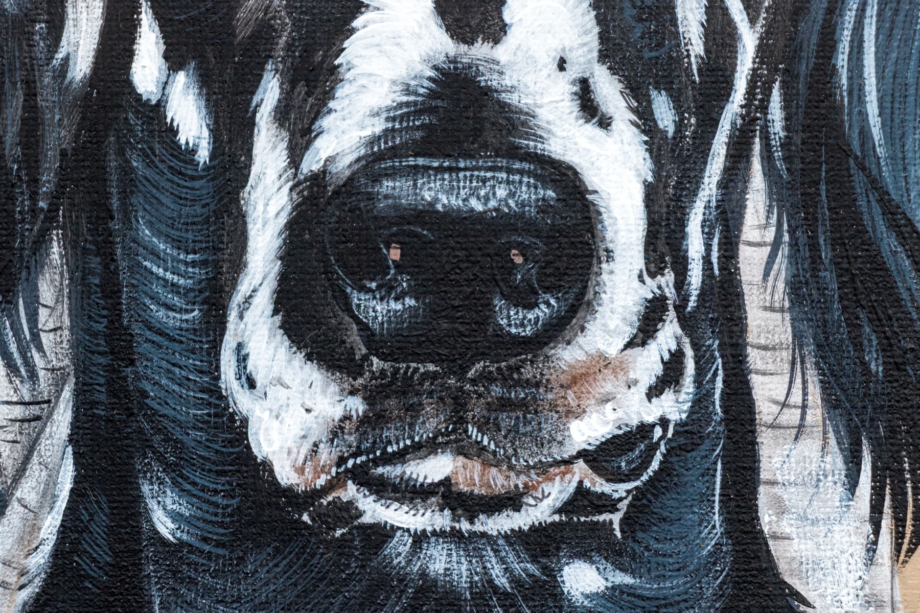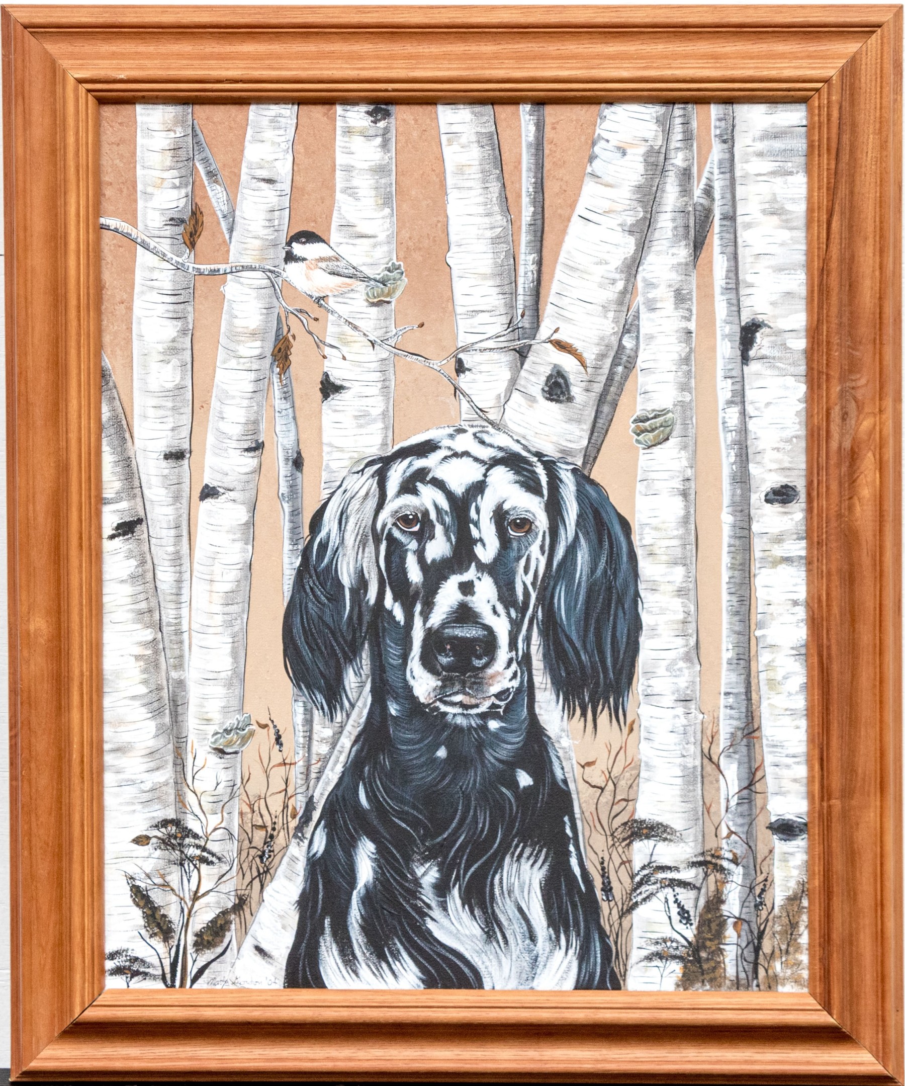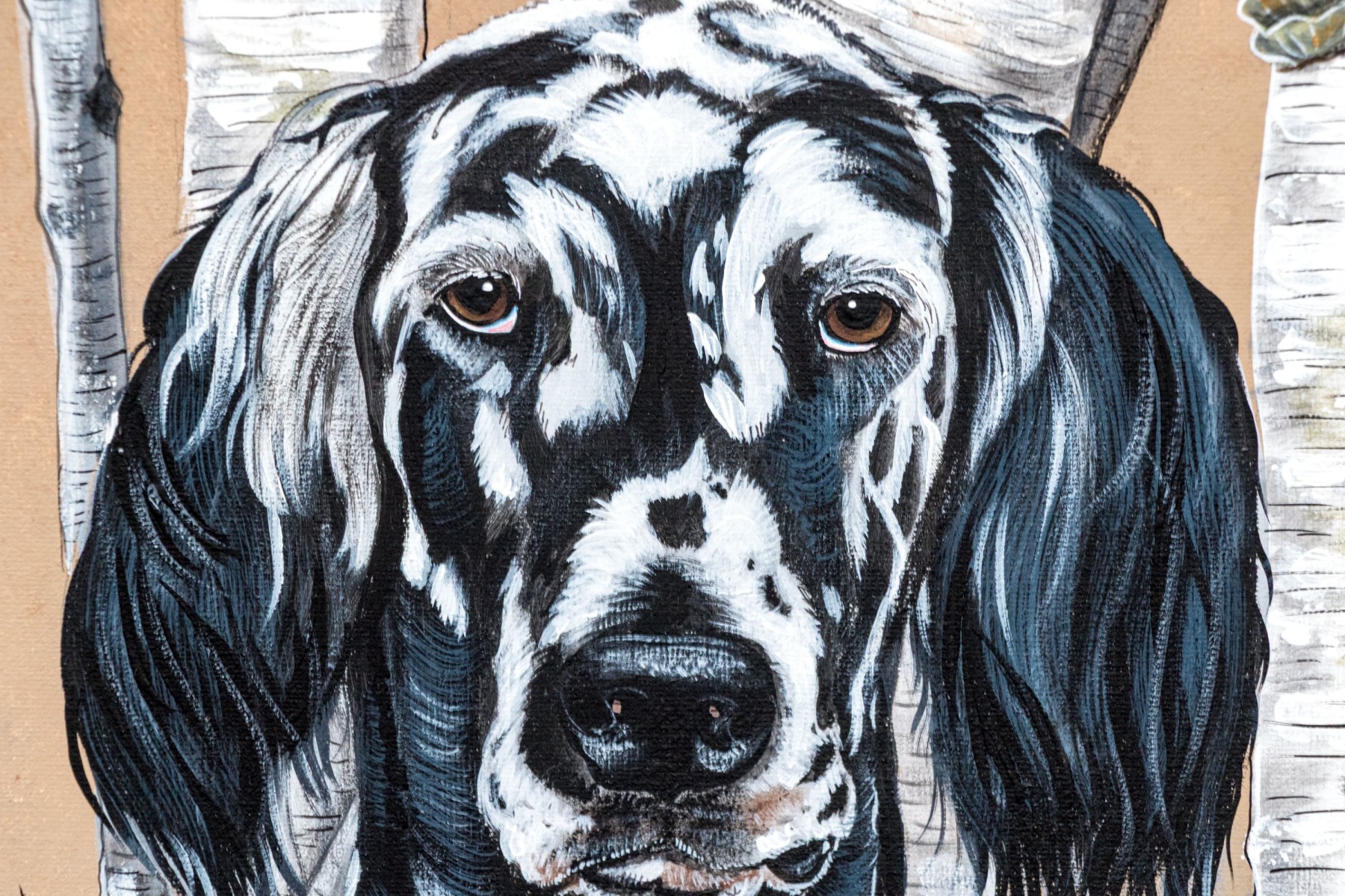 Martha "Marty" Hoadley Gordon (American [CT], 1947-2018) acrylic painting on canvas depicting a portrait of a captivating Setter dog facing forward with high contrast black and white fur echoing birch trees in the background. A plump chickadee perches on one branch overhead against a peachy sky adding a great pop of color. Signed Marty Gordon and dated '04 lower left.