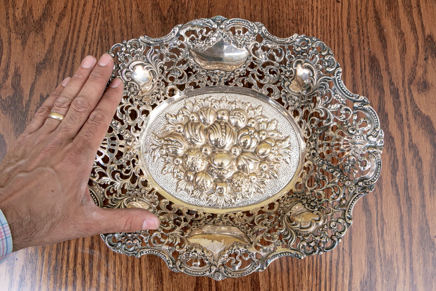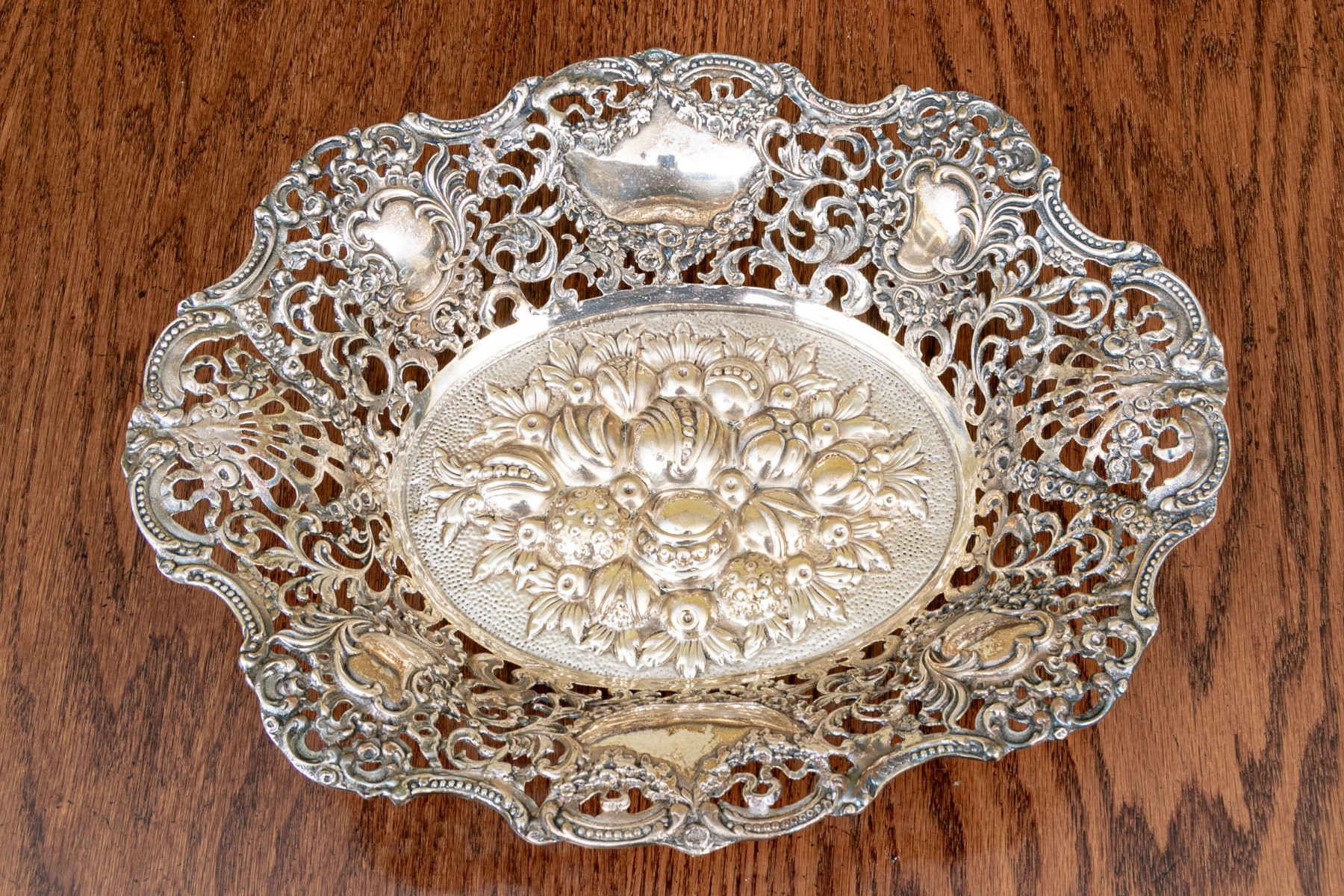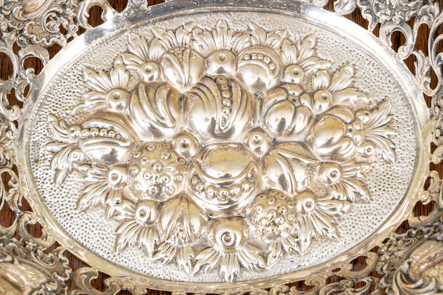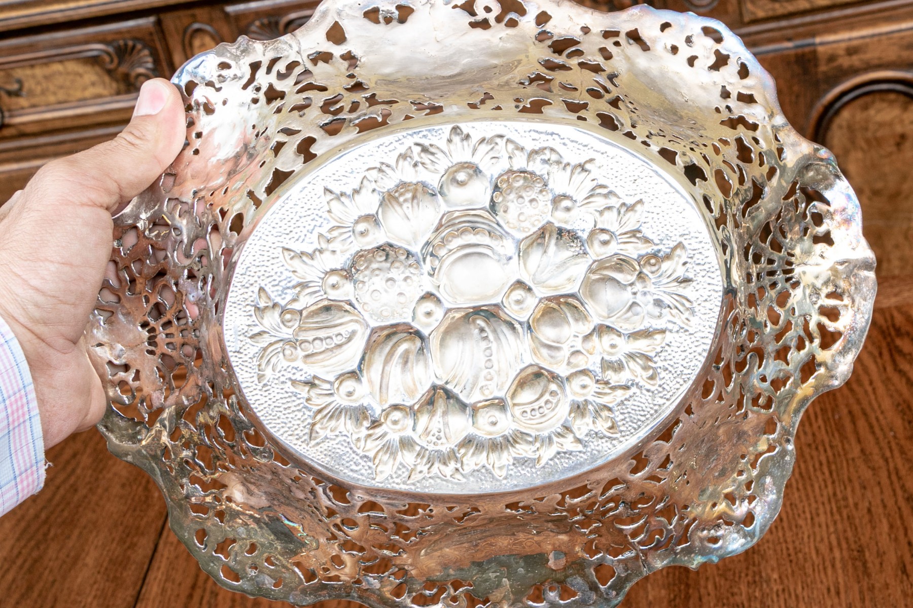 A marvelous 800 grade silver centerpiece bowl. Decorated with an oval interior featuring repousse pomegranate motif on a dimpled, textural ground. The flared walls with fabulous openwork scrolls and foliate swags. A beaded, shaped oval trim.