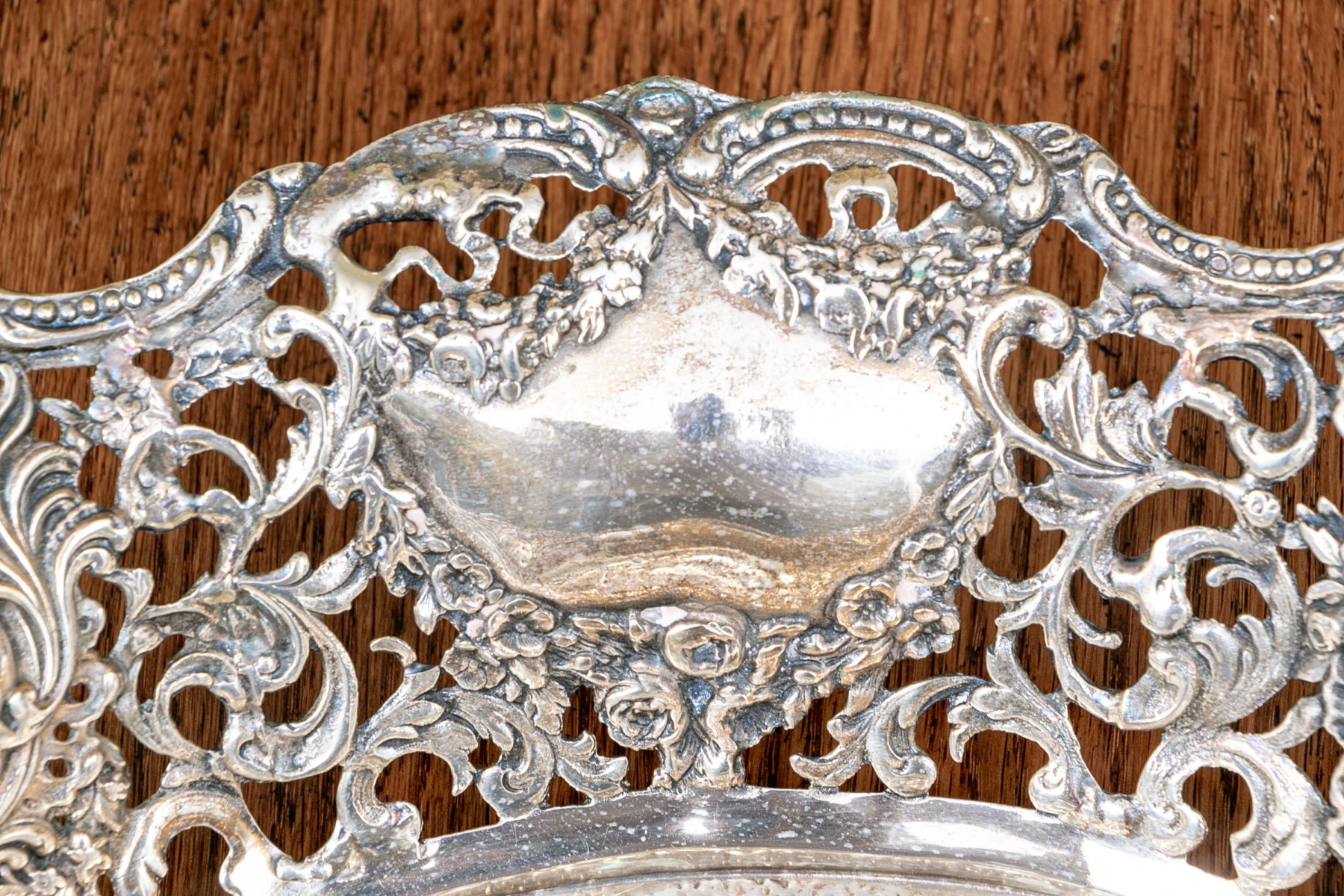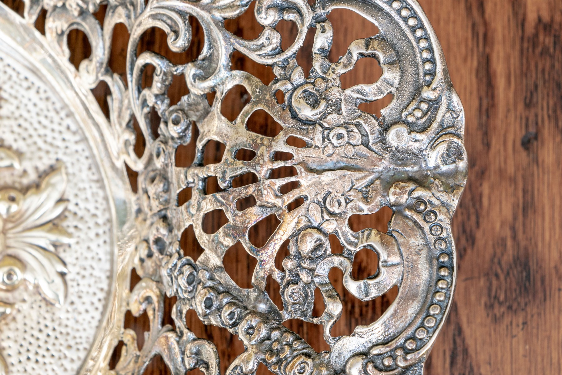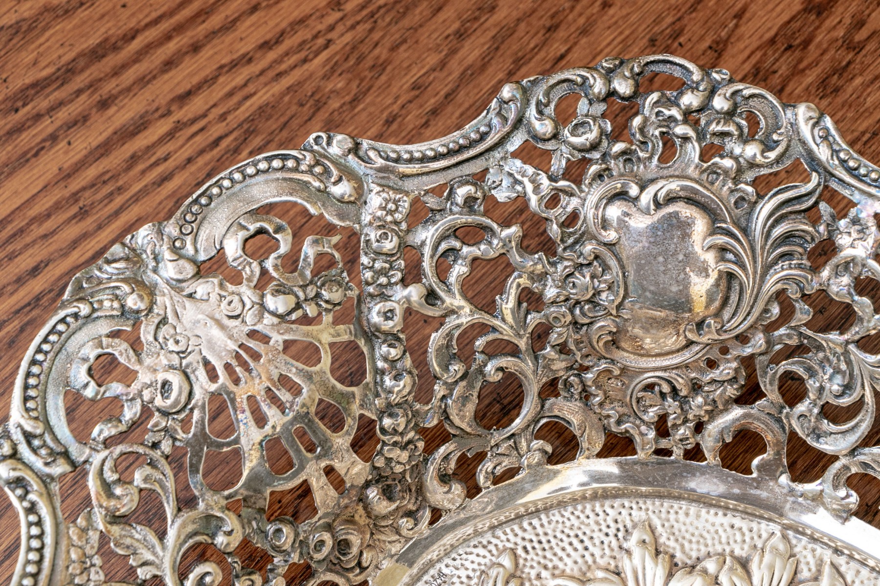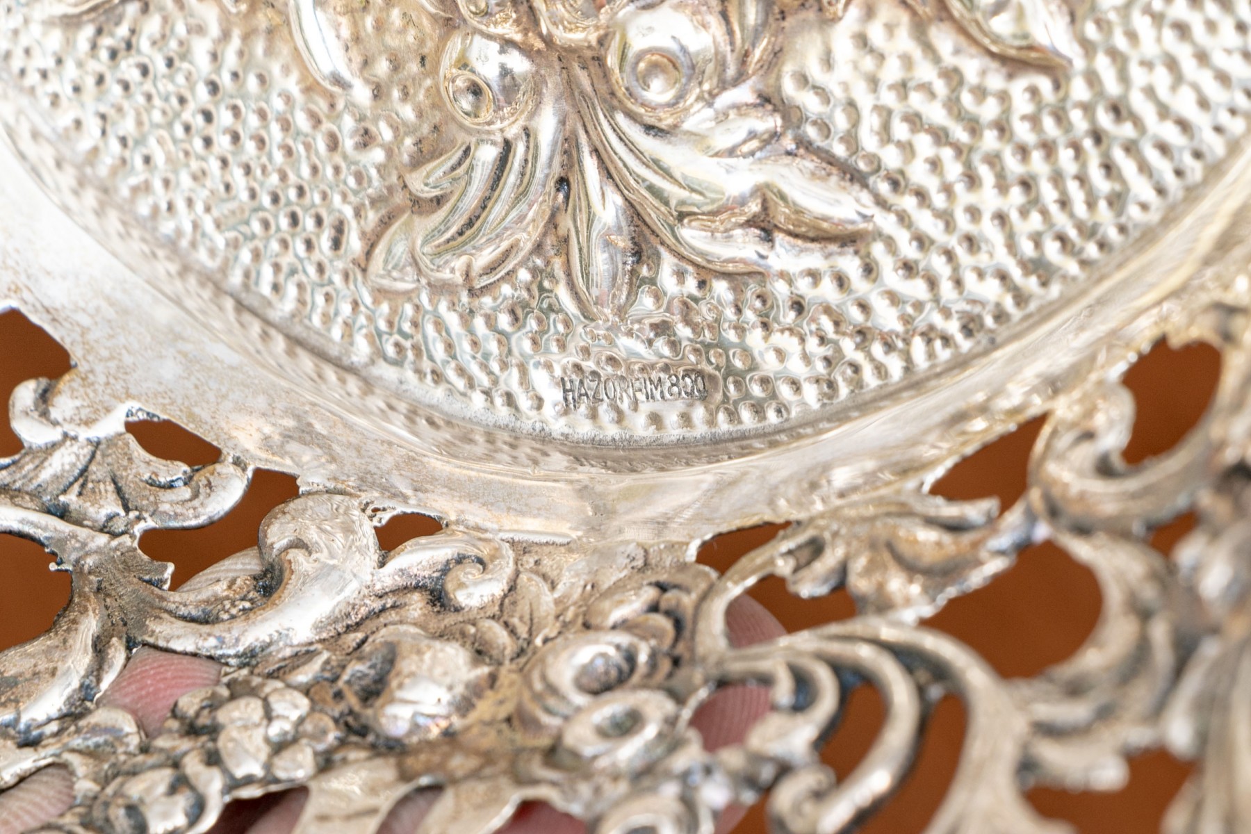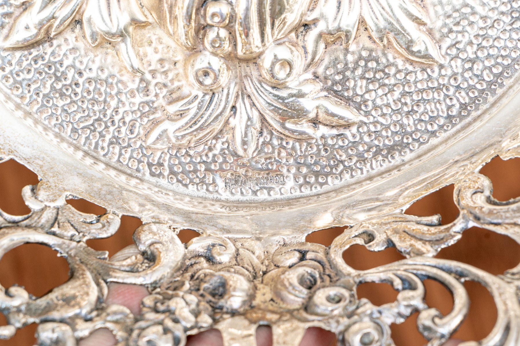 A marvelous 800 grade silver centerpiece bowl. Decorated with an oval interior featuring repousse pomegranate motif on a dimpled, textural ground. The flared walls with fabulous openwork scrolls and foliate swags. A beaded, shaped oval trim.