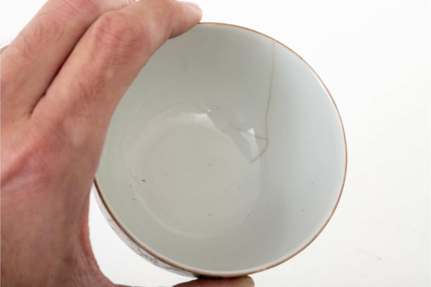 Condition: Three of the teacups have minor fractures and wear. Wear to the enameled finish on some and other wear commensurate with age and use.