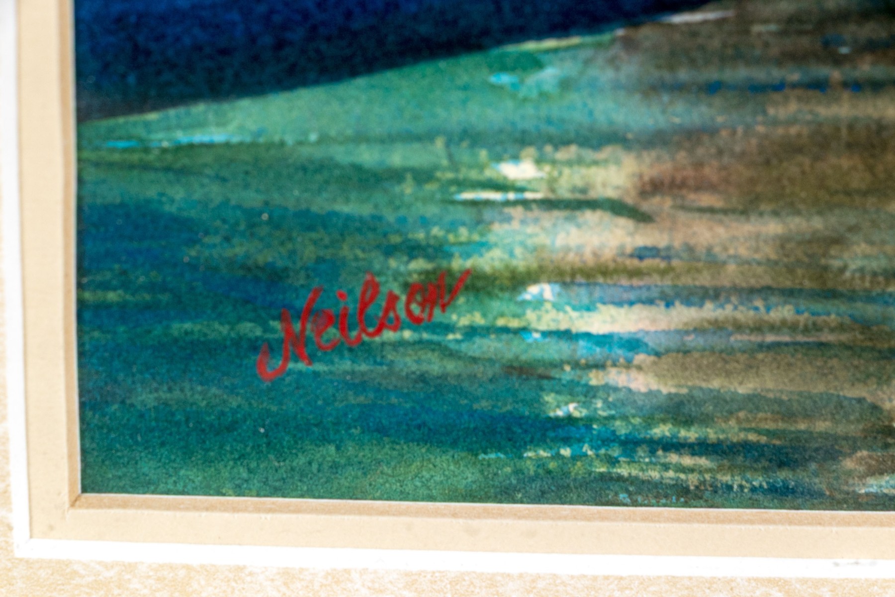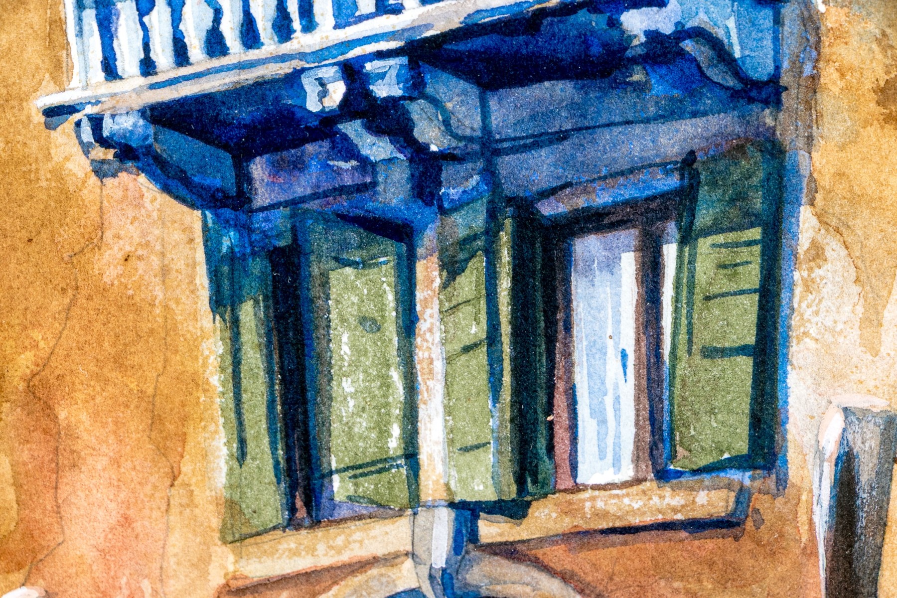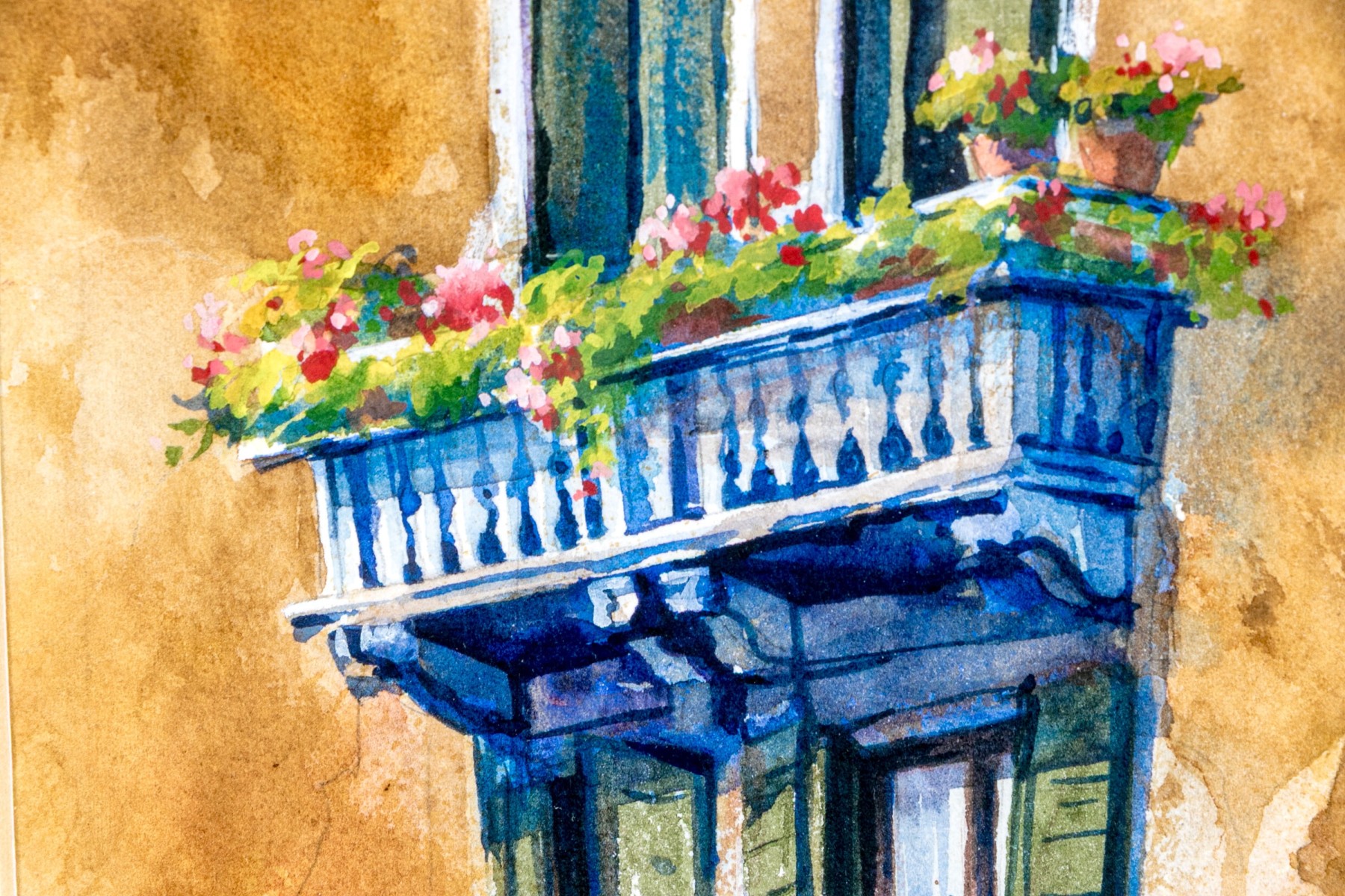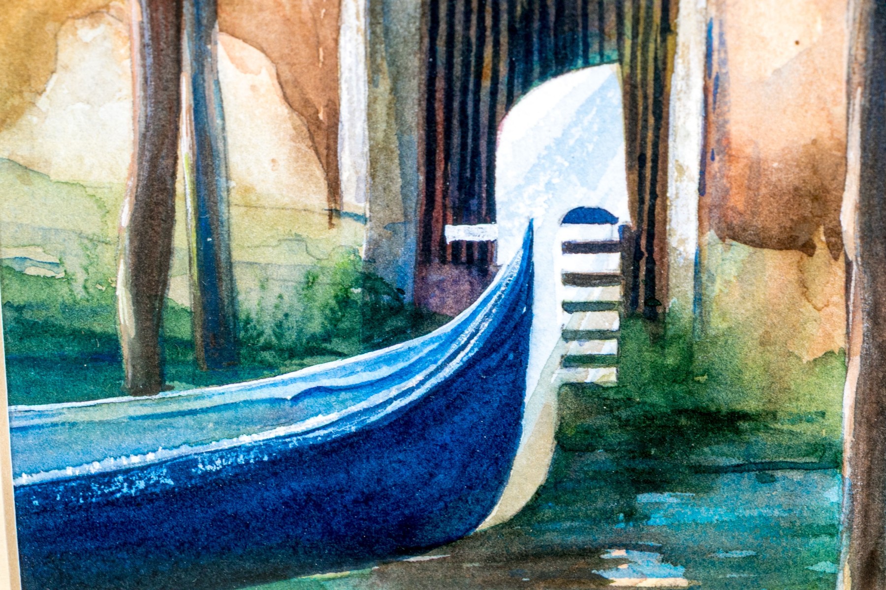 Mary Ann Neilson (American [CT], B. 1952) "Il Canale, Venice, Italy" watercolor painting on paper depicting a view of a blue and white gondola on calm teal water approaching an ochre orange building facade with an arched doorway under a planter box of pink flowers.