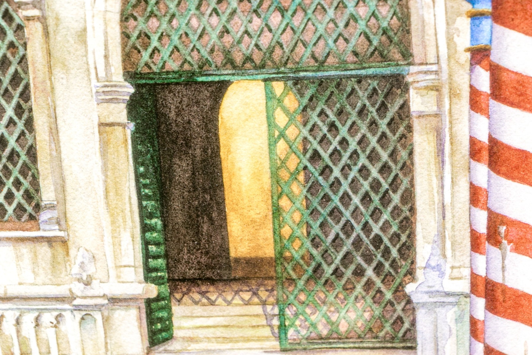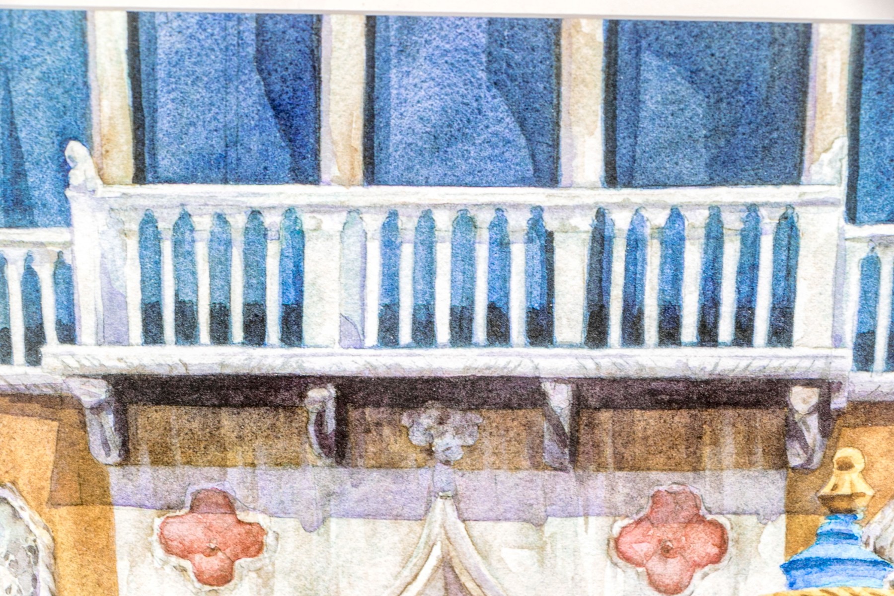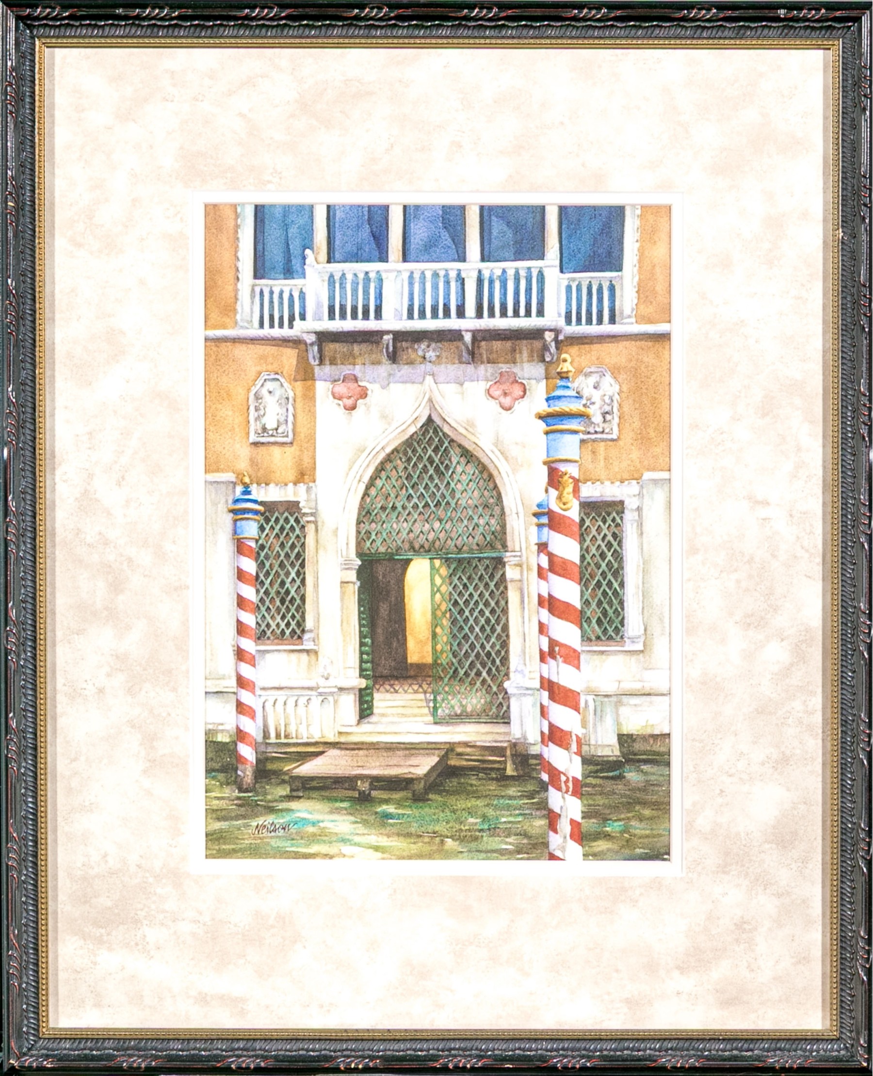 Mary Ann Neilson (American [CT], B. 1952) "Palazzo Franchetti" giclee print depicting red and white spiraled columns with blue and gilt finials on calm green water approaching an archway with an orange building facade and greet gates over the doors and windows. Plate signature lower left.