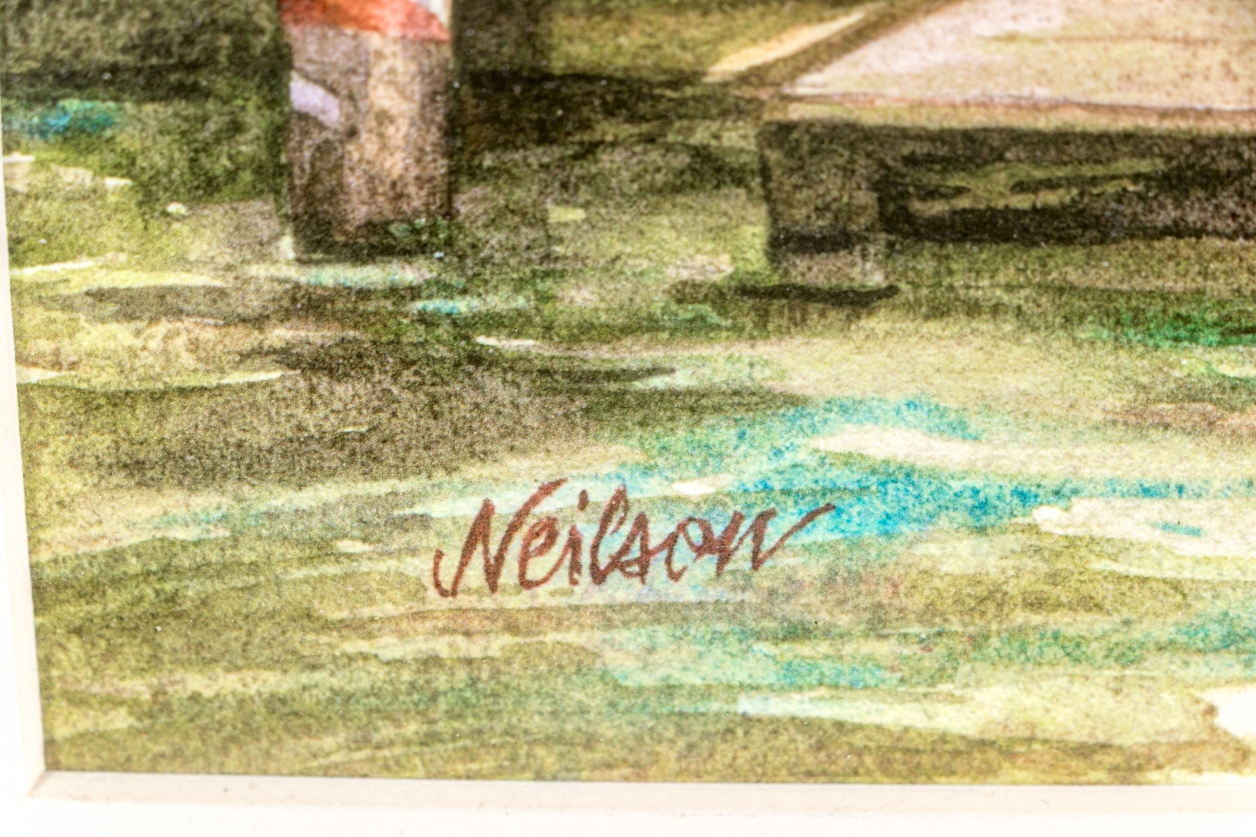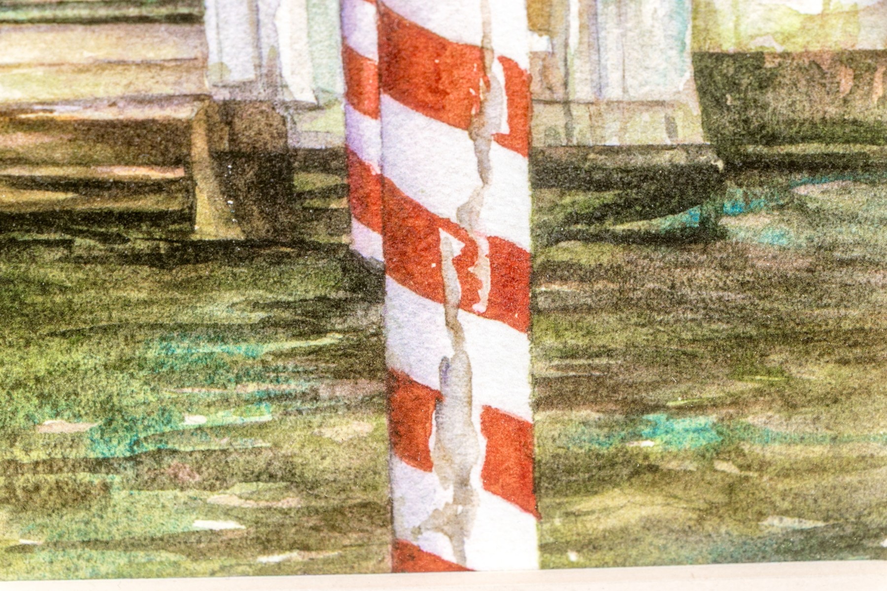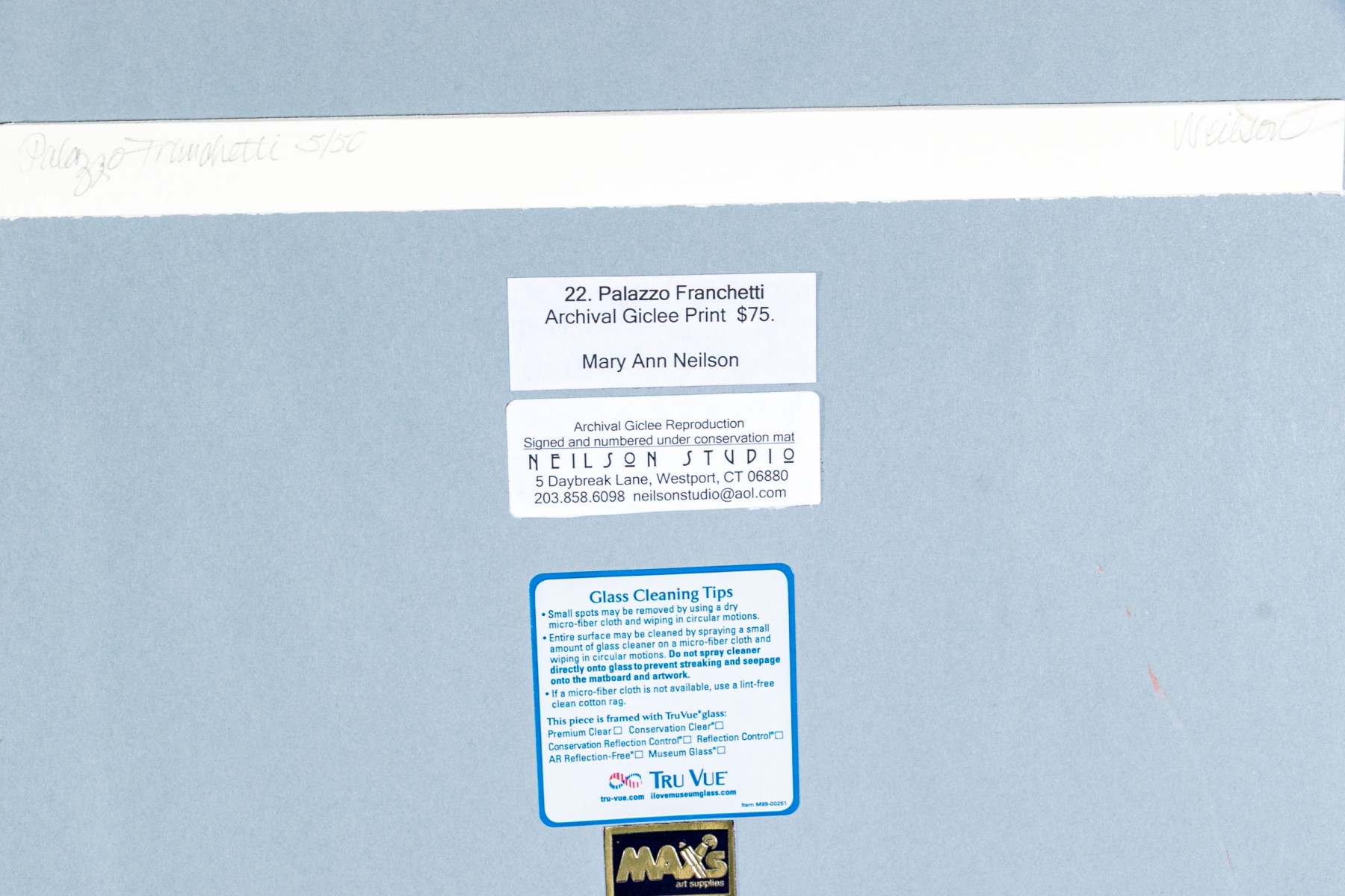 Mary Ann Neilson (American [CT], B. 1952) "Palazzo Franchetti" giclee print depicting red and white spiraled columns with blue and gilt finials on calm green water approaching an archway with an orange building facade and greet gates over the doors and windows. Plate signature lower left.