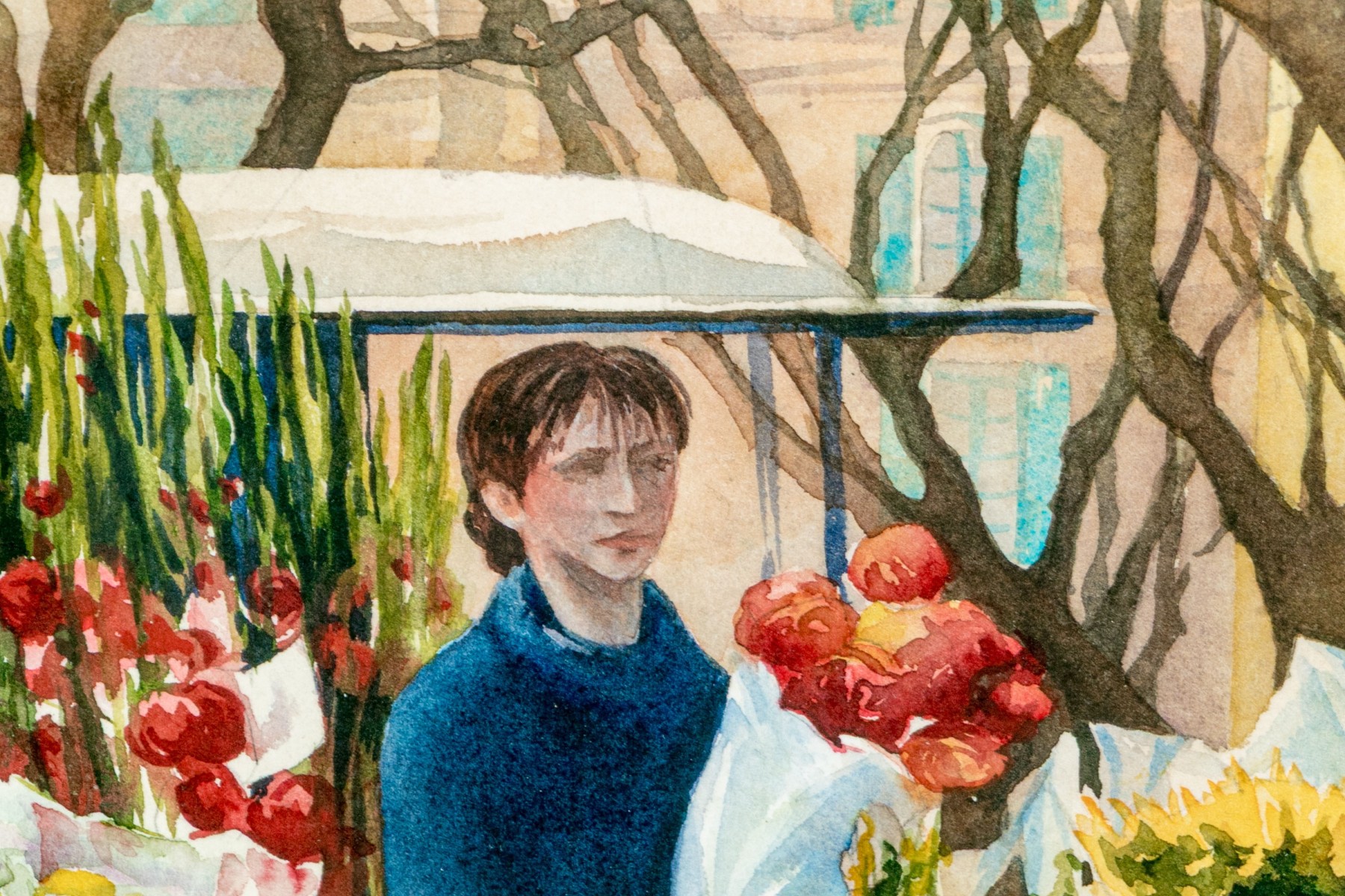 Mary Ann Neilson (American [CT], b. 1952) "Thursday Flower Market, Uzes Provence" watercolor painting on paper depicting a scene of a woman wearing a blue cowl neck sweater holding a bouquet of red flowers while standing in a lush flower market lined with bare branched tree in the background of an urban setting. Signed lower center and on the verso with the title.