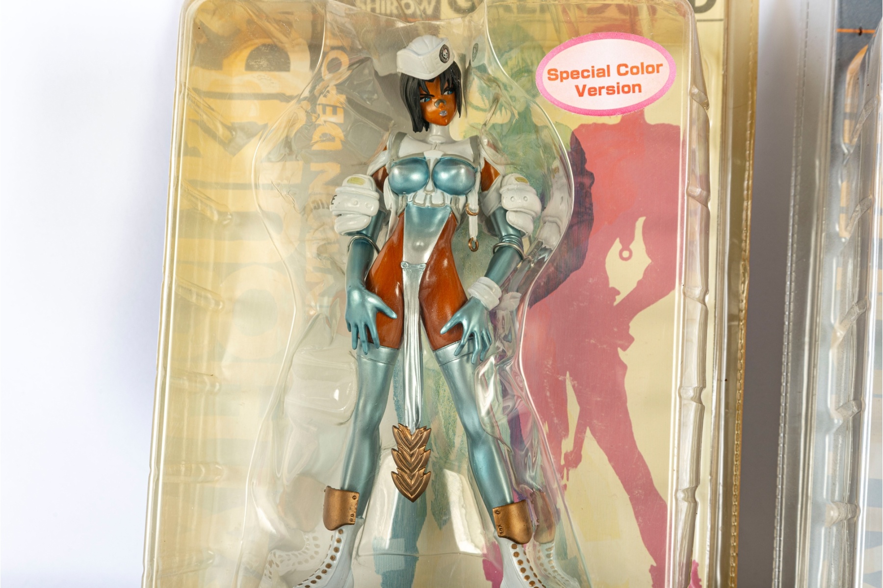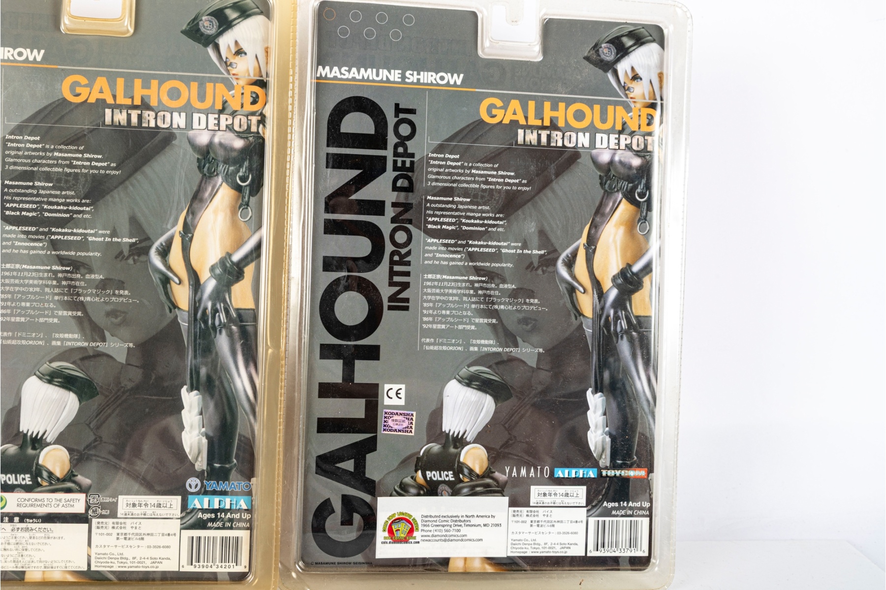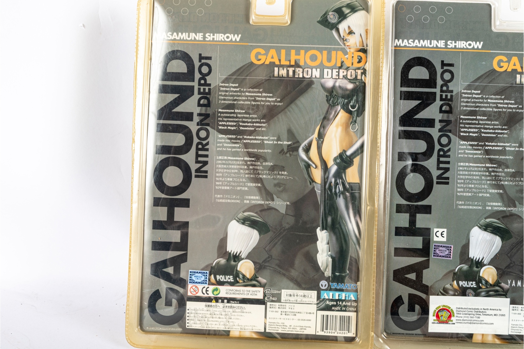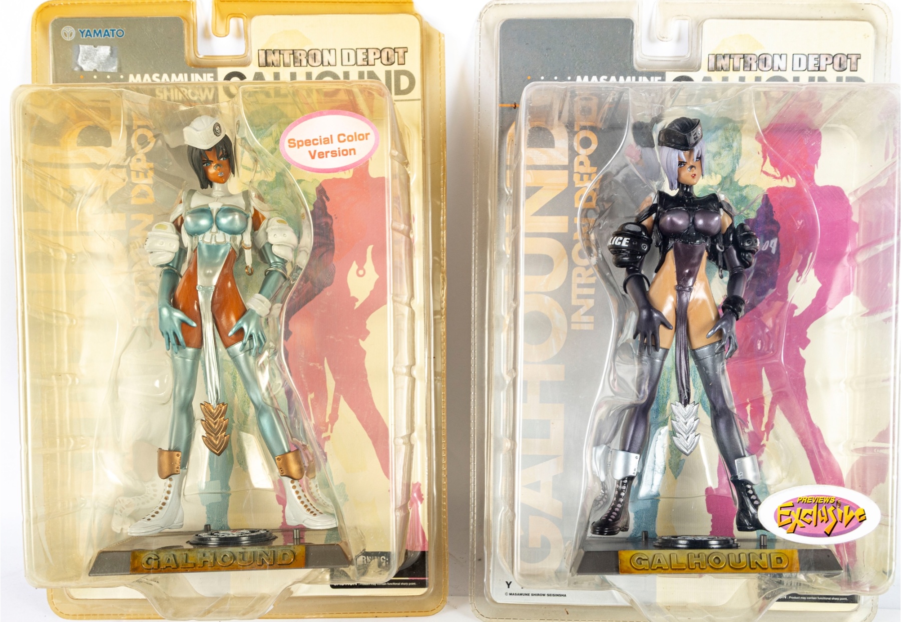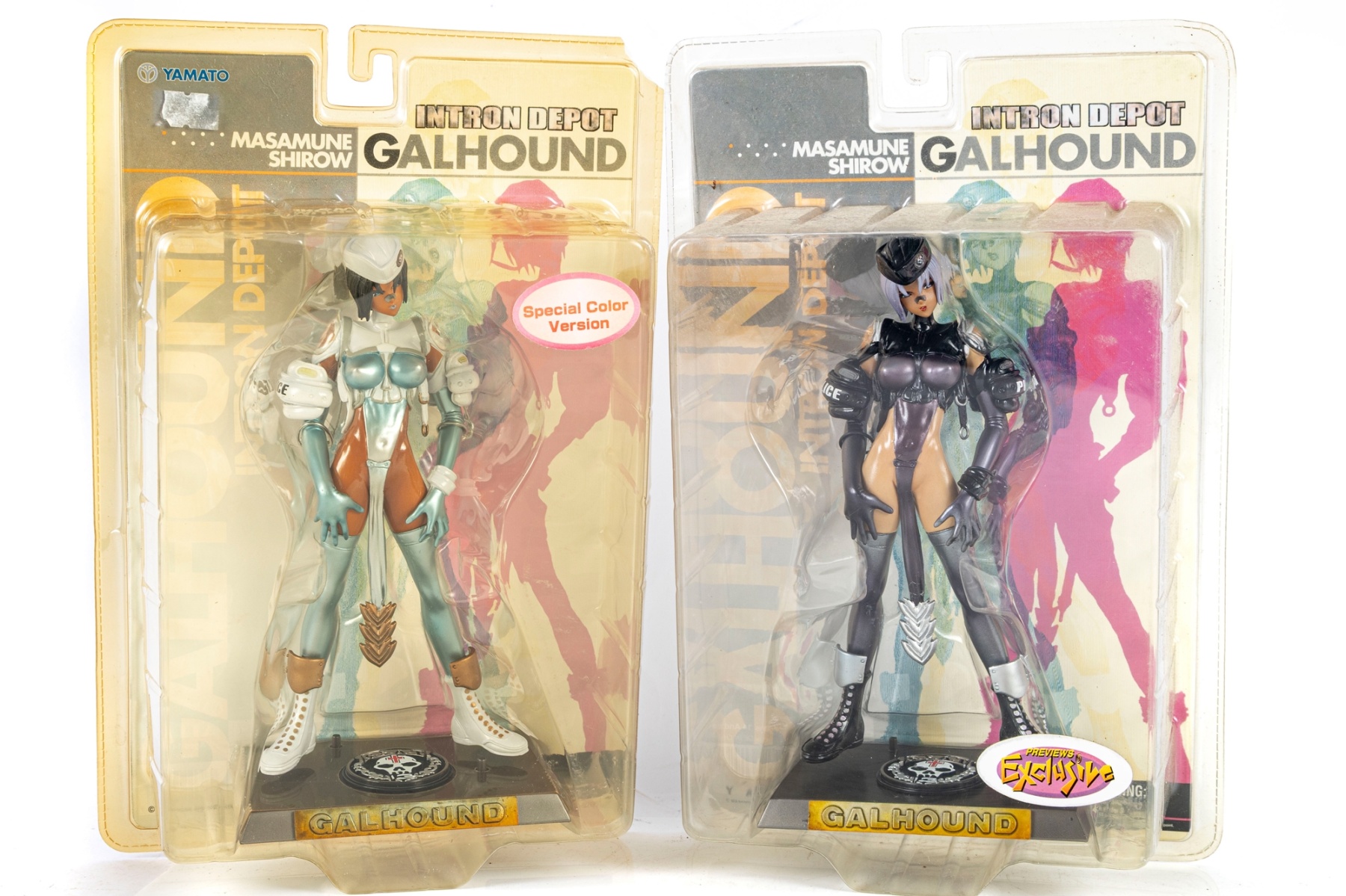 Pair of collectible “Galhound” figures from Masamune Shirow’s Intron Depot series, produced by Yamato and Alpha. Each figure is based on Shirow’s acclaimed futuristic and stylized artwork, known from Ghost in the Shell and Appleseed.