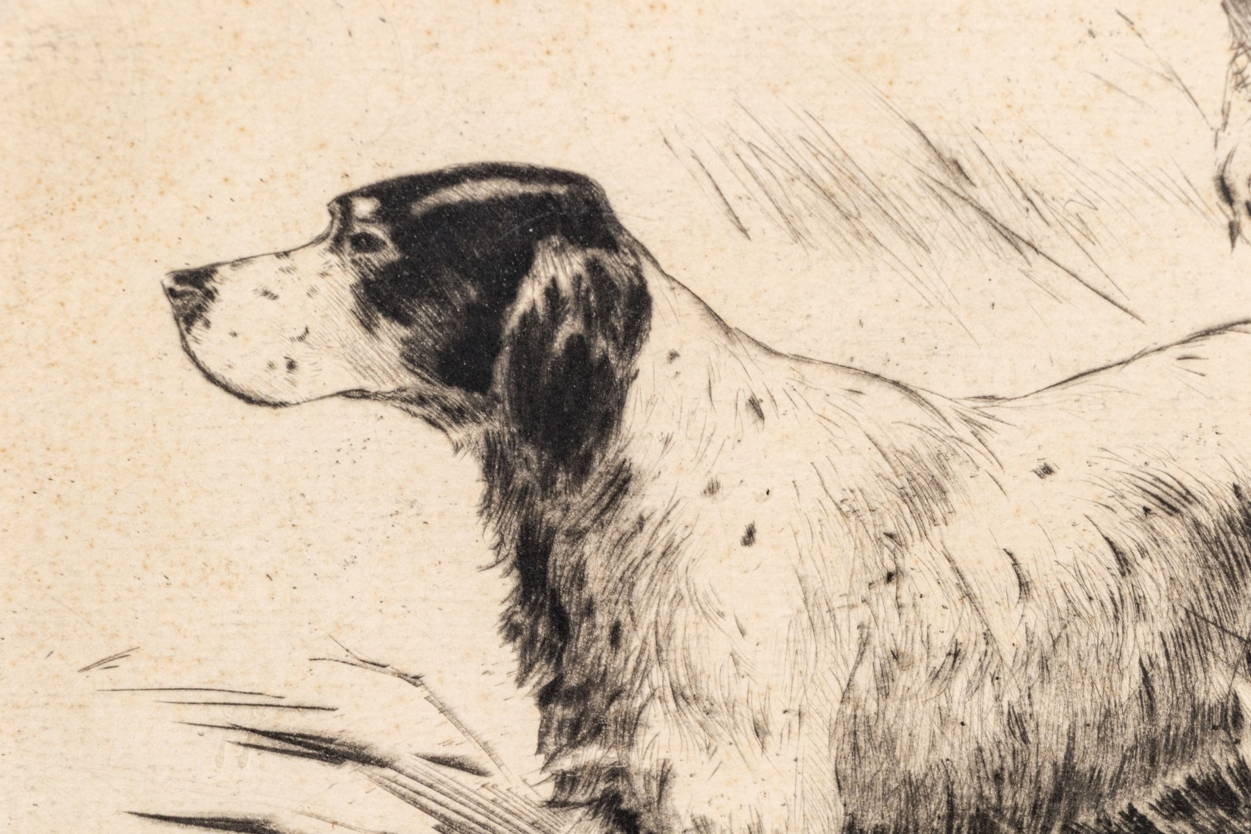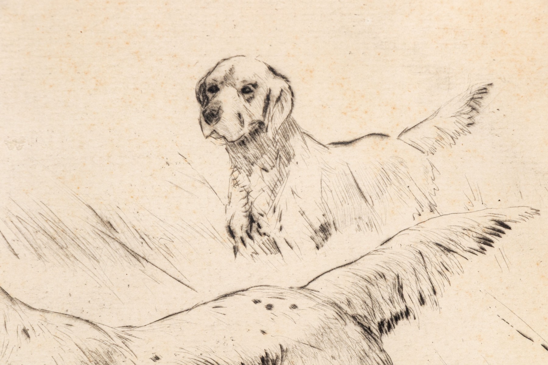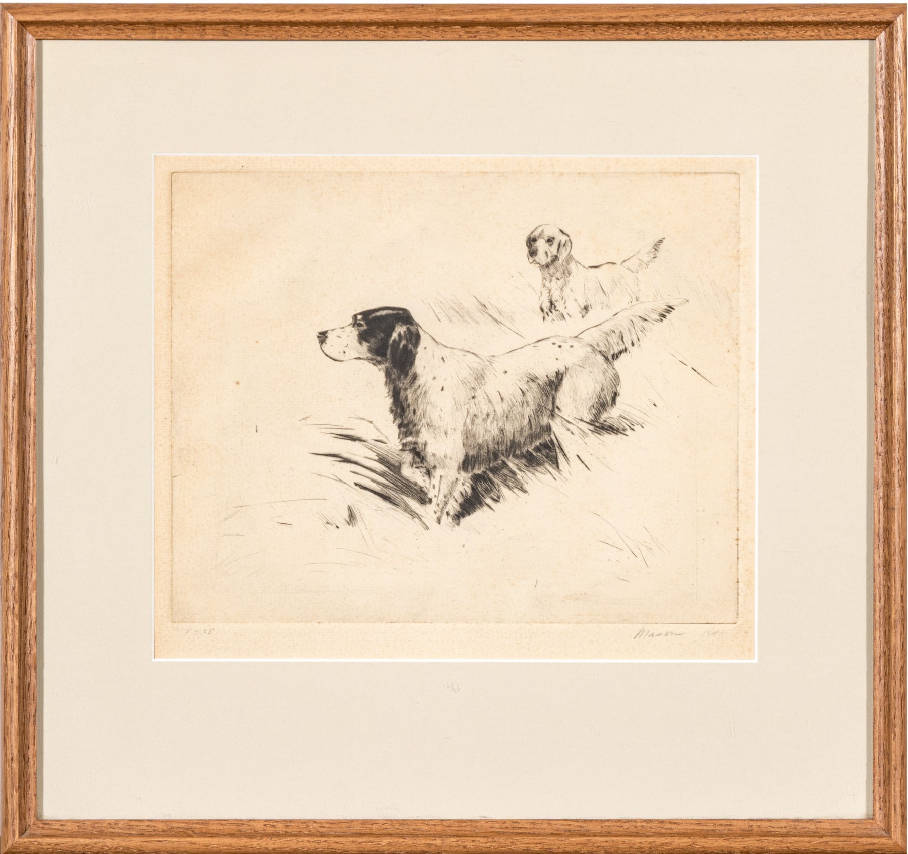 Pencil signed and dated 1941 lower right and numbered 1-25 lower trim out of plate. Depicting two English Setters in landscape. Dimensions: 8 3/4 x 10 1/2" W, sight // 14 7/8 x 15 7/8" W, frame