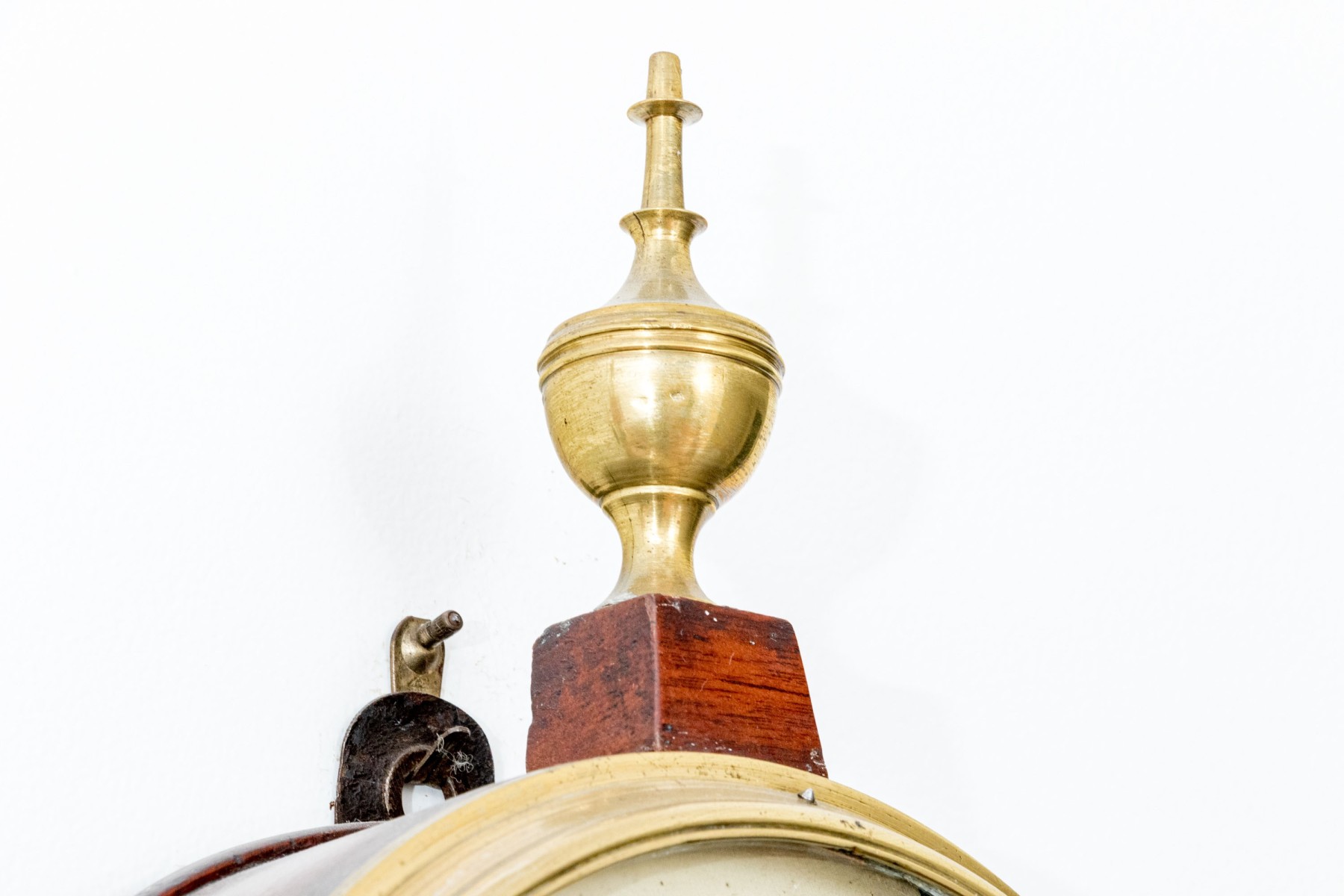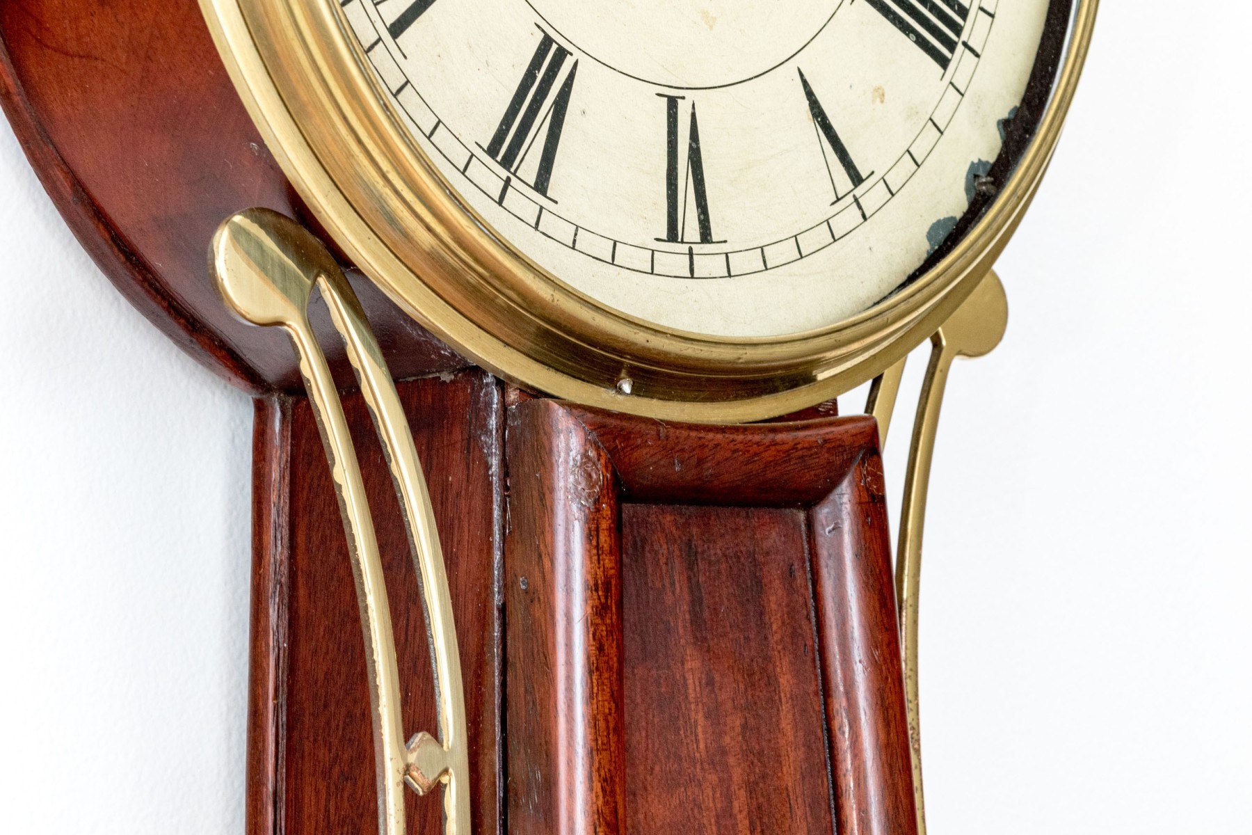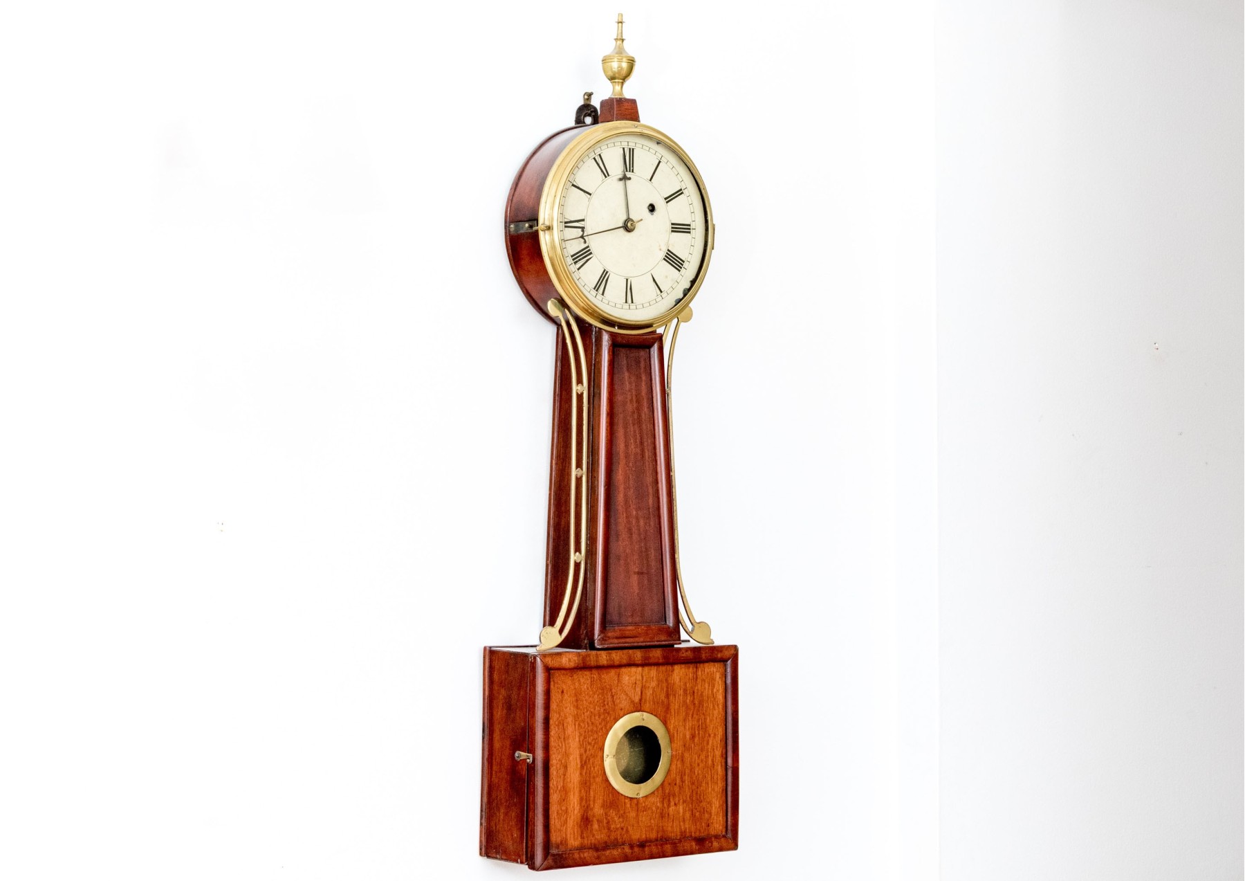 A nicely aged banjo form wall clock with classic Federal appeal, showcasing a brass urn finial at the top of a white dial with black Roman numerals. Elegant openwork brass scrolls flank a gently tapered rectangular trunk, leading to a square bottom case in rich, warm-toned brown mahogany with a brass border surrounding a view of the pendulum within.