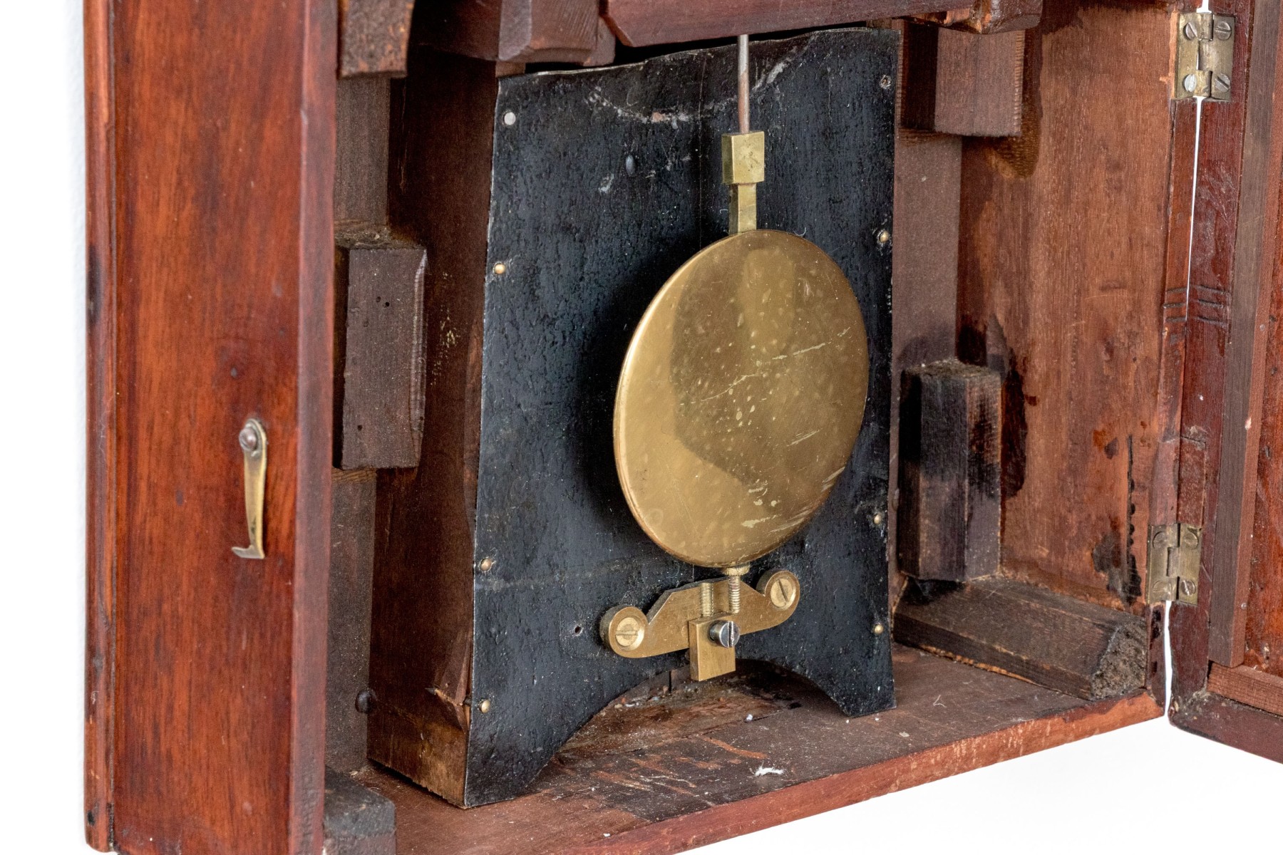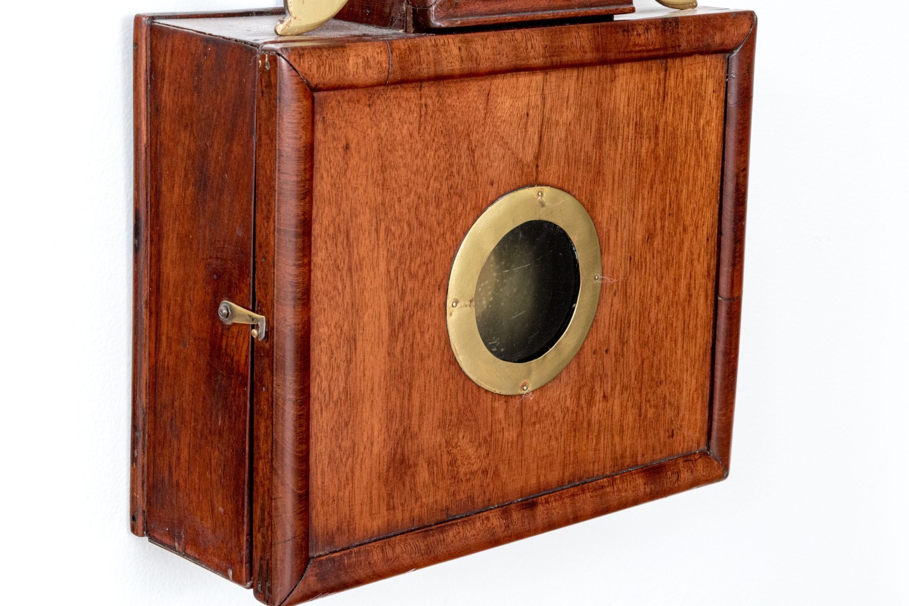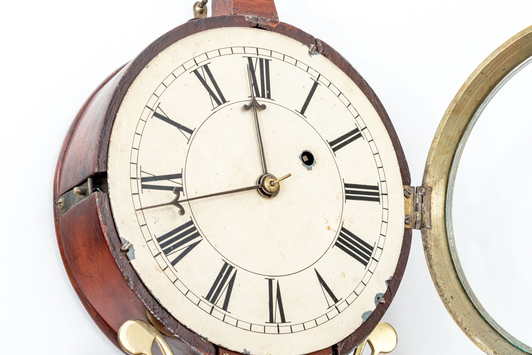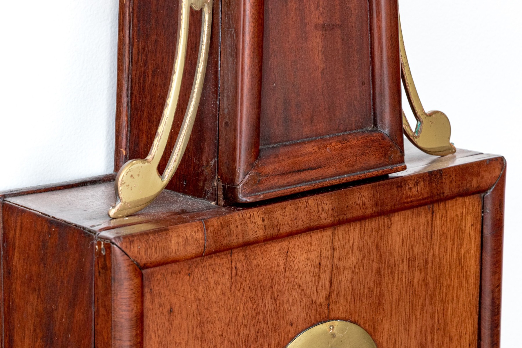 A nicely aged banjo form wall clock with classic Federal appeal, showcasing a brass urn finial at the top of a white dial with black Roman numerals. Elegant openwork brass scrolls flank a gently tapered rectangular trunk, leading to a square bottom case in rich, warm-toned brown mahogany with a brass border surrounding a view of the pendulum within.