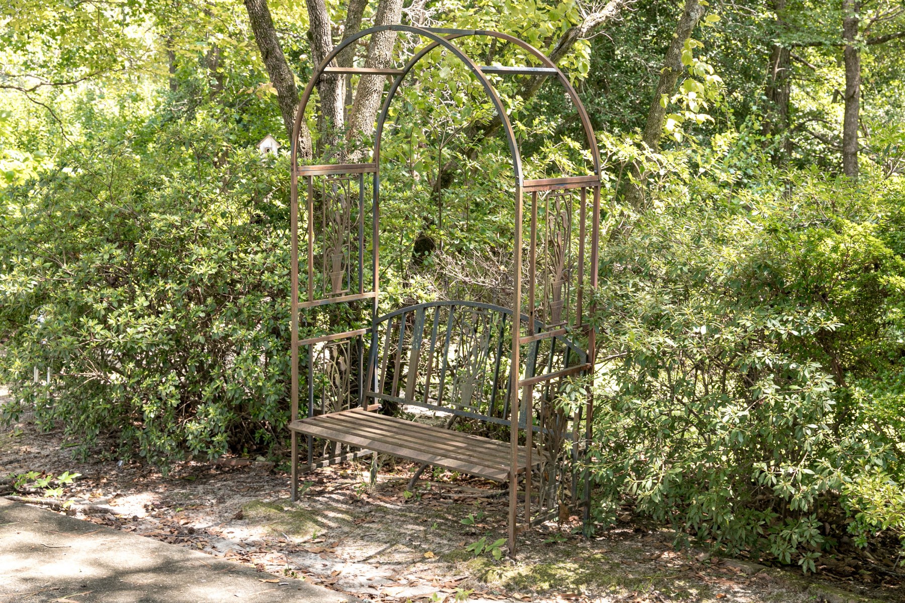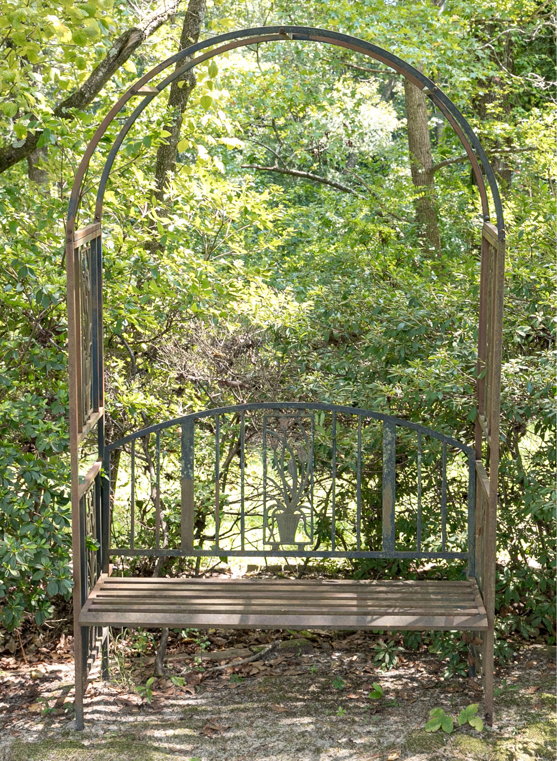 A lovely and massive arched outdoor iron bench, presenting a large arched dome top which leads down to a rectangular bench featuring an arched top and pierced back to provide for a rustic and charming display.