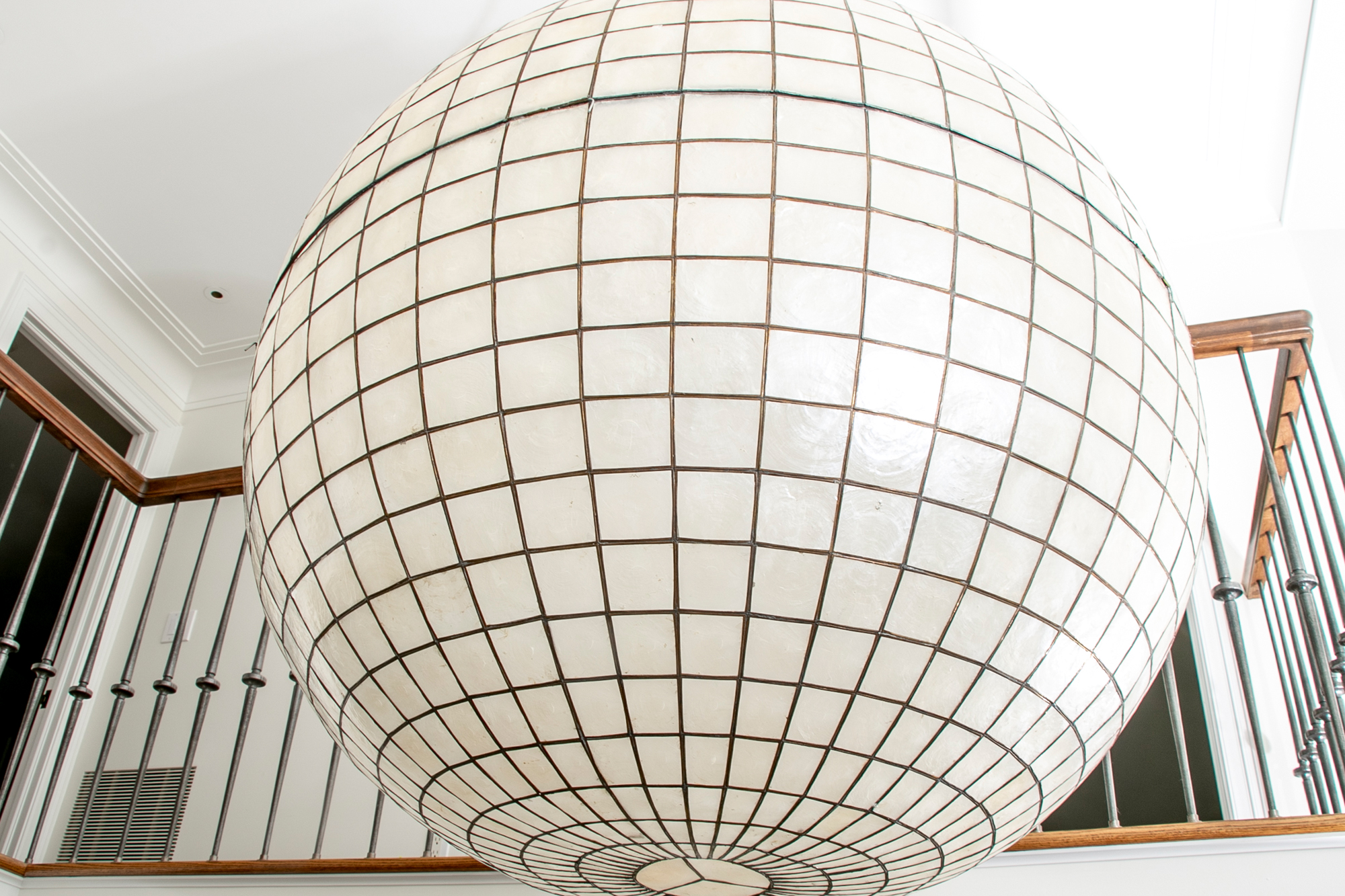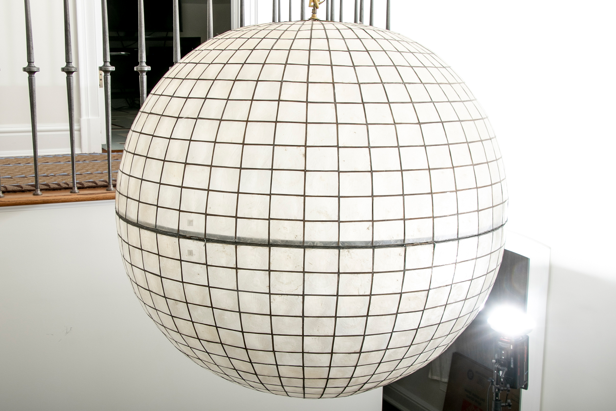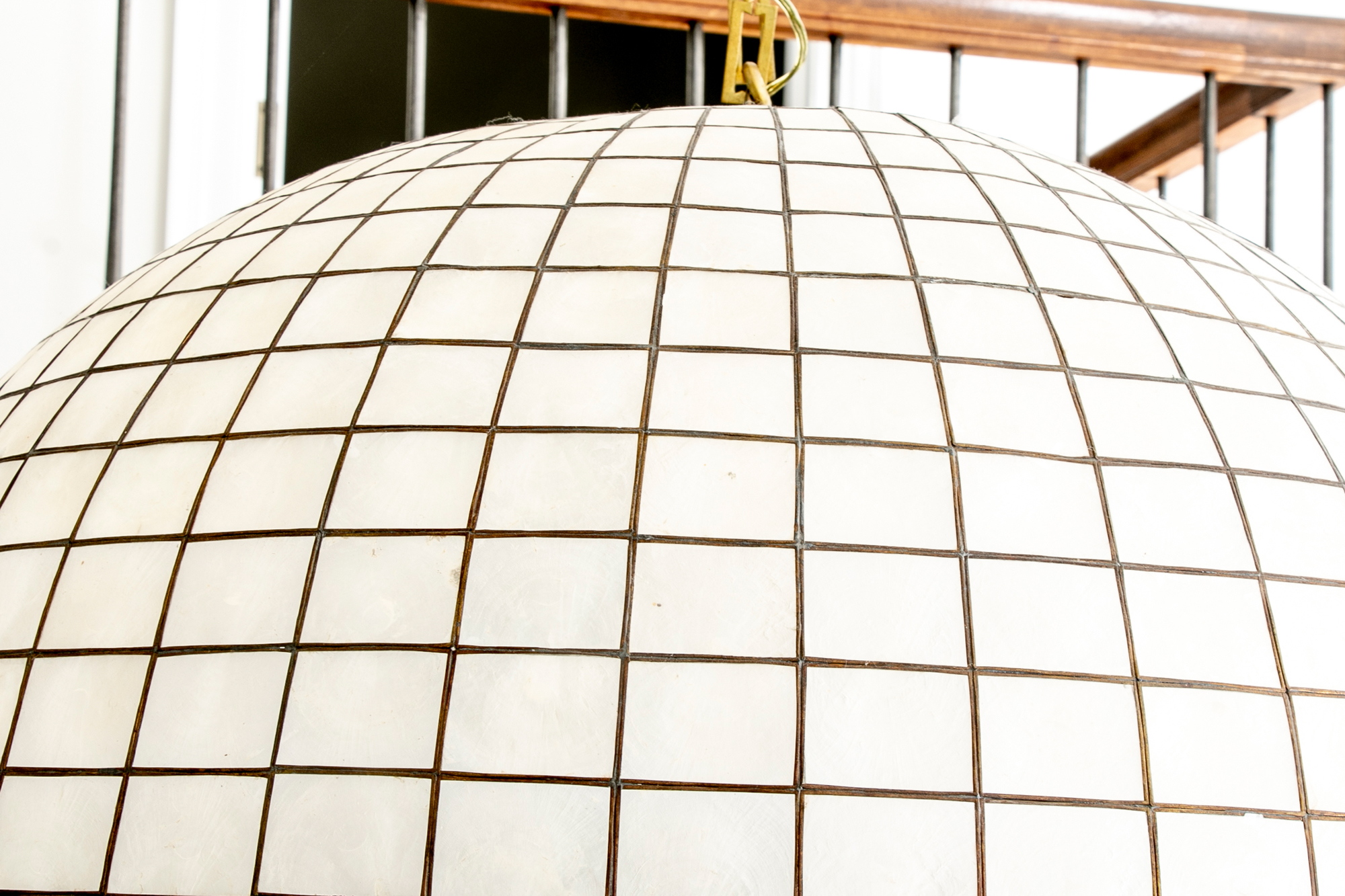 An enormous Capiz shell ball form pendant chandelier with graduated lattice design.
