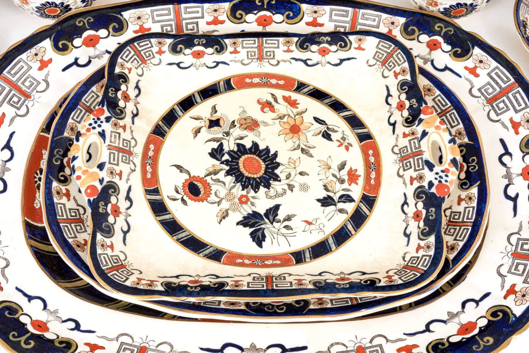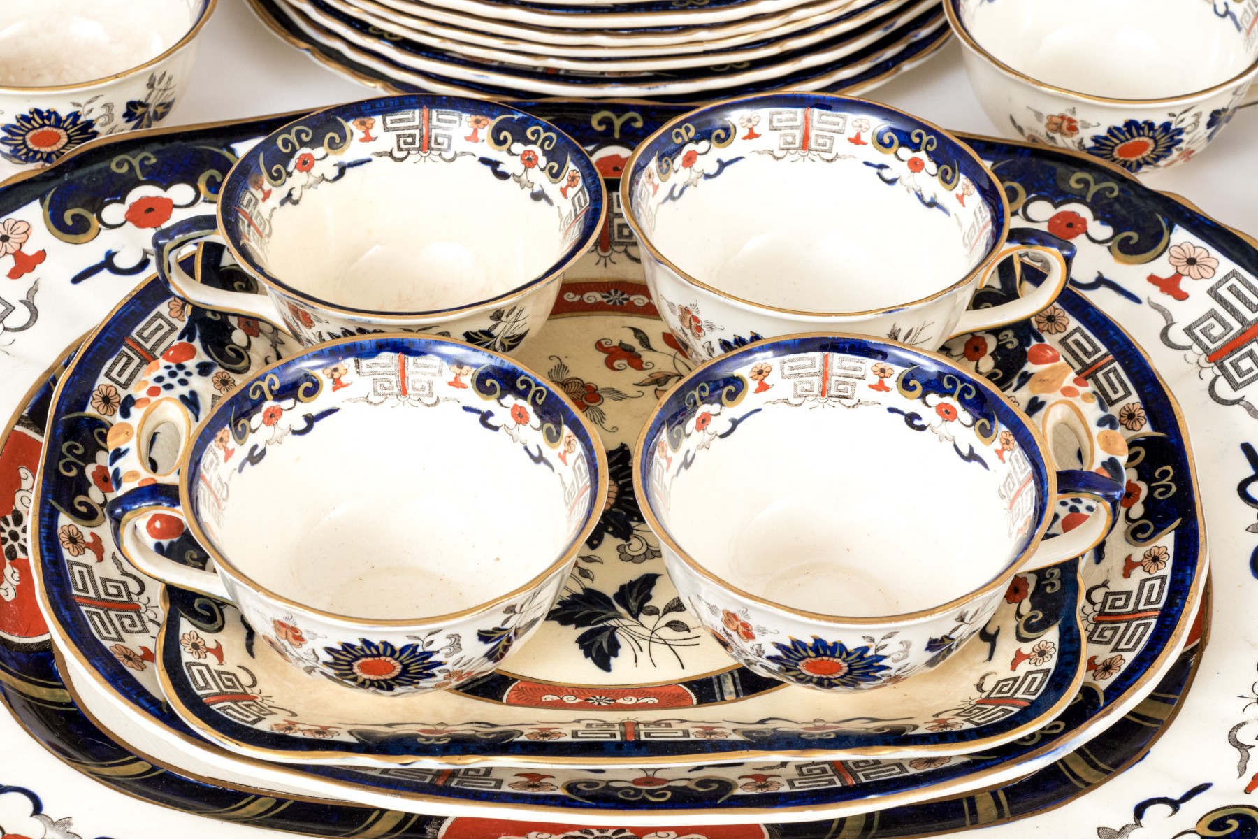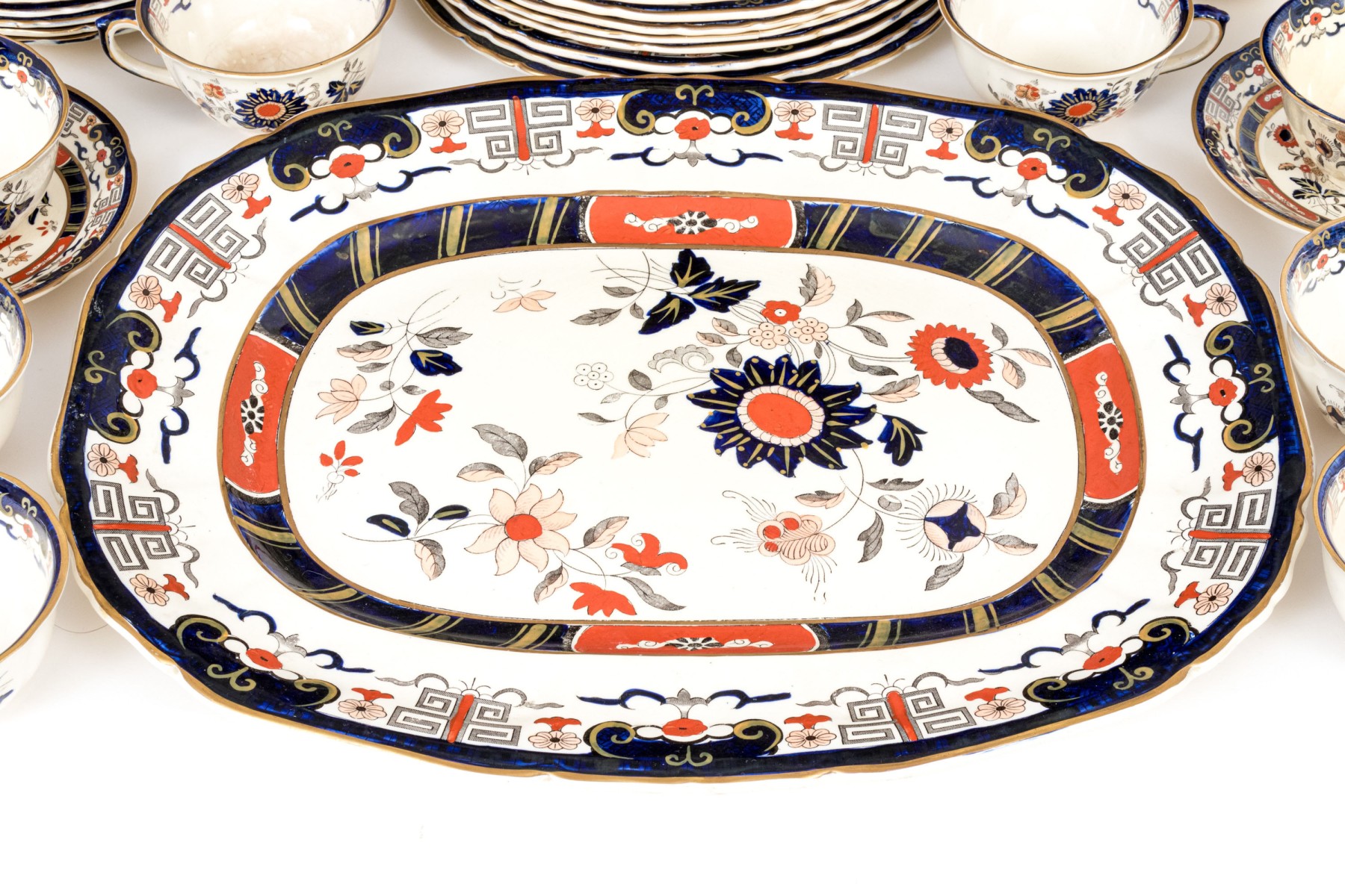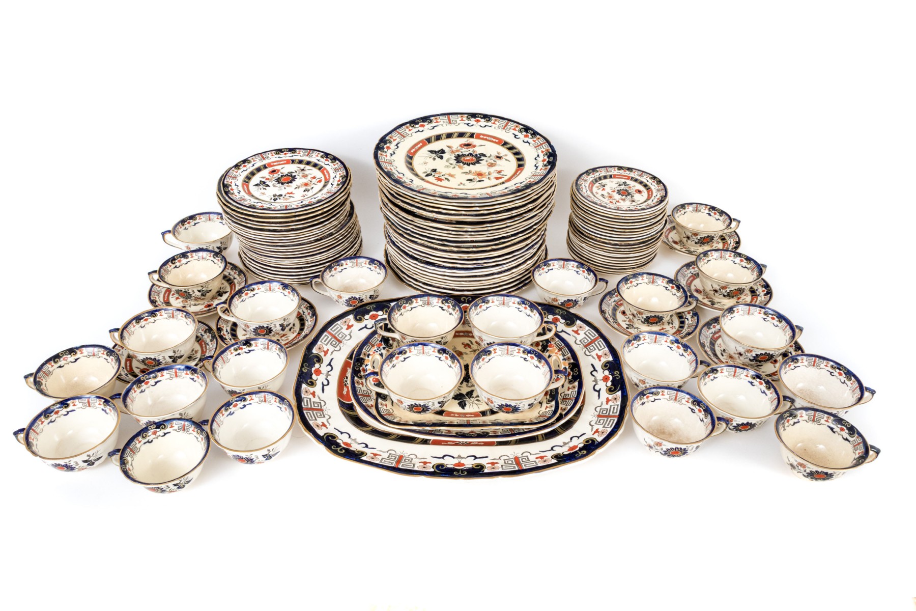 A massive Mason's "Windsor" ironstone china service sporting white bodies, gilt rims, and hand-detailed floral sprays in blue and orange.