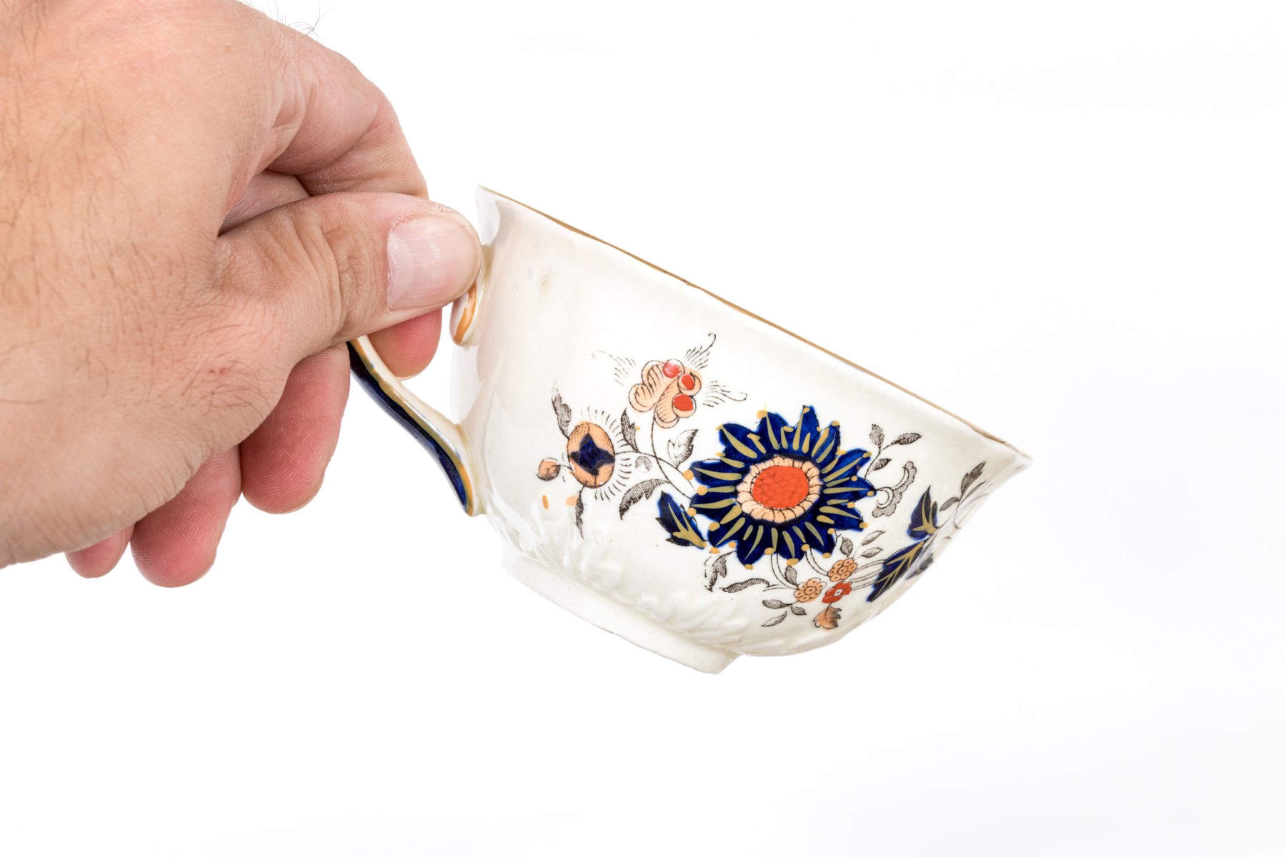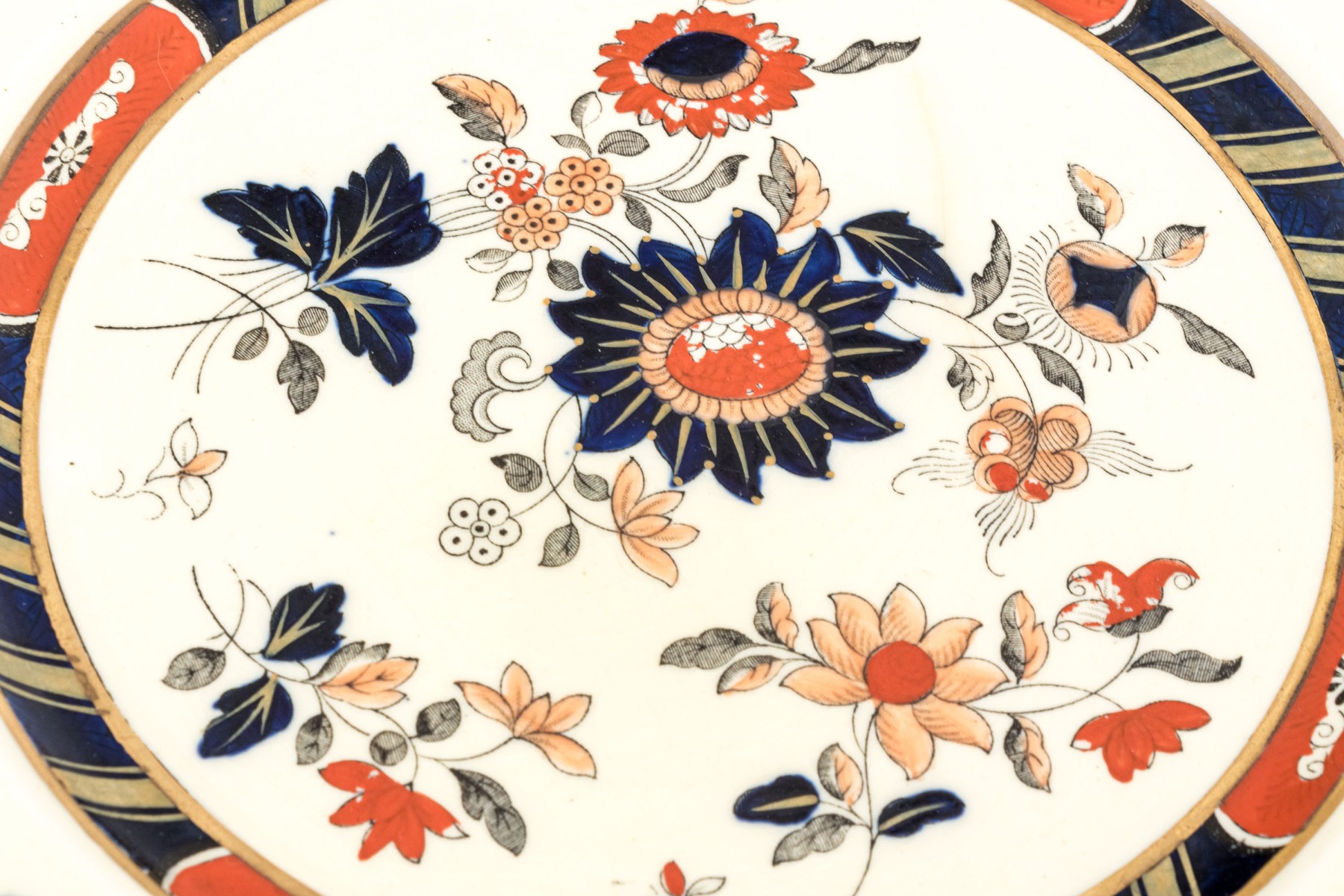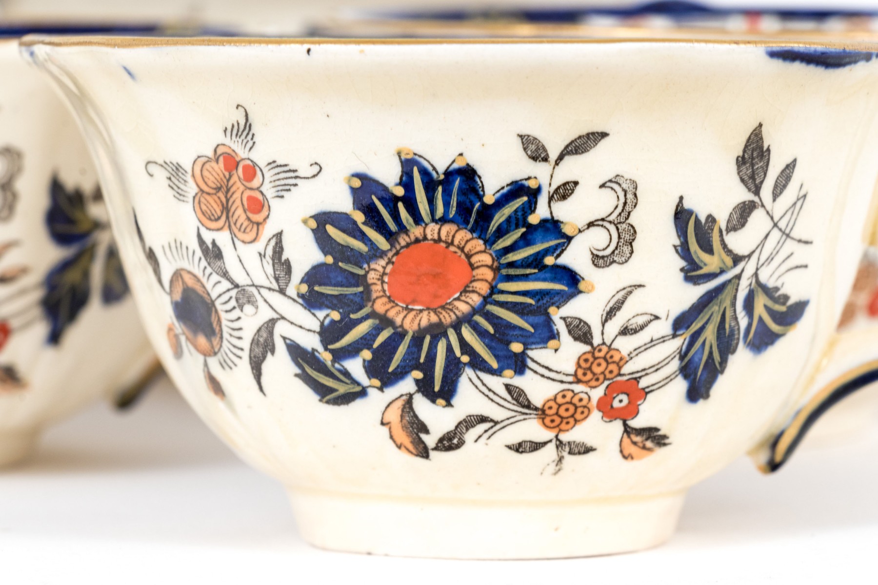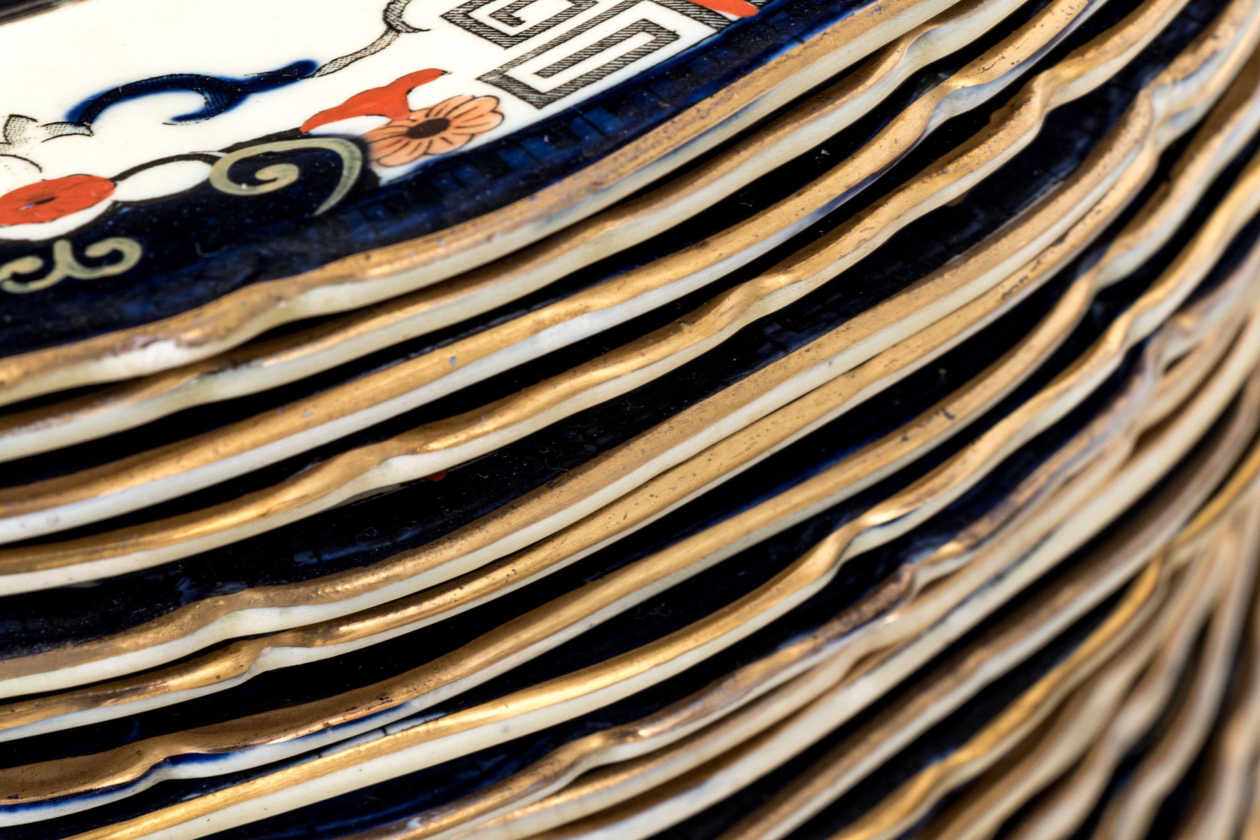 A massive Mason's "Windsor" ironstone china service sporting white bodies, gilt rims, and hand-detailed floral sprays in blue and orange.