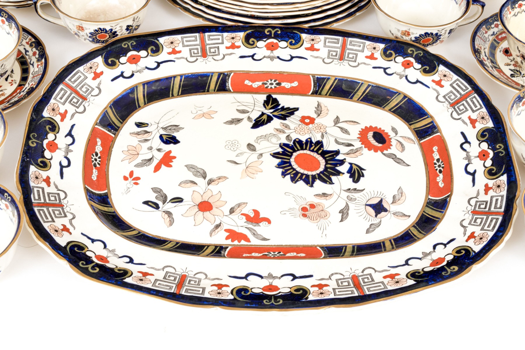 Wear includes losses to the decorative finish and gilt trims with hairline fractures to some but overall a great set of china.