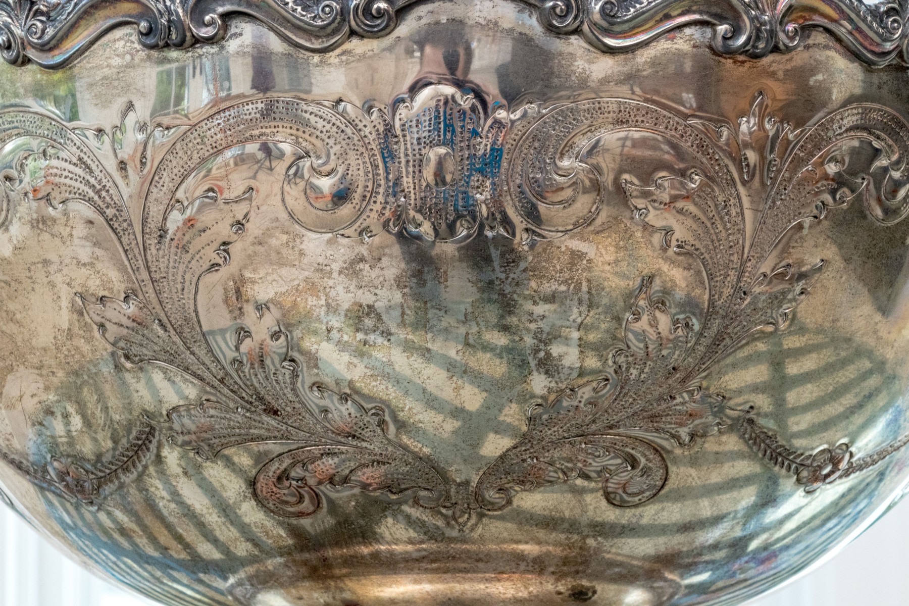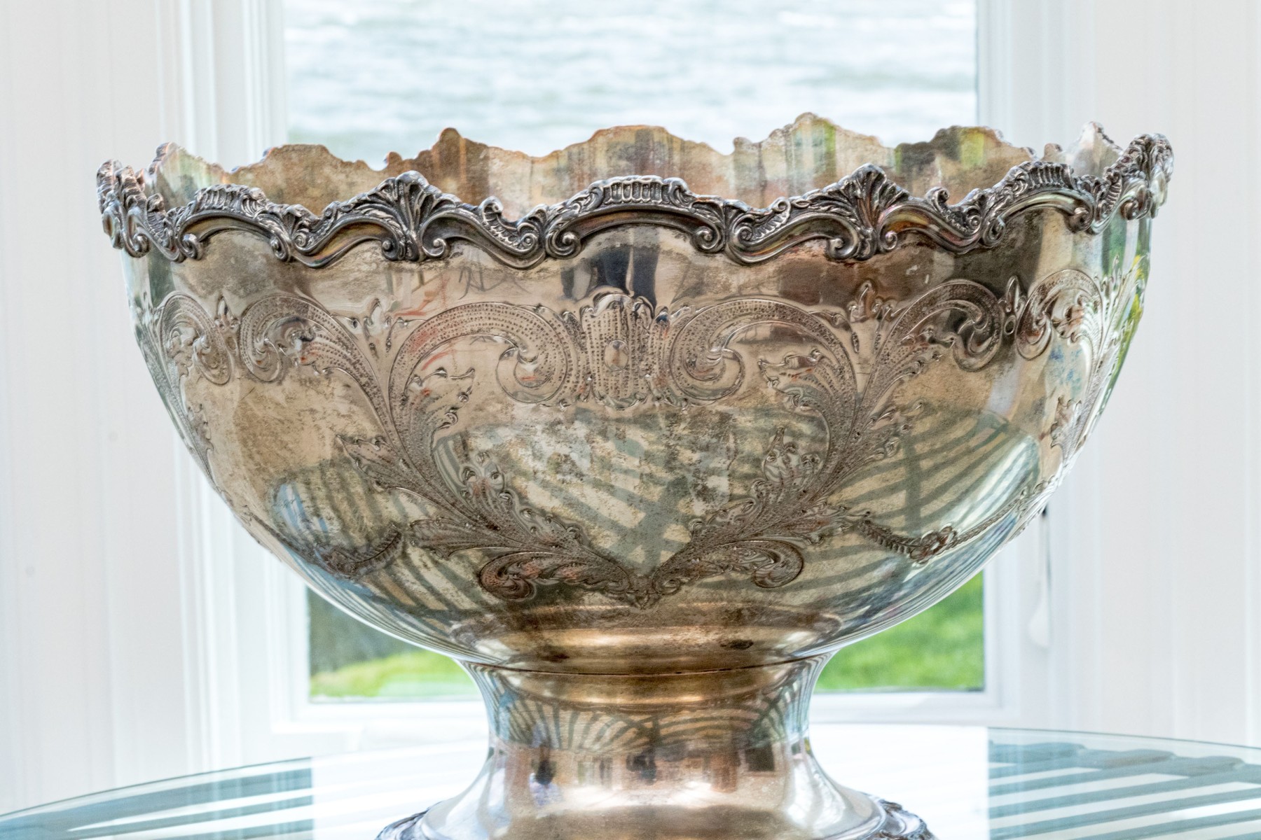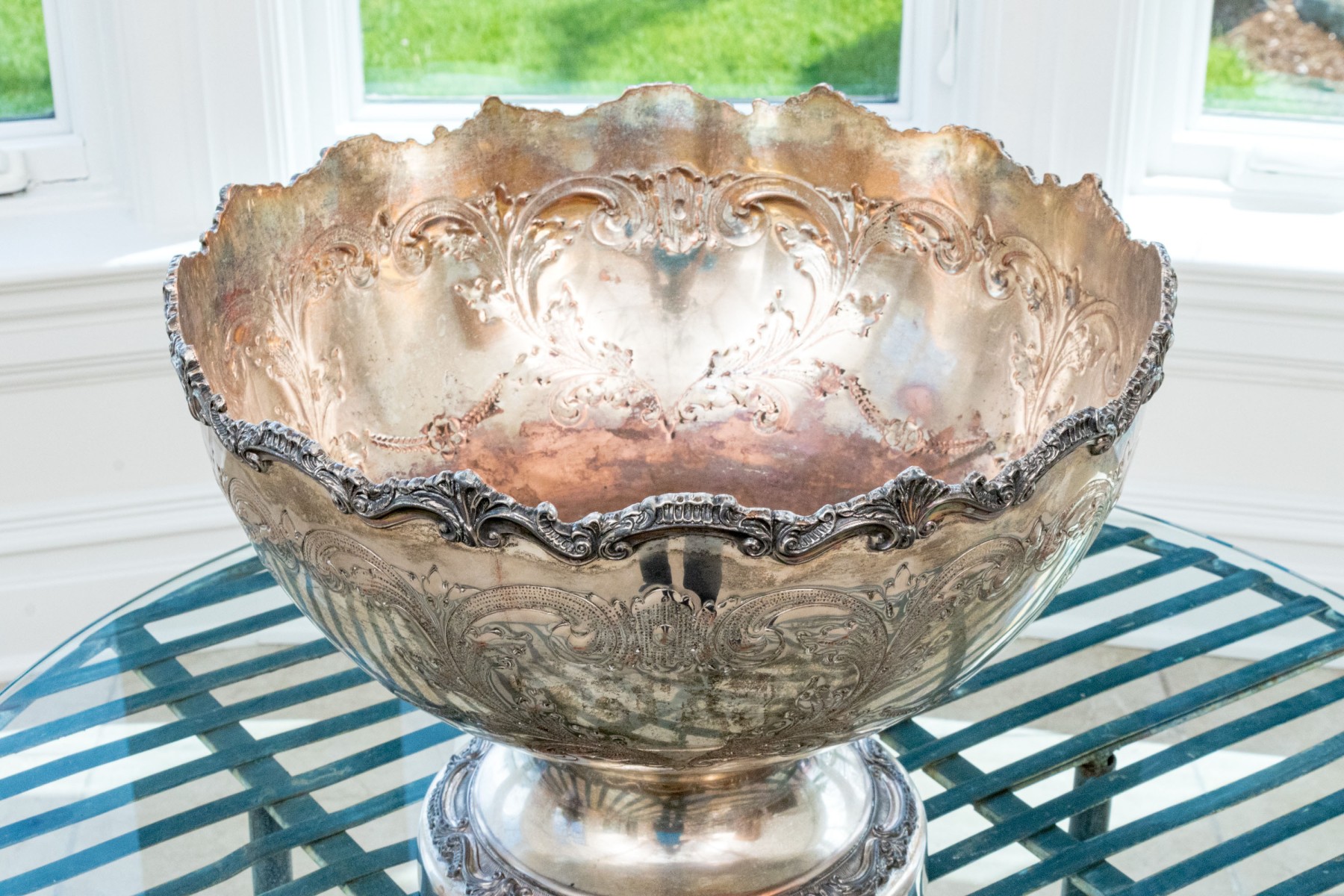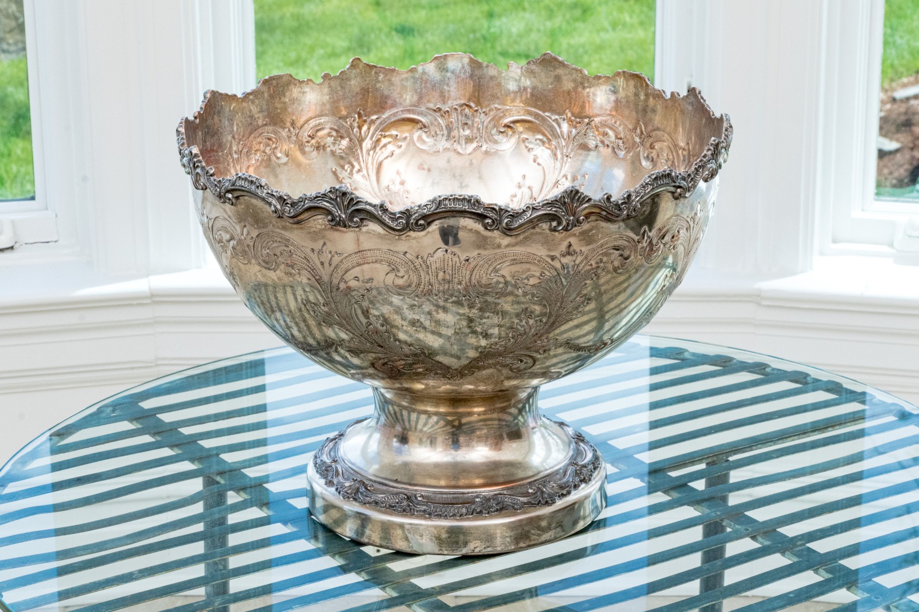 A massive English silver plated punch bowl with an ornate, scalloped rim.