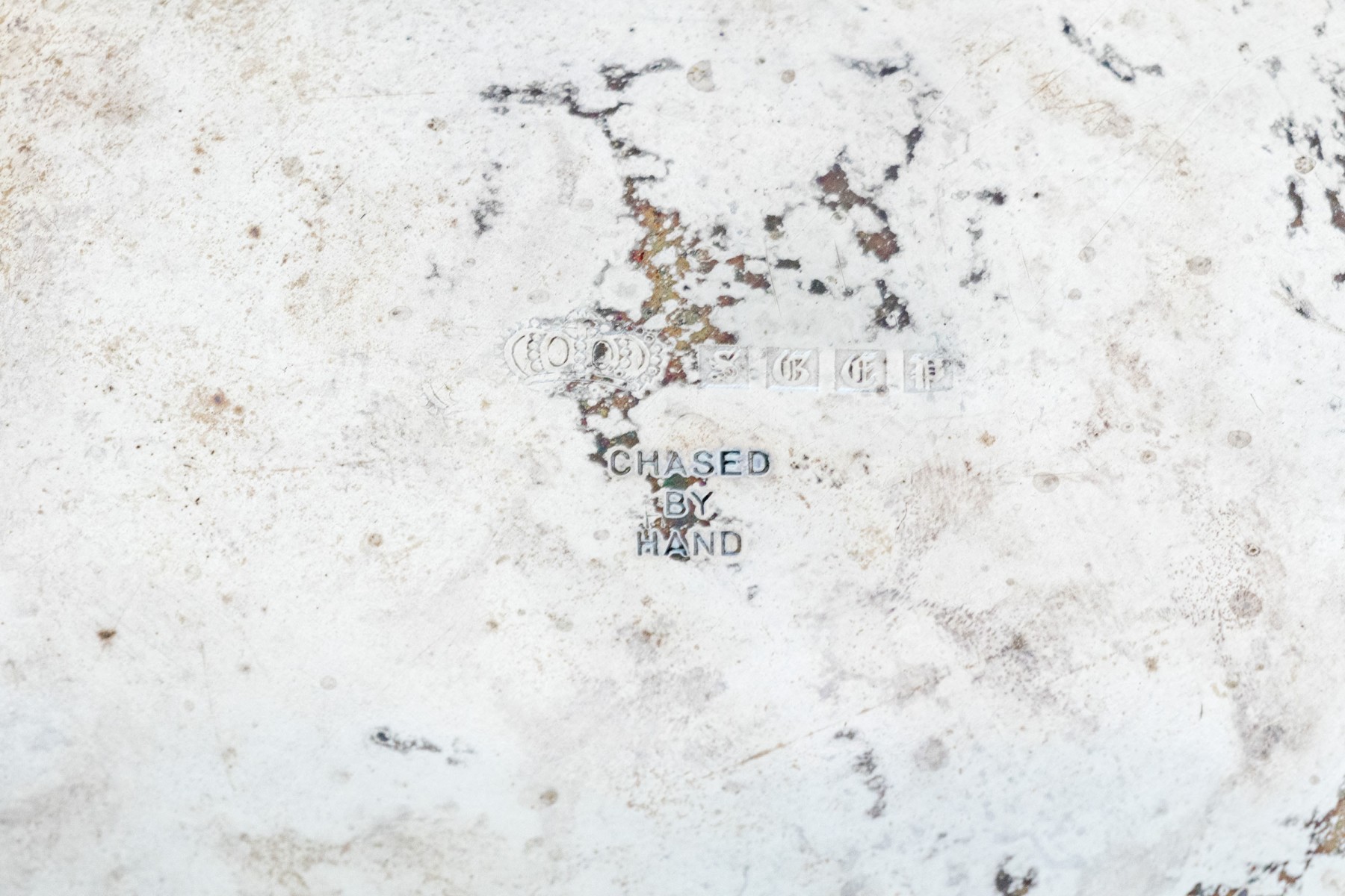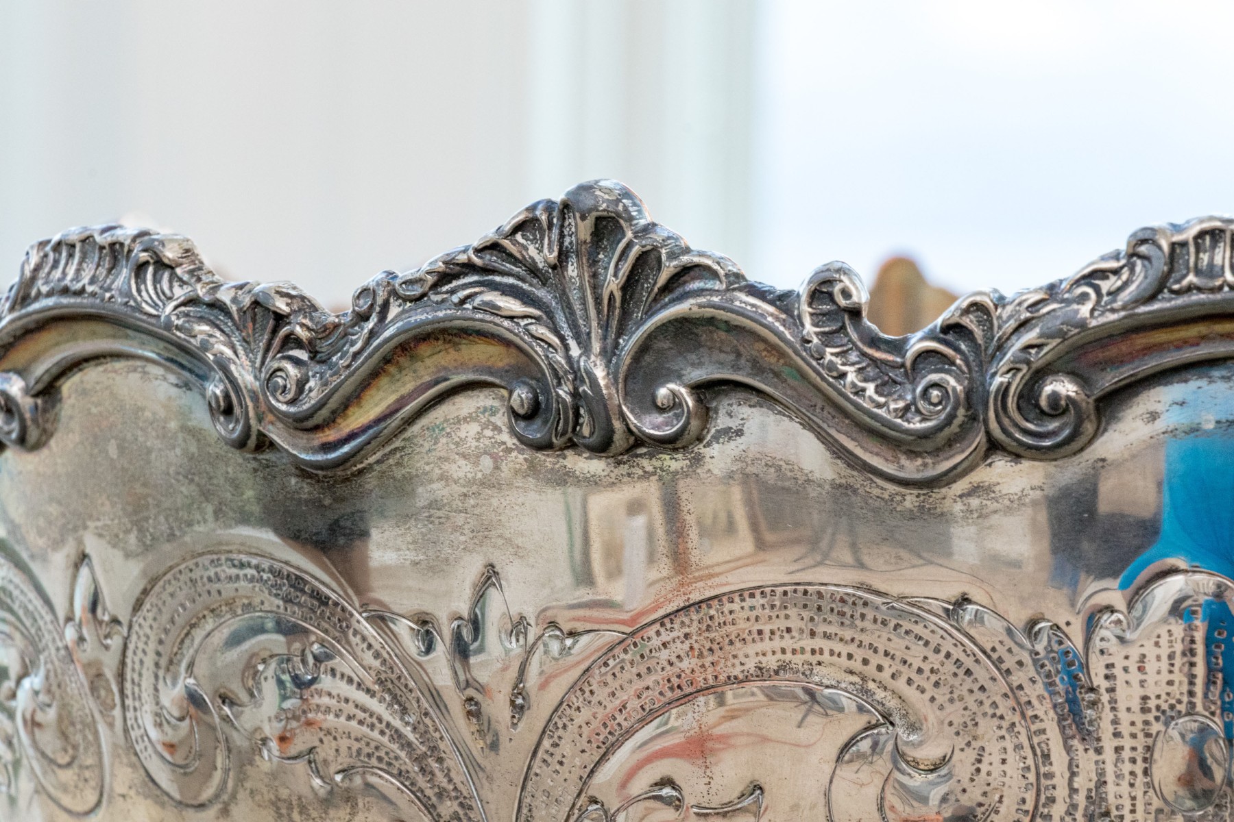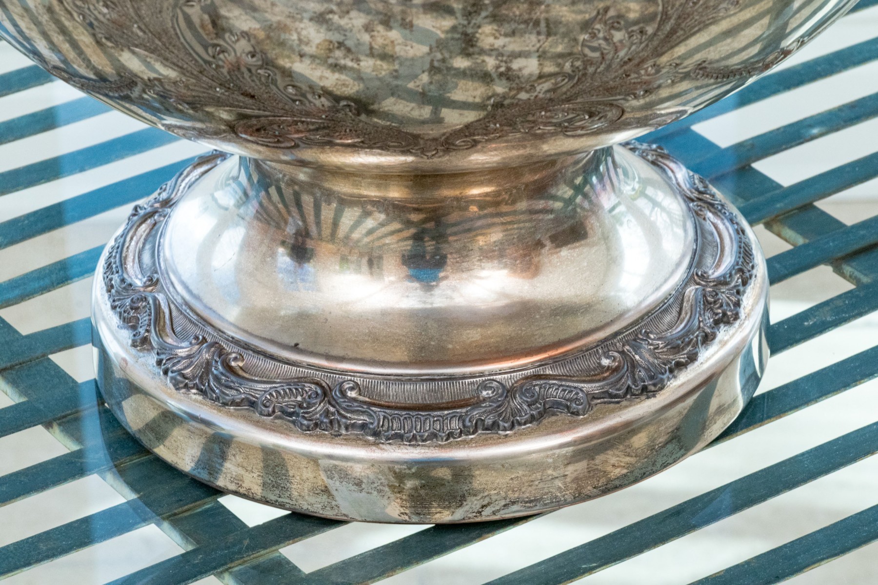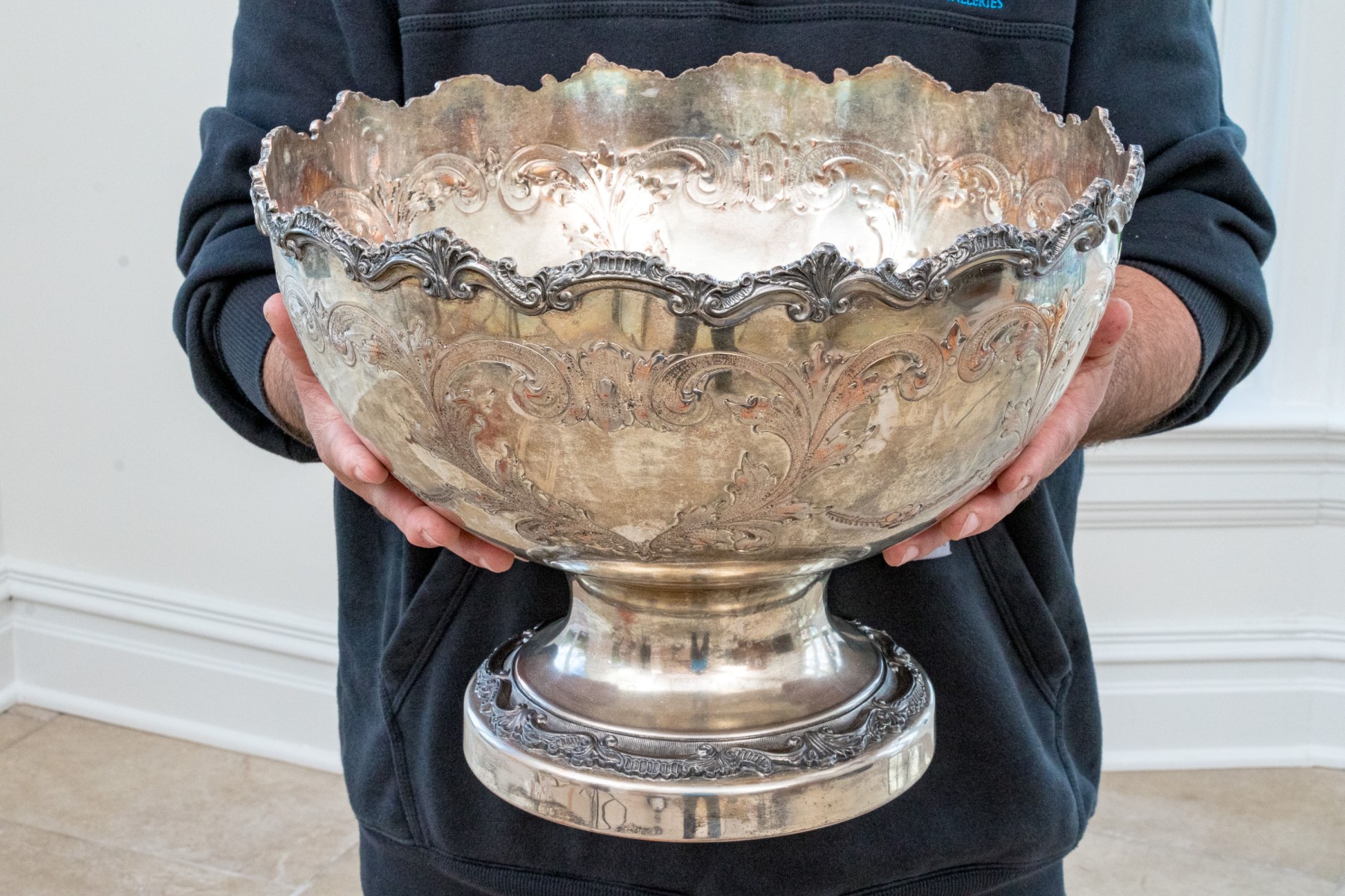 A massive English silver plated punch bowl with an ornate, scalloped rim.