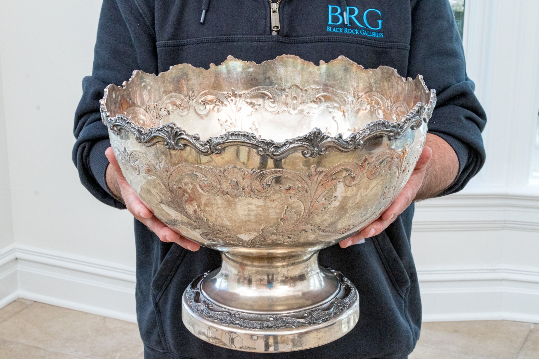 Massive English Silver Plated Punch Bowl #315927. Black Rock Galleries provides high end estate liquidation services through online estate auctions and a 50,000 sq ft designer showroom. estate liquidator, estate sale, online auction, antiques, fine art, liquidation, clean outs, auction, consignment, interior design, fine jewelry, collectibles, appraisals, estate appraisals, estate services, decor, furniture, furniture consignment, antique center, consignment shop. We offer appraisal services and specialize in fine art, jewelry, antiques and decorative arts. Sell with us. Black Rock Galleries is the tri-state's largest estate liquidator serving New England and the greater New York City area. We are the trusted source for expert appraisals, auction services, estate sales, and consignments. Black Rock Galleries is the east coast's largest and most trusted estate liquidator, with locations in Connecticut, greater Boston, MA and Raleigh, NC, Fairfield, Southport, Apex, TX. We are the best source for expert appraisals, auction services, estate sales and consignments. We have served thousands of families and estates with compassion, professionalism and expertise. BRG works with attorneys, executors, realtors and families to bring the greatest return on personal and estate property in the current market. Our unique combination of services make us the easy choice to get the job done in a timely and stress-free manner. We are with you from the initial consultation to the final clean out. Our house-built online auction software platform offers clients a dynamic approach to liquidating their personal property. This venue is most successful in bringing the best return with the least amount of disruption for our clients. See our services page for a complete description of this offering. Massive English Silver Plated Punch Bowl #315927