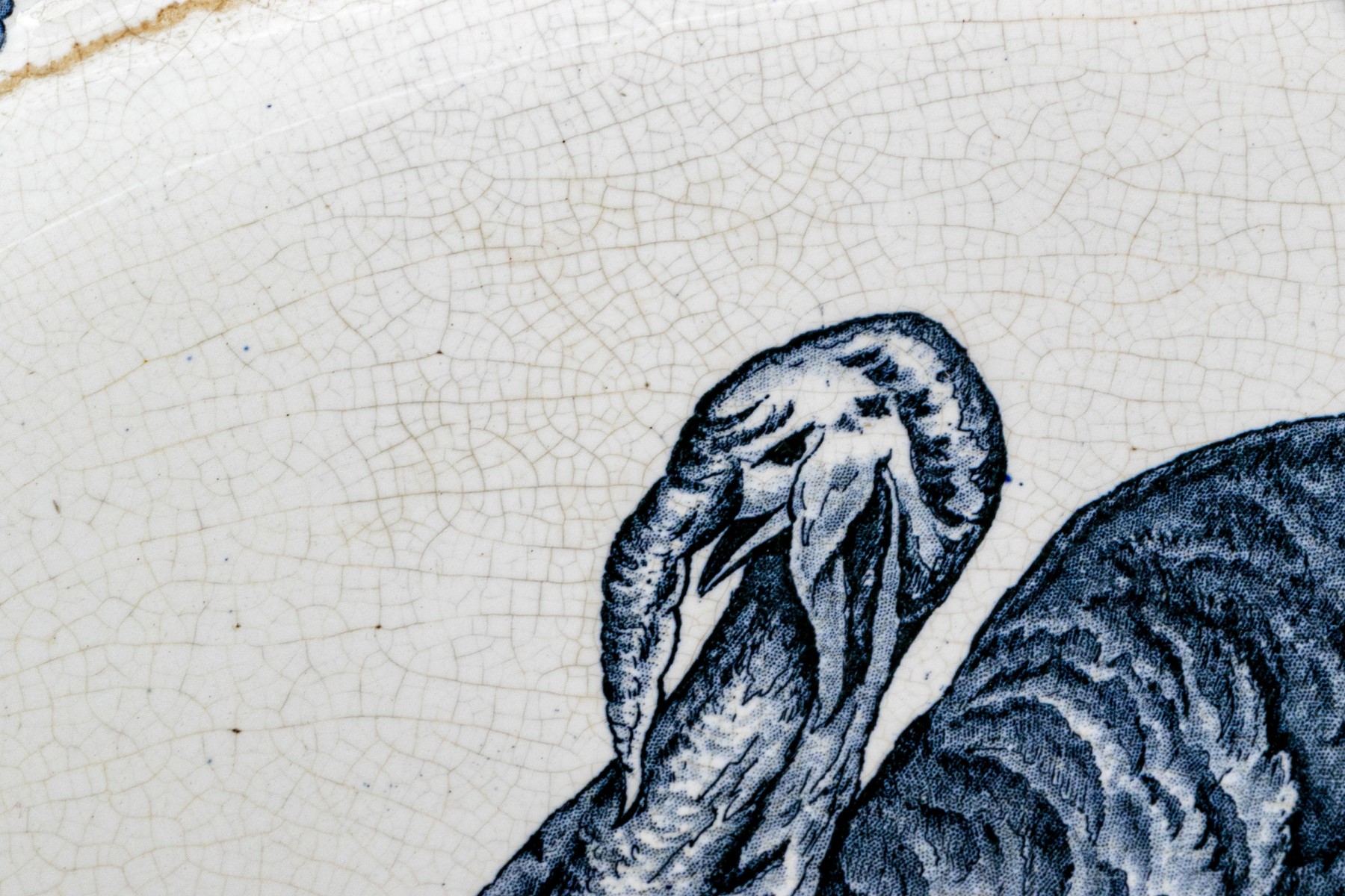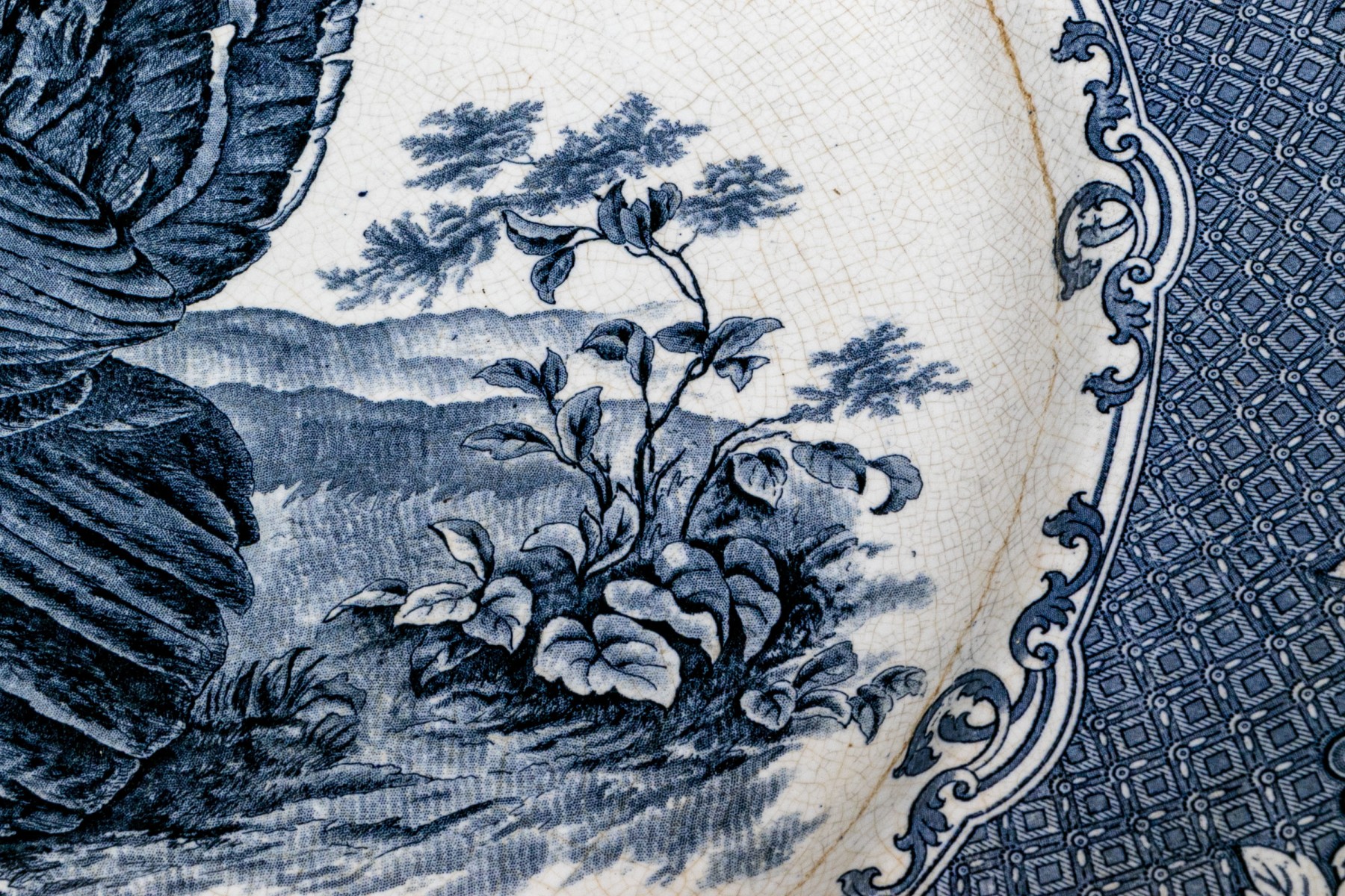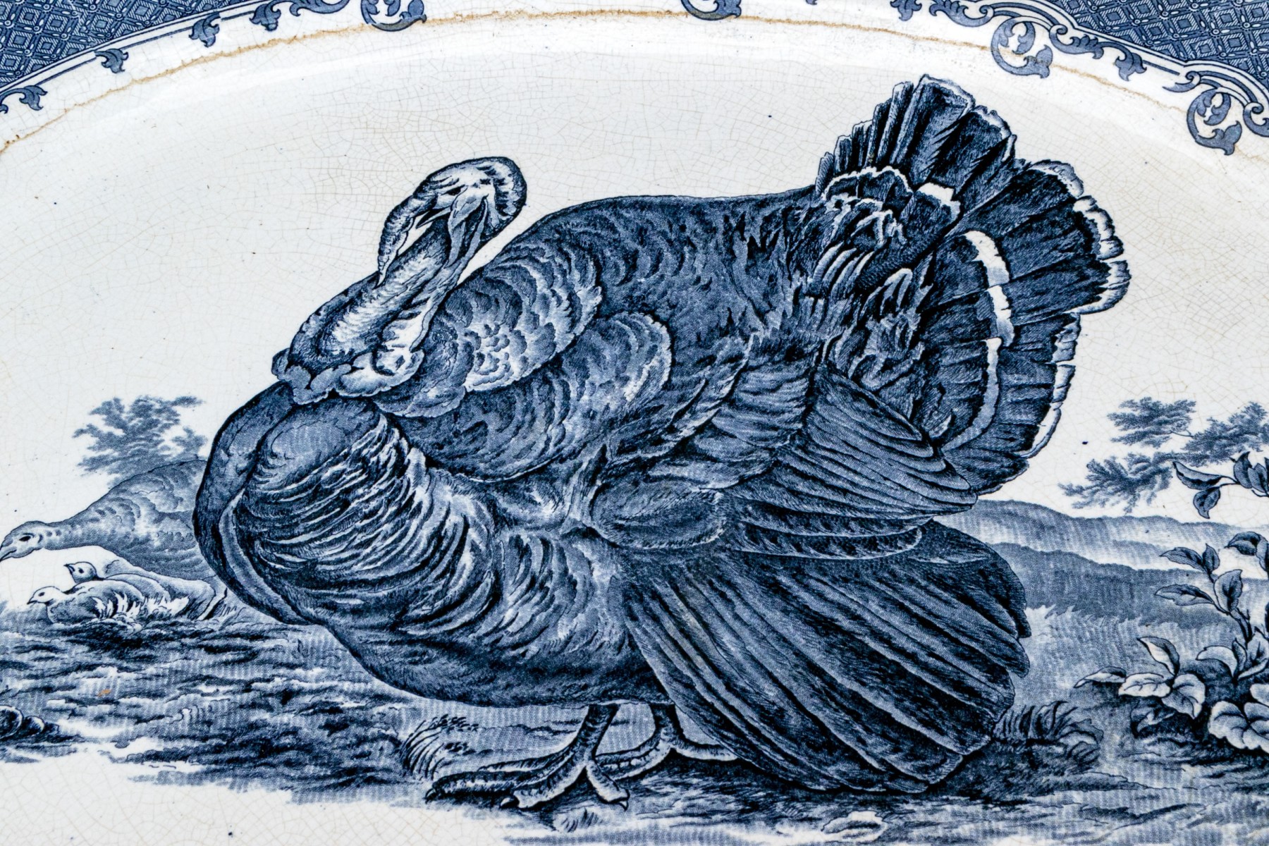 This impressive English transfer ware blue and white piece features a central turkey reserve, surrounded by a fabulously decorative border with intricate leaf motifs around the trim. The bold design and detailed craftsmanship make it a striking centerpiece for any collection or dining setting.