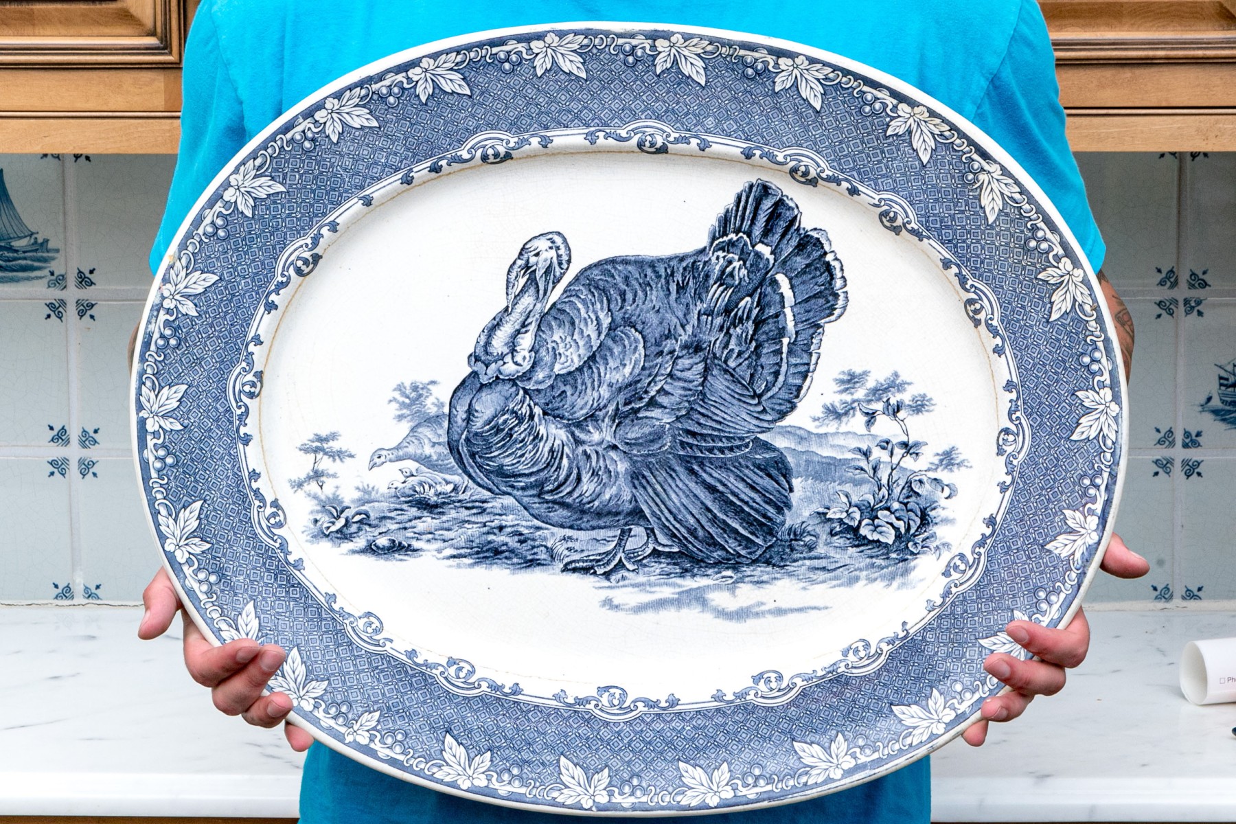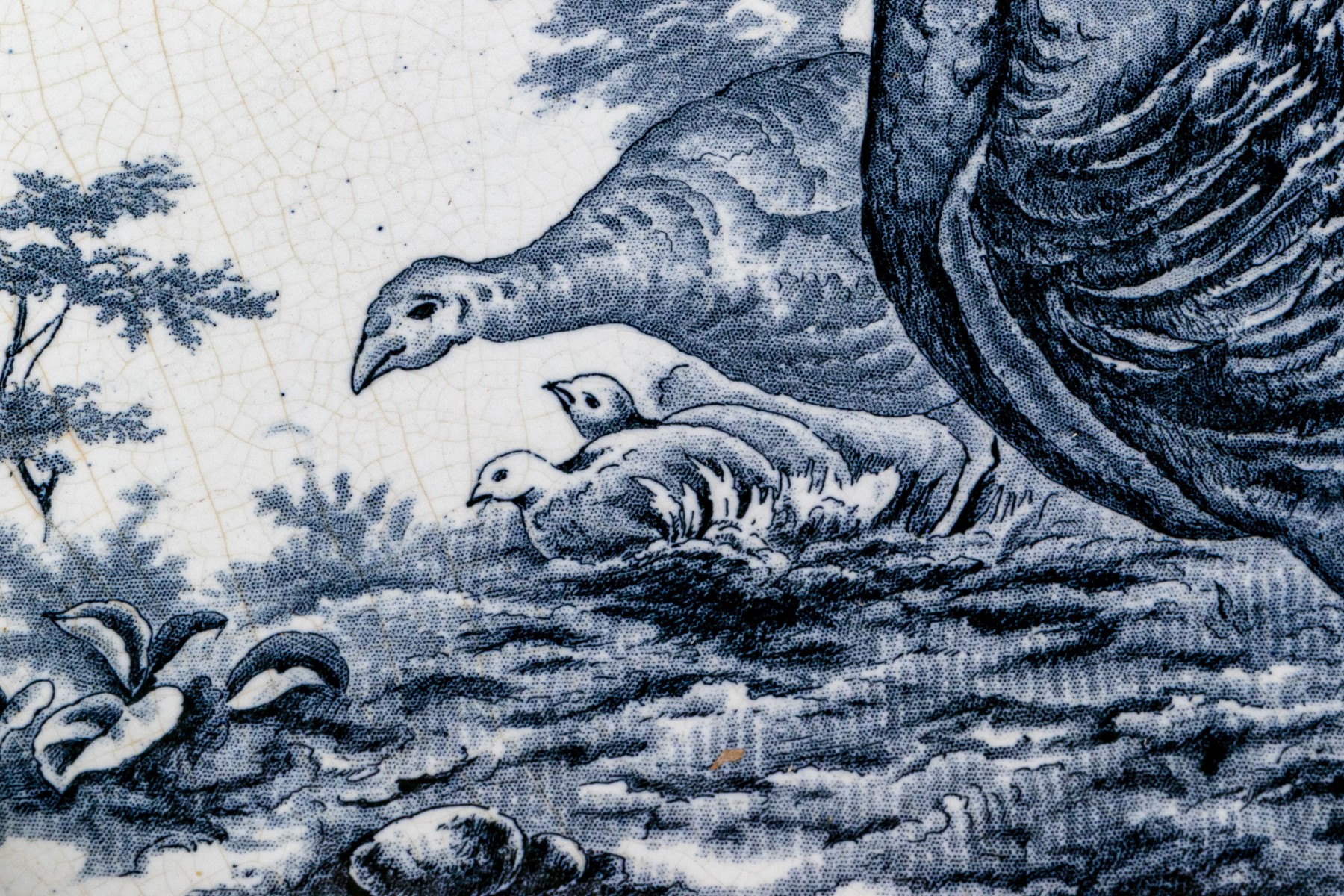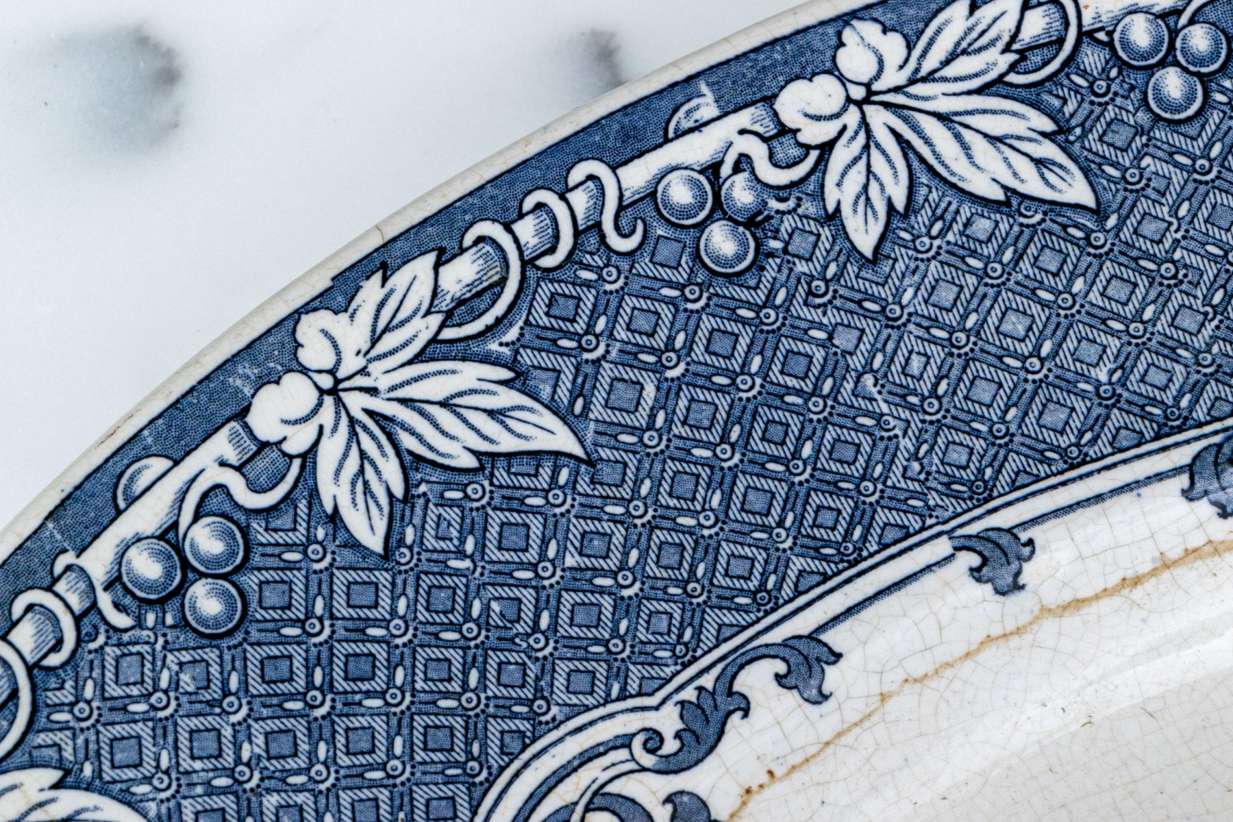 This impressive English transfer ware blue and white piece features a central turkey reserve, surrounded by a fabulously decorative border with intricate leaf motifs around the trim. The bold design and detailed craftsmanship make it a striking centerpiece for any collection or dining setting.