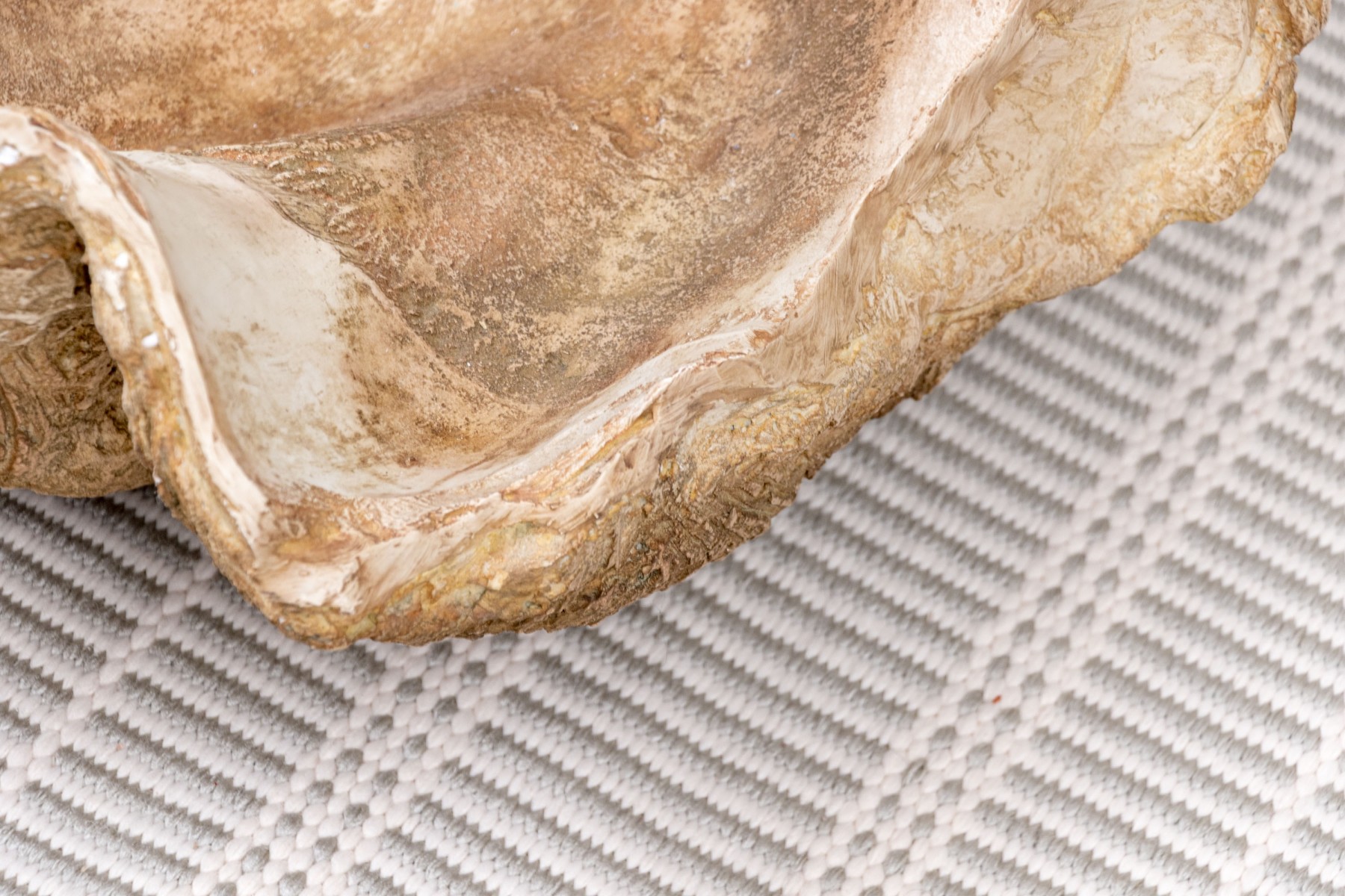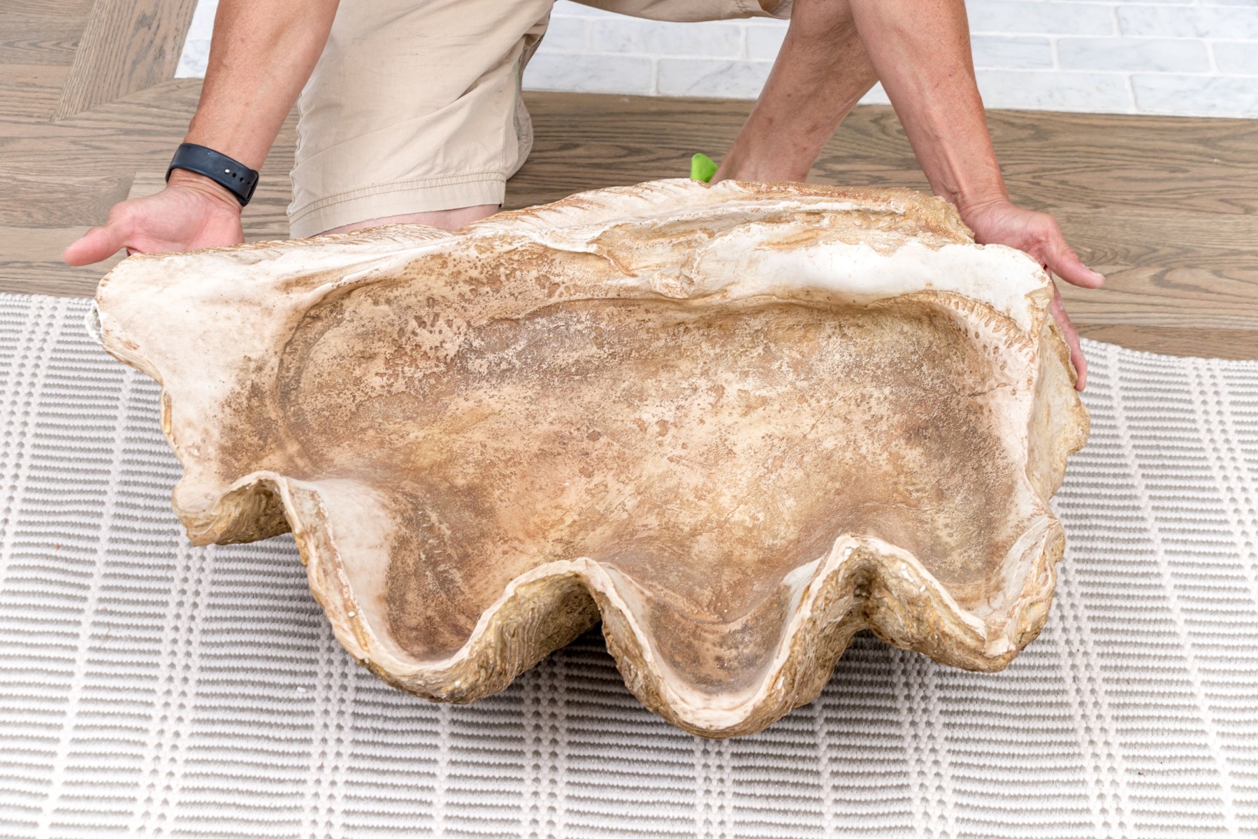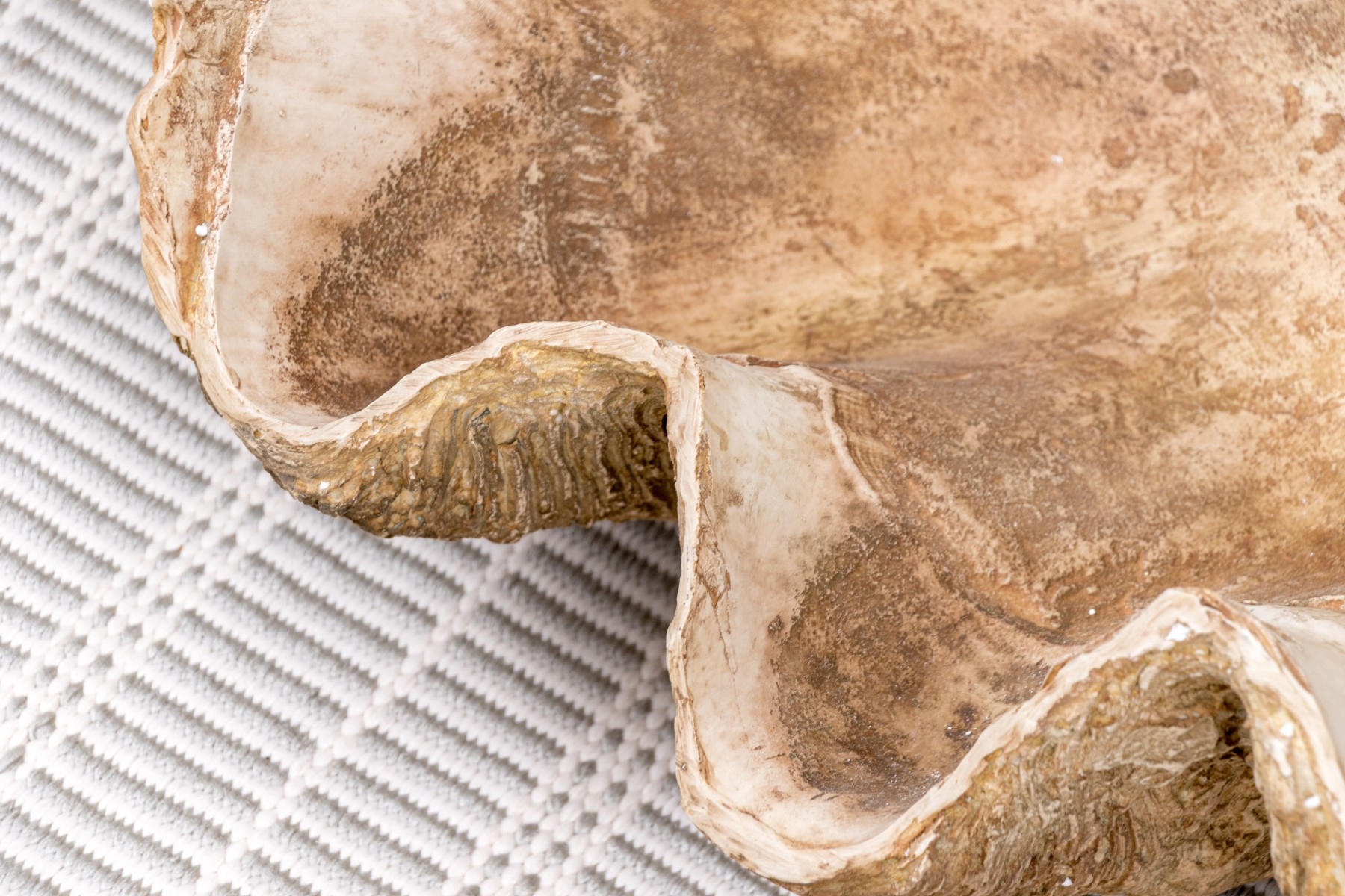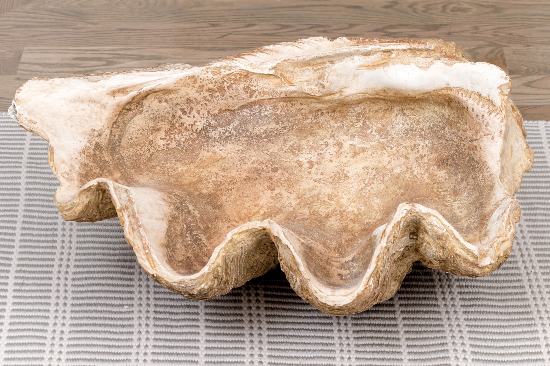 An oversized plaster sculpture of a giant clam shell in naturalistic detail, hand-painted with beautiful brown and cream hues along a deeply undulating form.