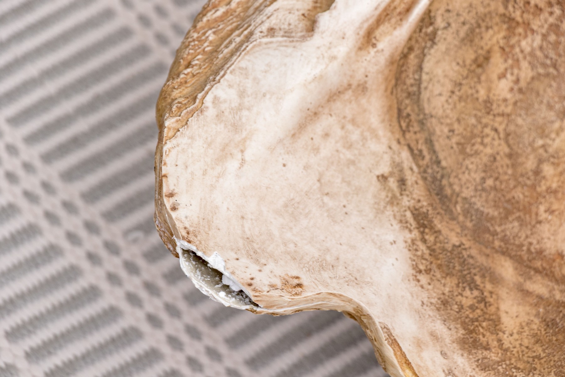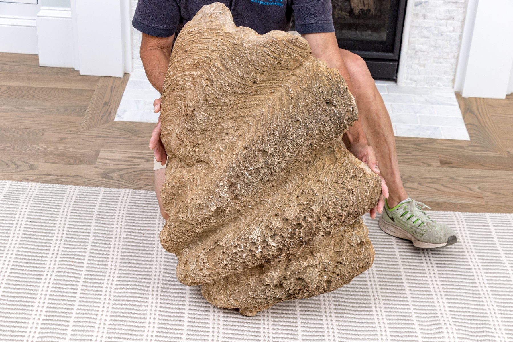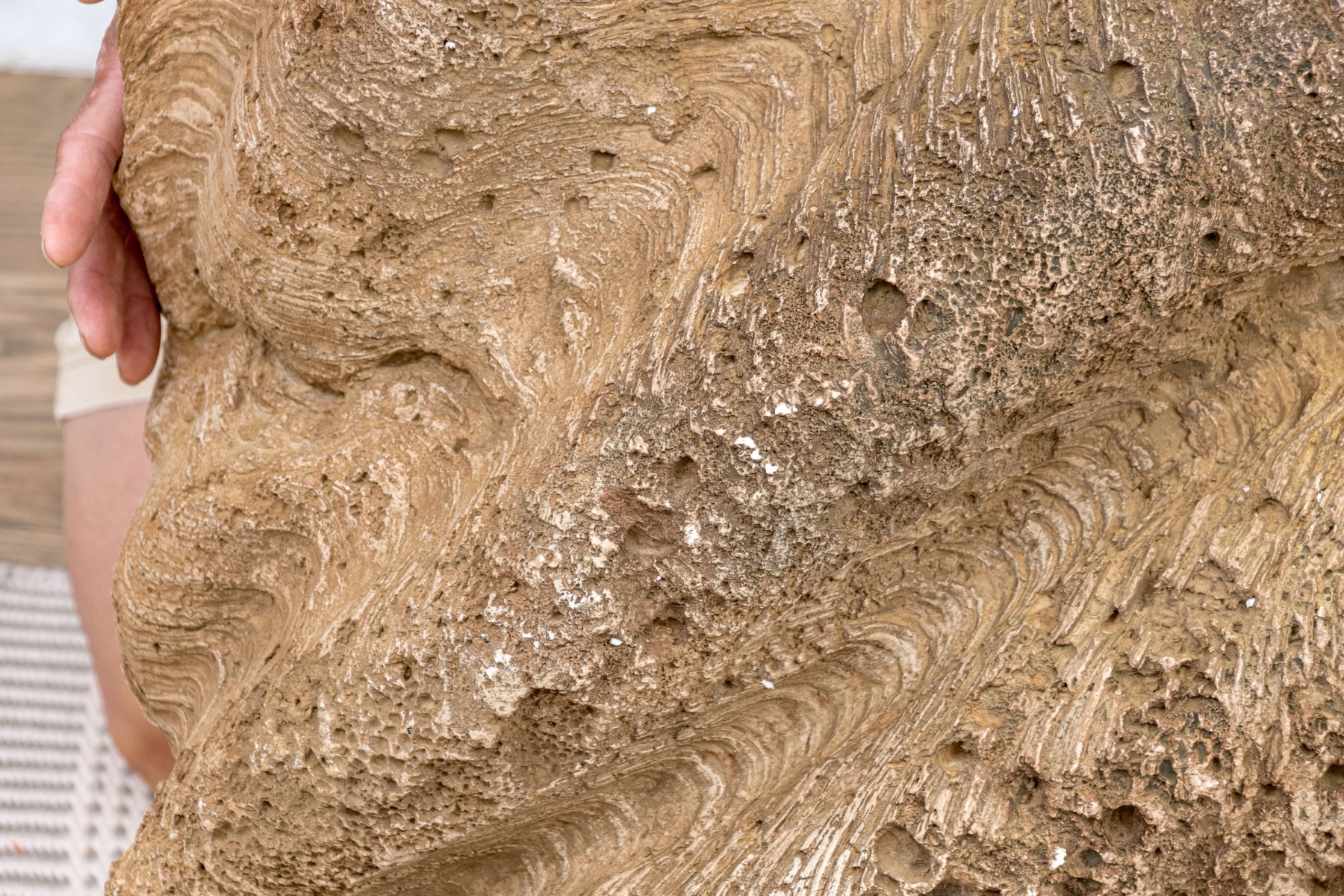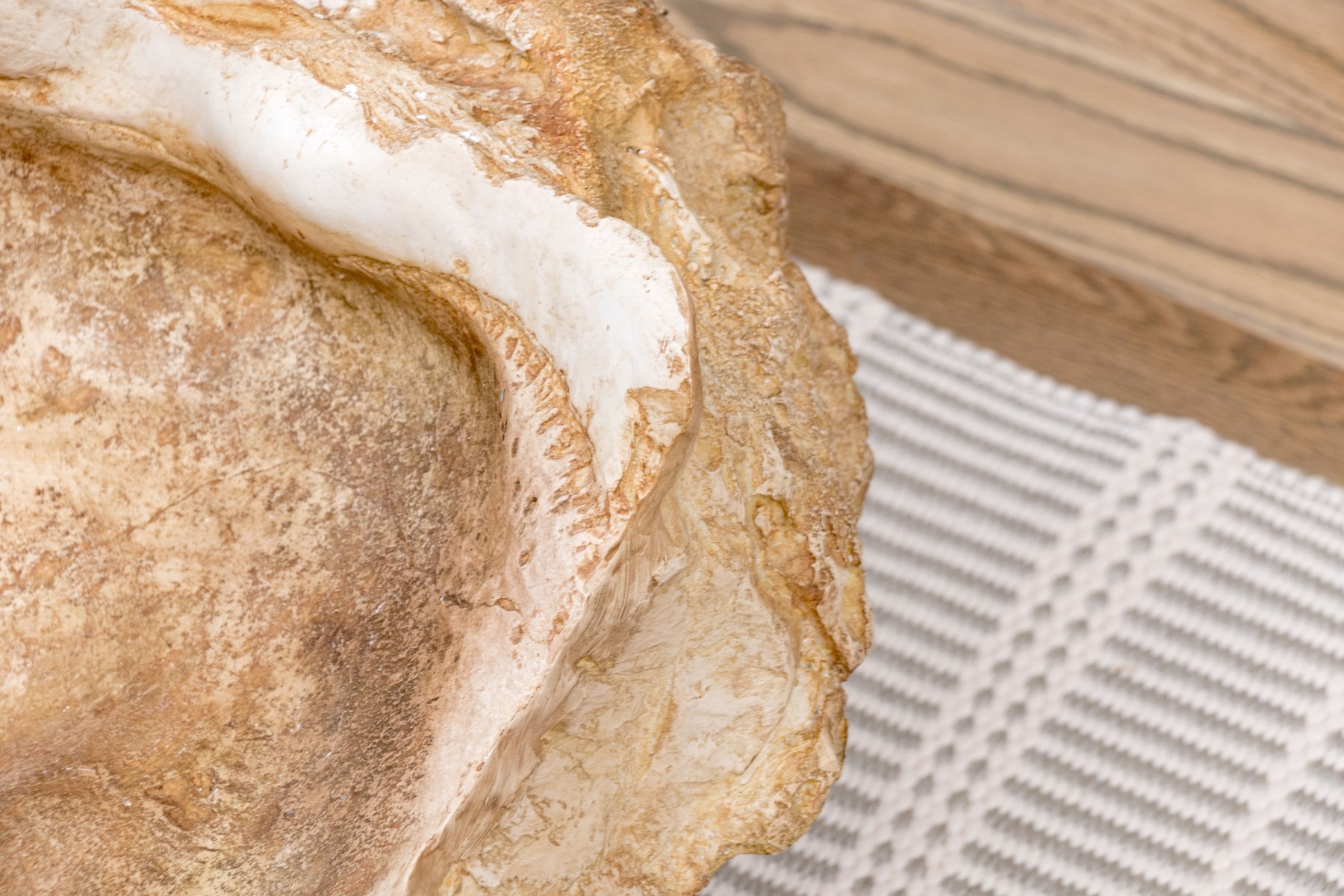 An oversized plaster sculpture of a giant clam shell in naturalistic detail, hand-painted with beautiful brown and cream hues along a deeply undulating form.