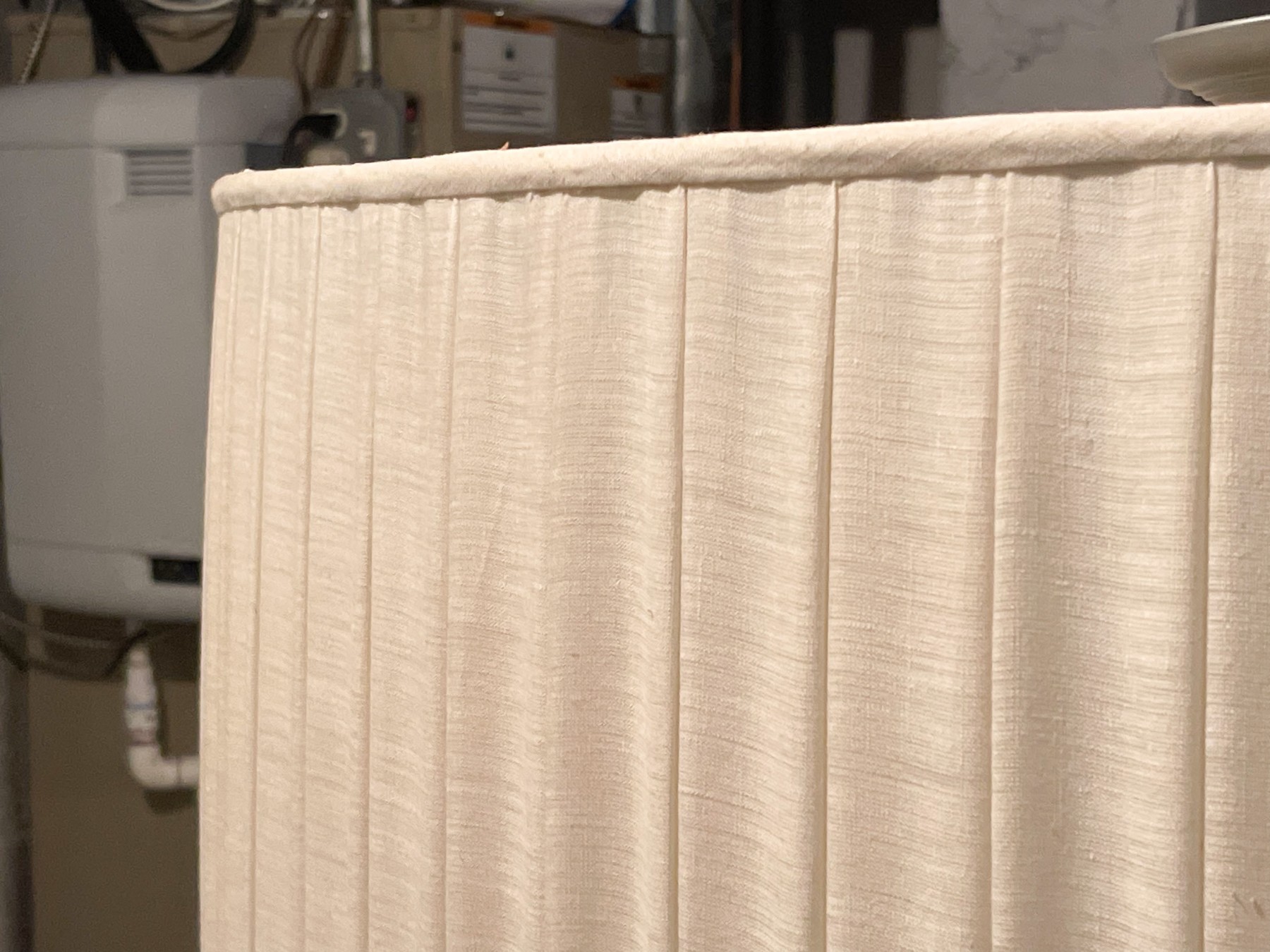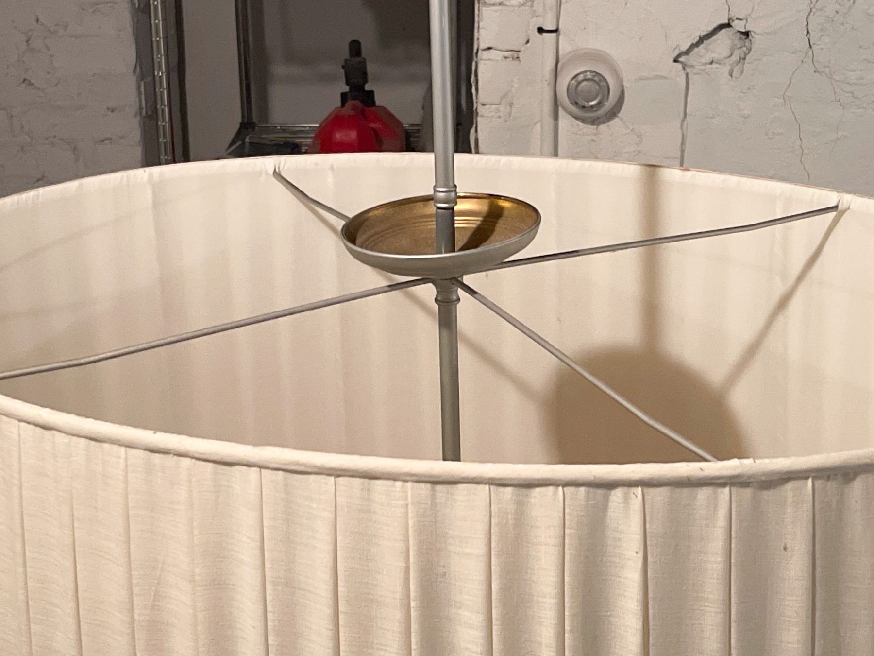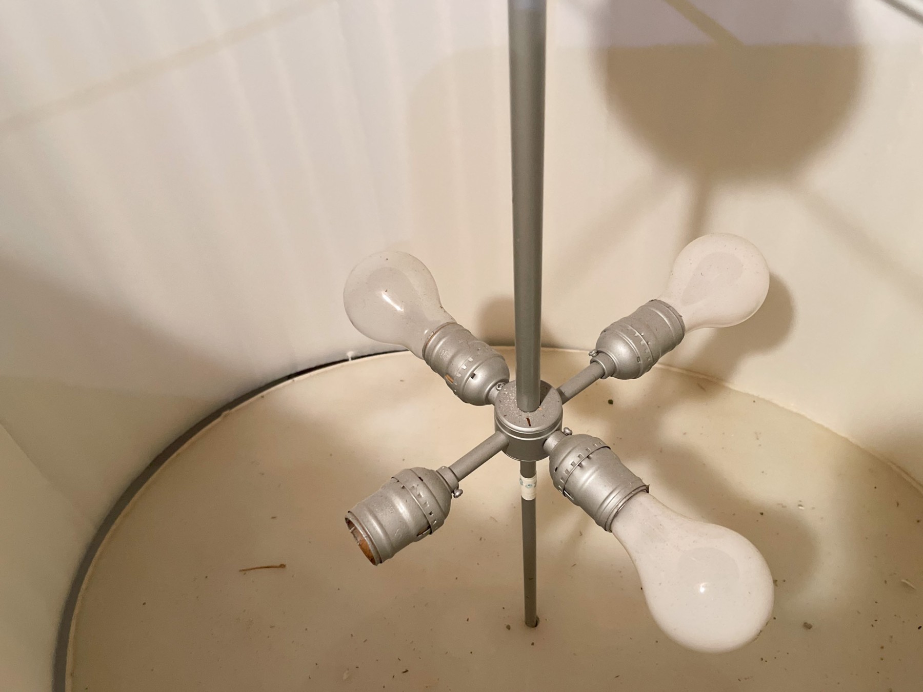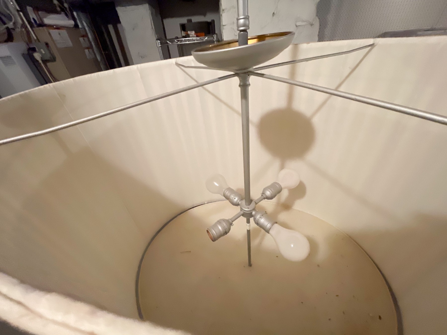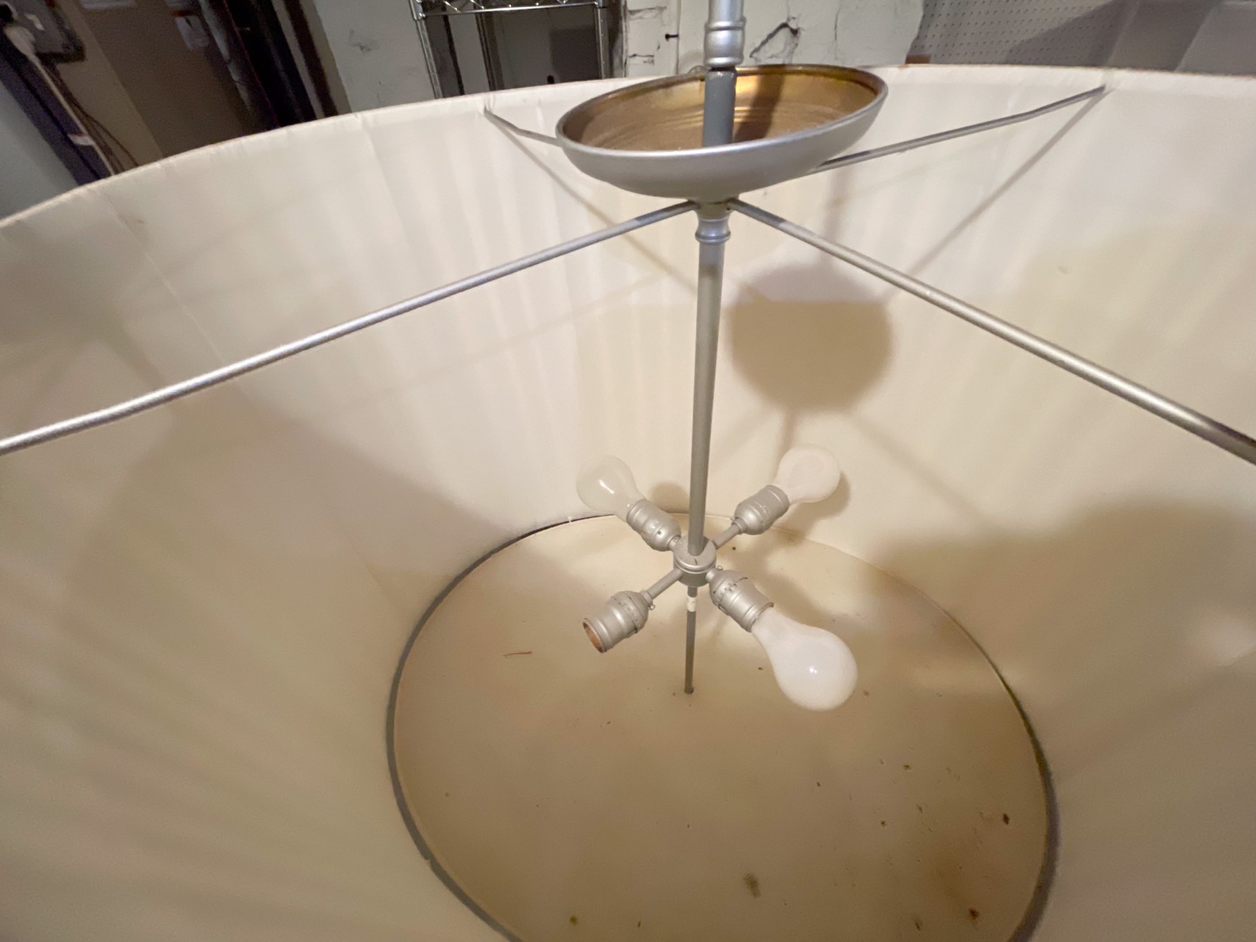 Off white linen, brushed chrome style finish. Four bulbs with diffuser.