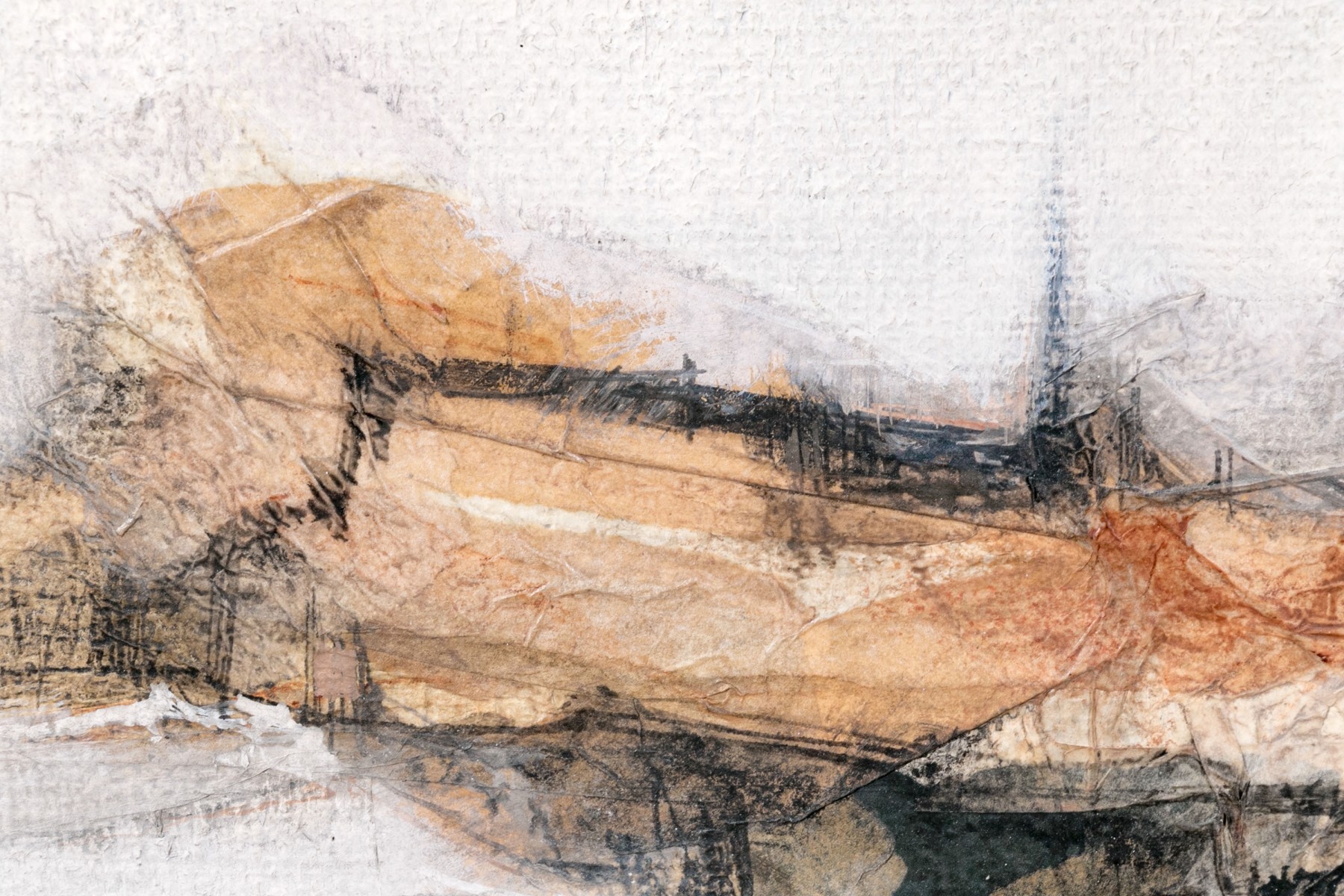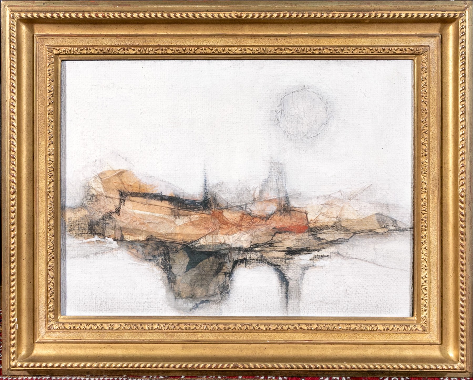 Signed and dated 29 February 64 on verso. A wonderful collage of painted textured paper cut outs mounted on hopsack cloth on a stretcher. An abstract landscape in rust and black tones under a hazing sun. Presented in a gilt frame.