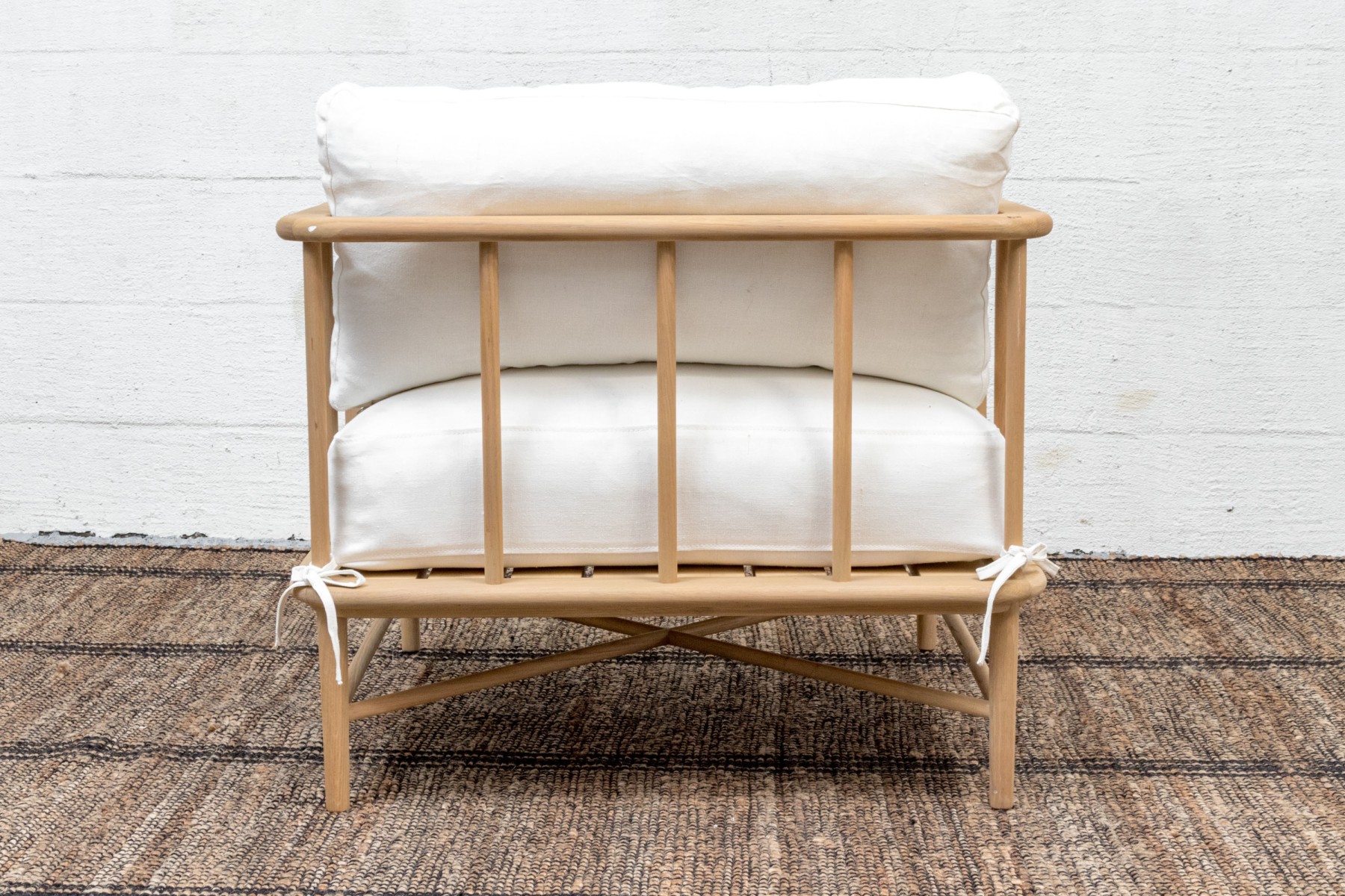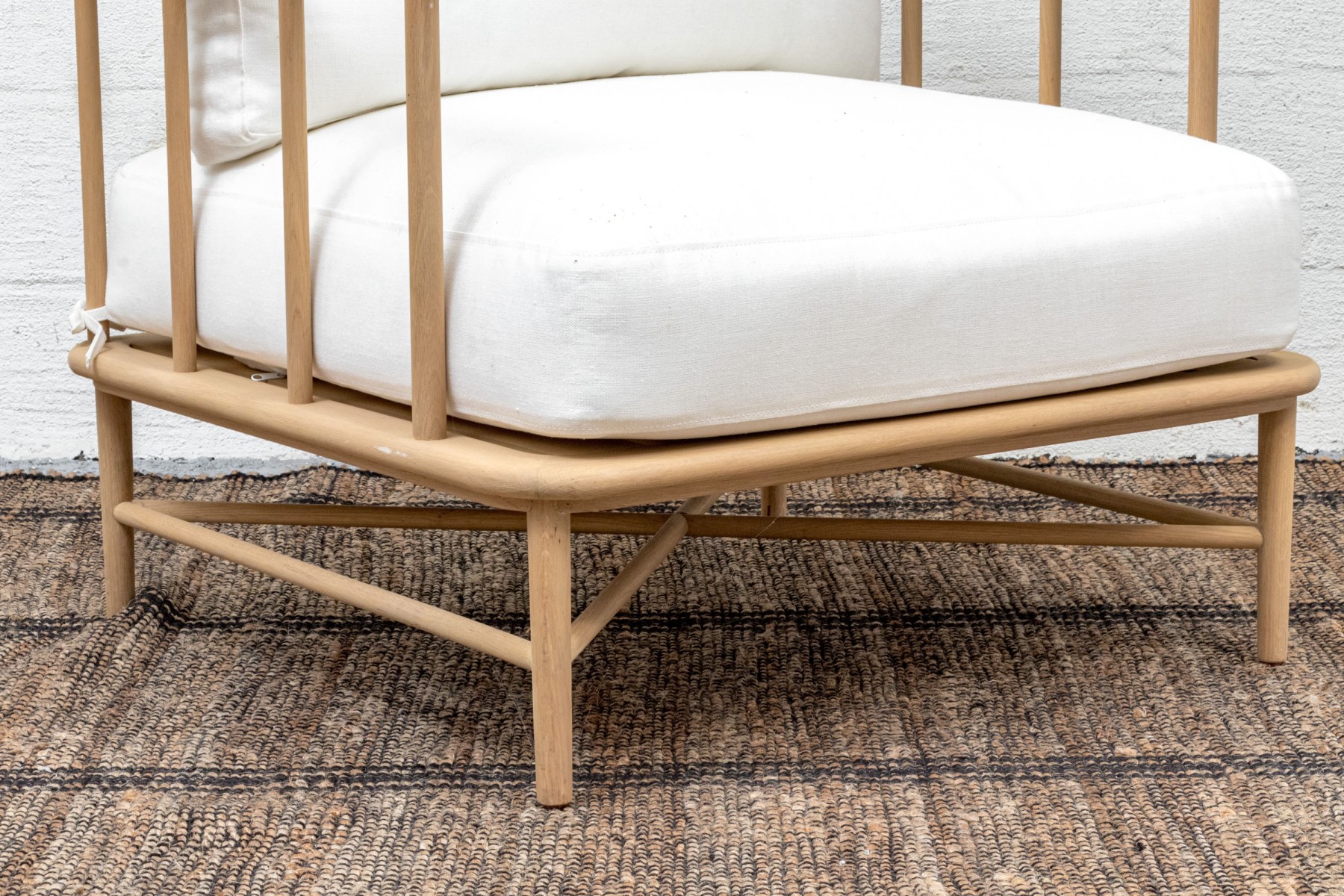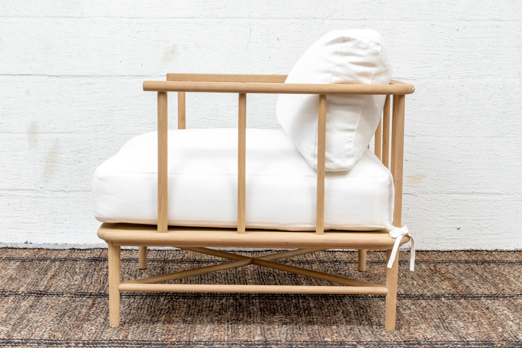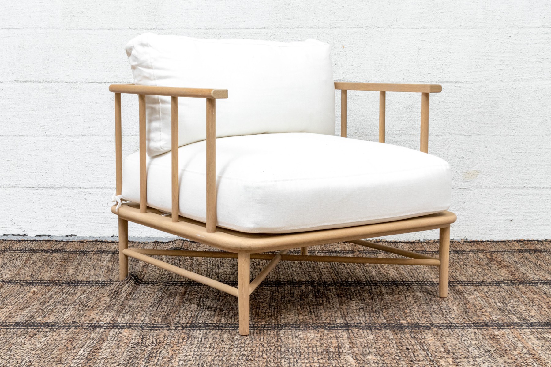 A handsome McGee & Co. "Alma" lounge chair in honeyed natural oak that adds to an easy, relaxed appearance with a loose back and seat cushion in versatile white fabric. The rounded rectangular barrel back adds a stylish, contemporary twist on the traditional form, elevated with dowel railing that maintains an airy aesthetic.