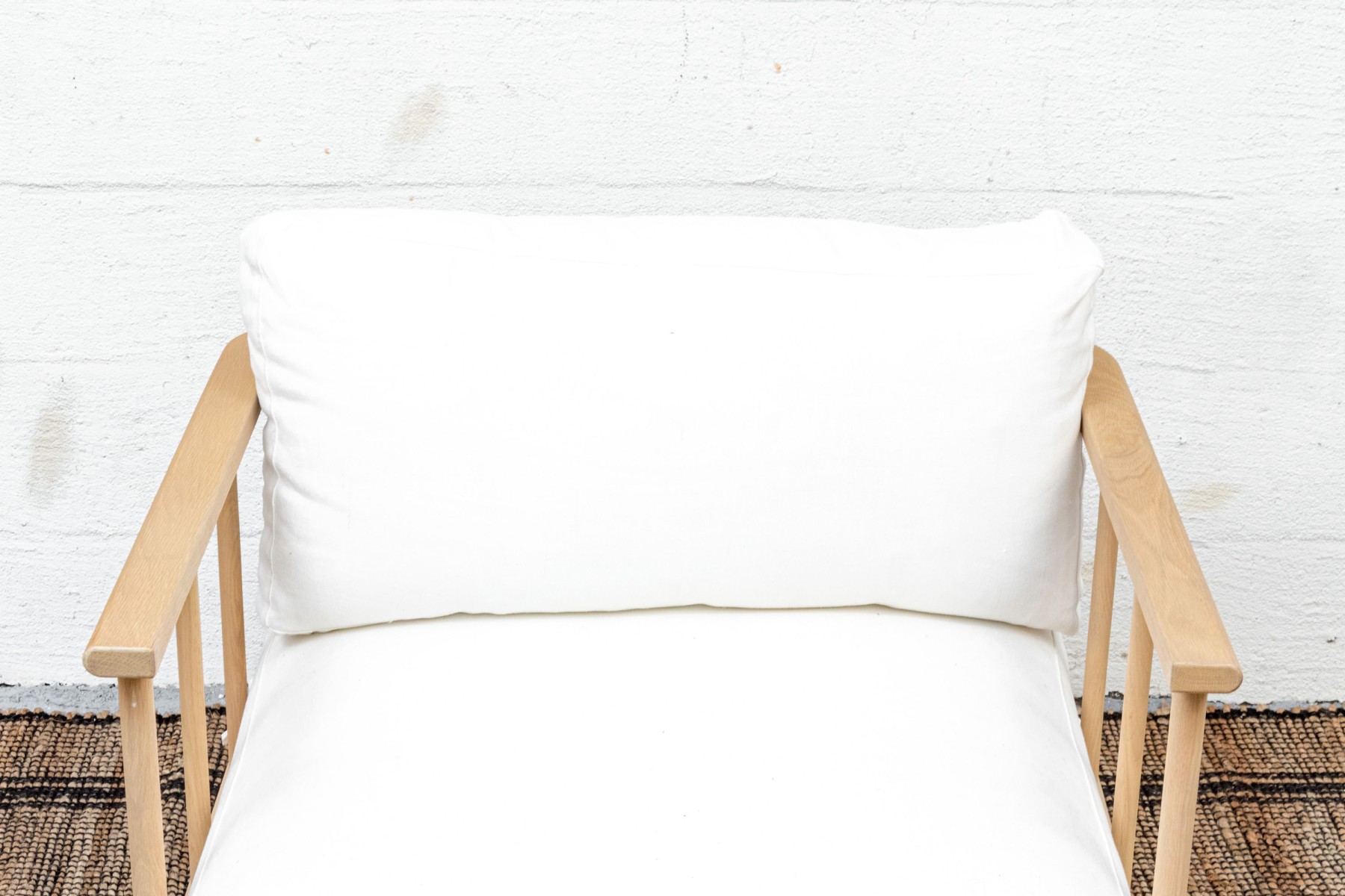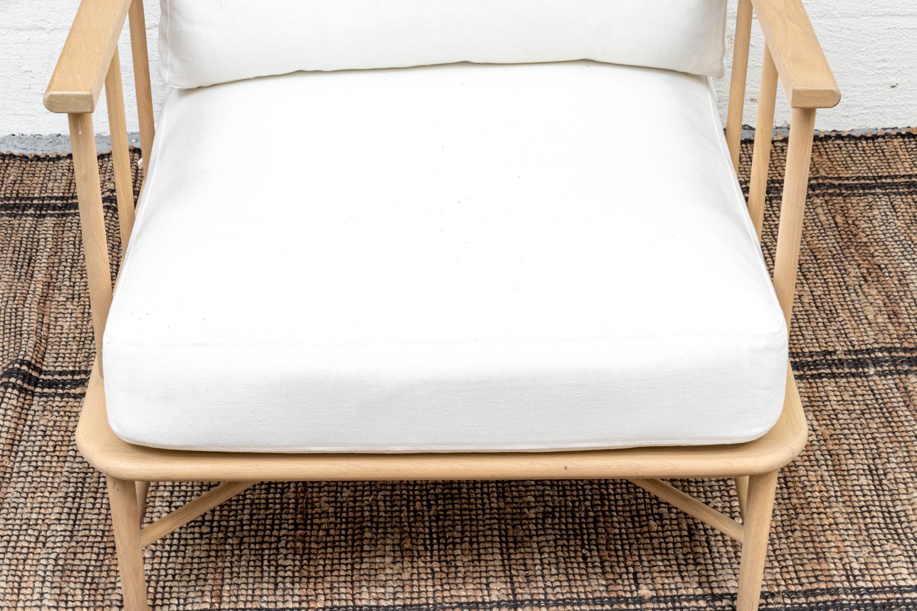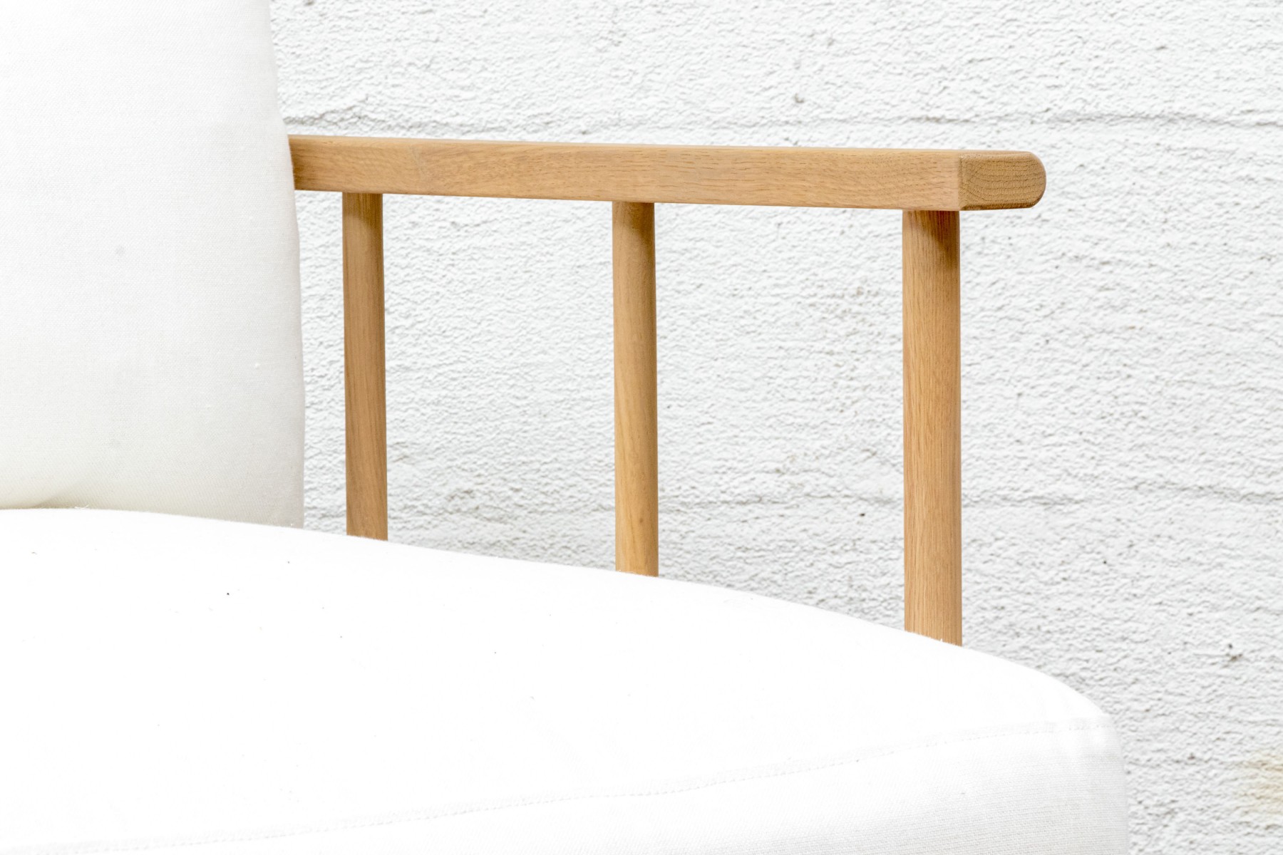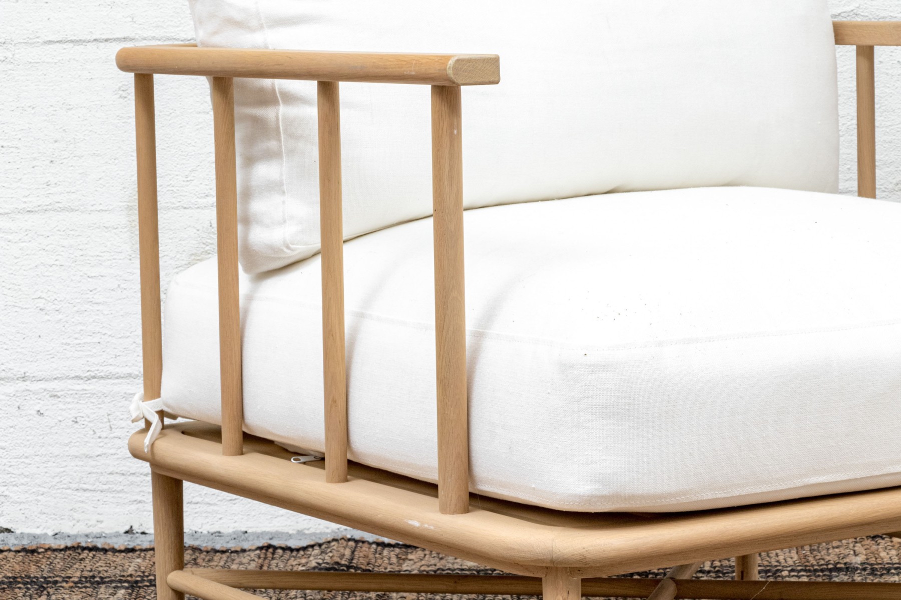 A handsome McGee & Co. "Alma" lounge chair in honeyed natural oak that adds to an easy, relaxed appearance with a loose back and seat cushion in versatile white fabric. The rounded rectangular barrel back adds a stylish, contemporary twist on the traditional form, elevated with dowel railing that maintains an airy aesthetic.
