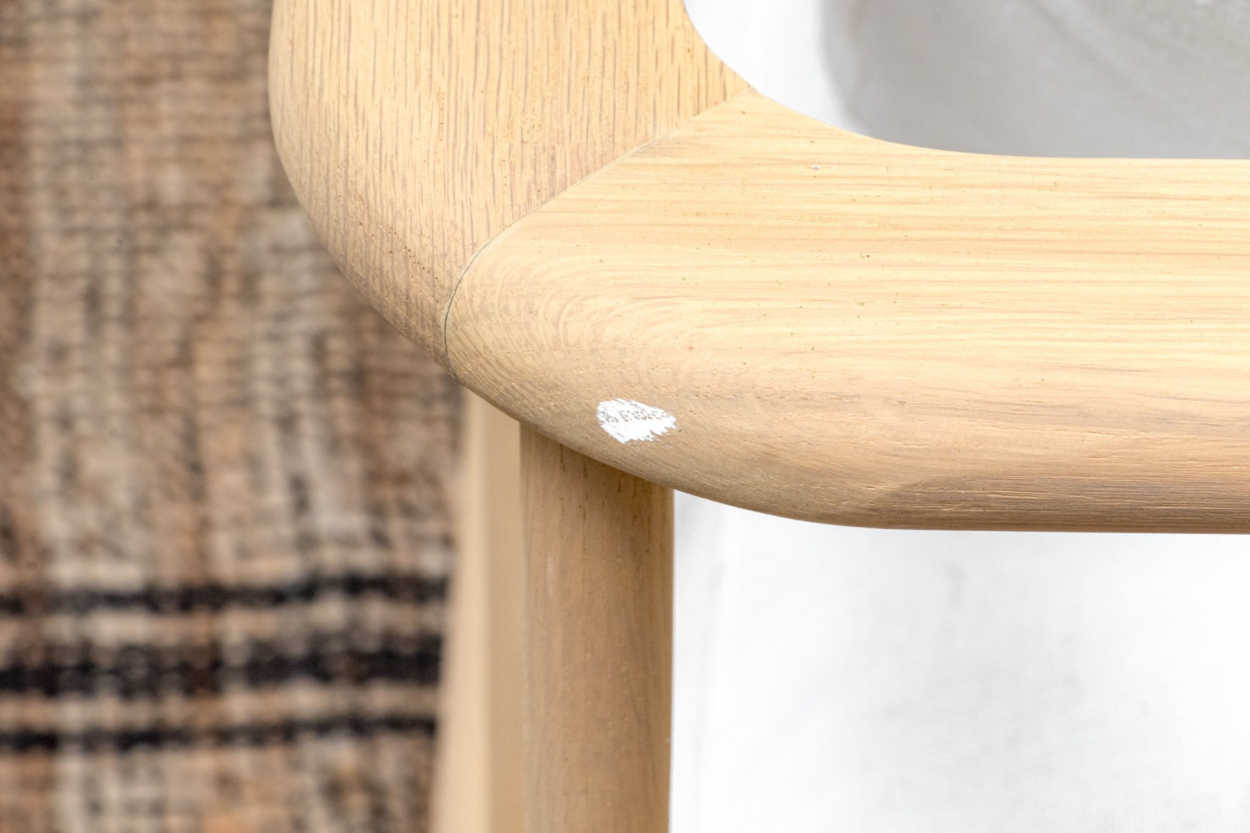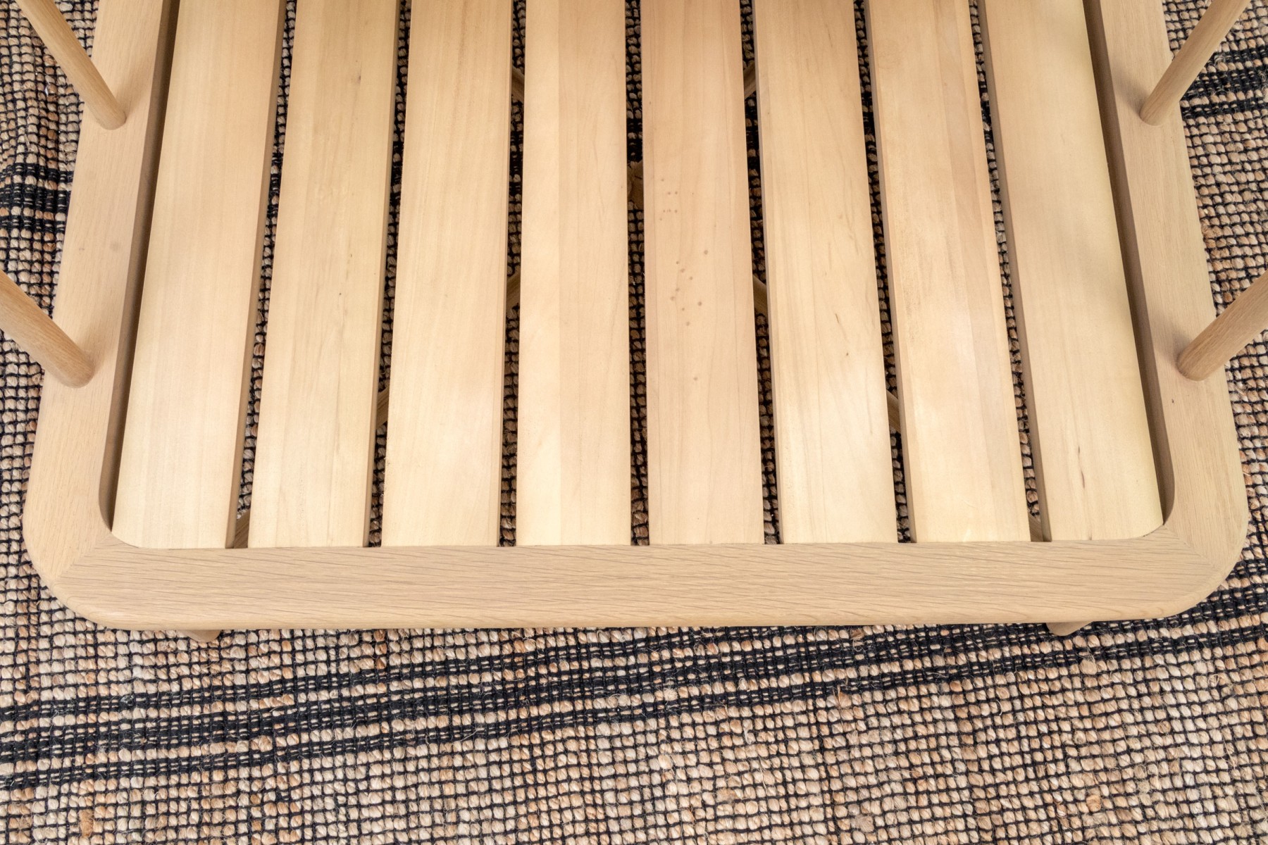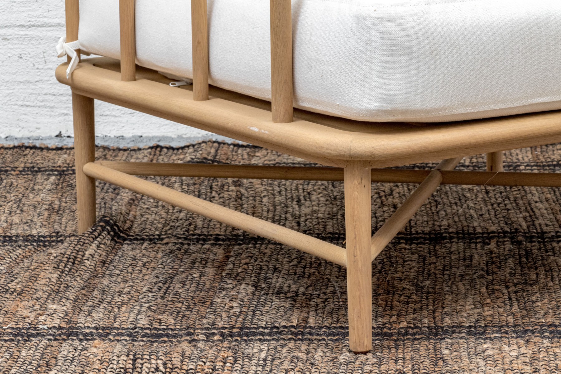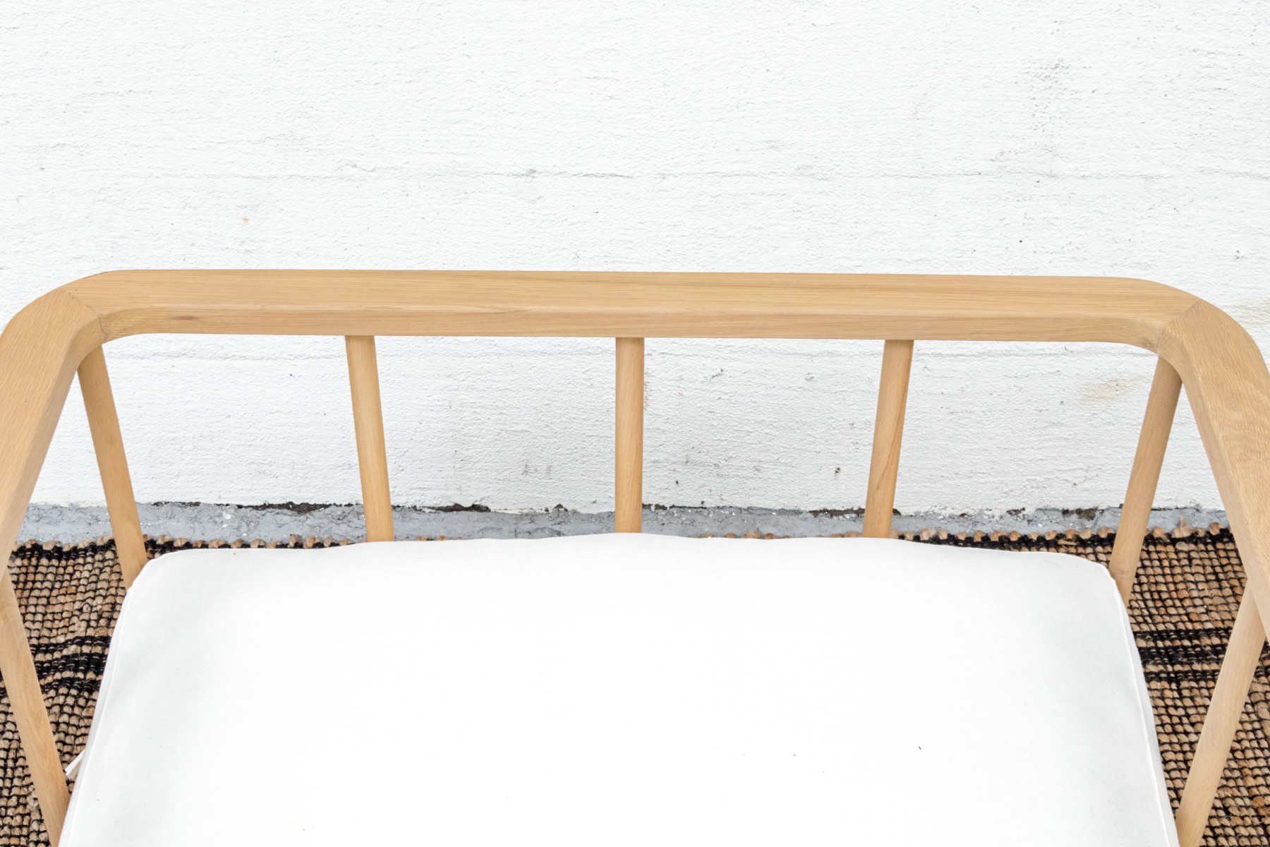 A handsome McGee & Co. "Alma" lounge chair in honeyed natural oak that adds to an easy, relaxed appearance with a loose back and seat cushion in versatile white fabric. The rounded rectangular barrel back adds a stylish, contemporary twist on the traditional form, elevated with dowel railing that maintains an airy aesthetic.
