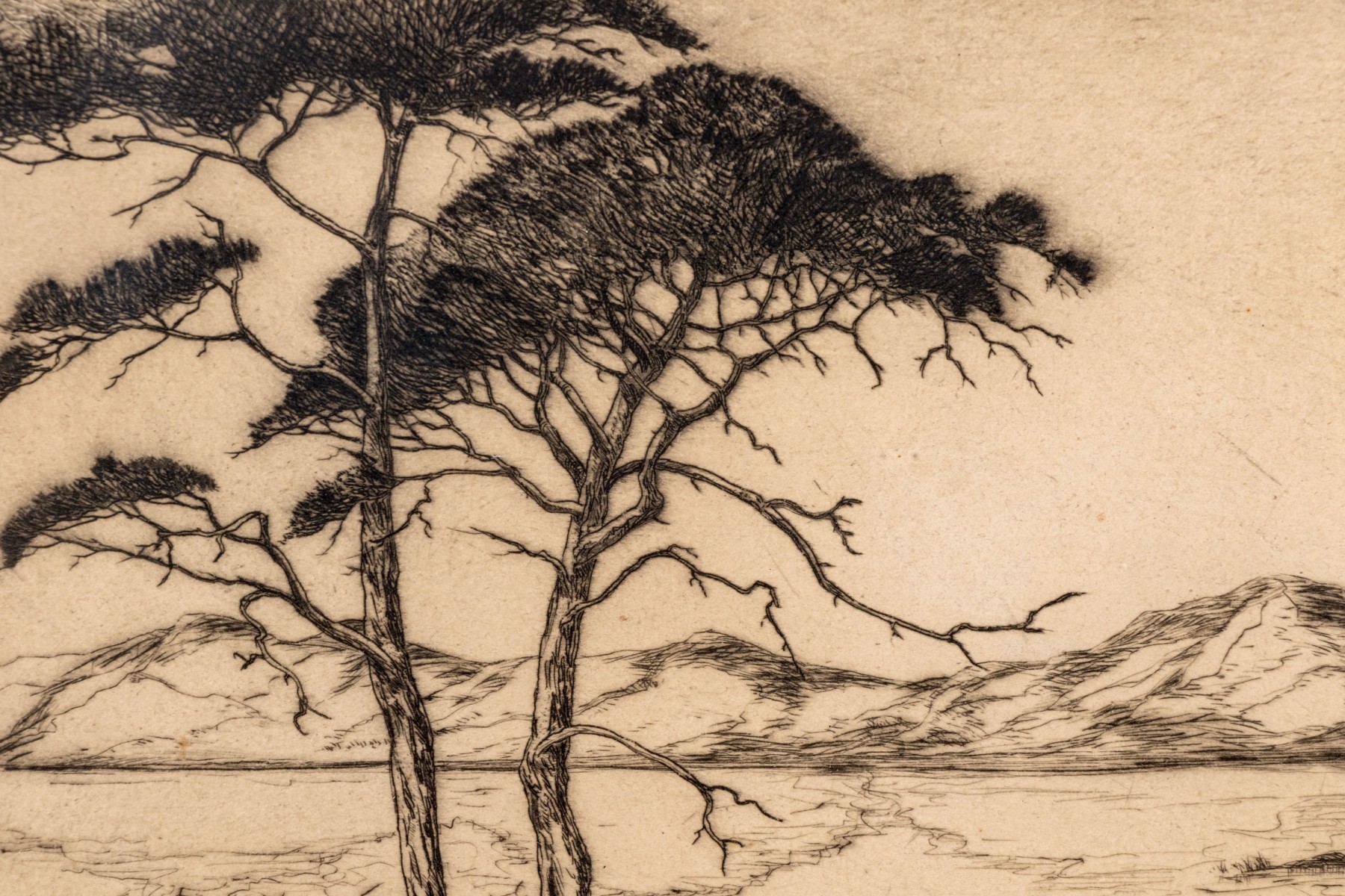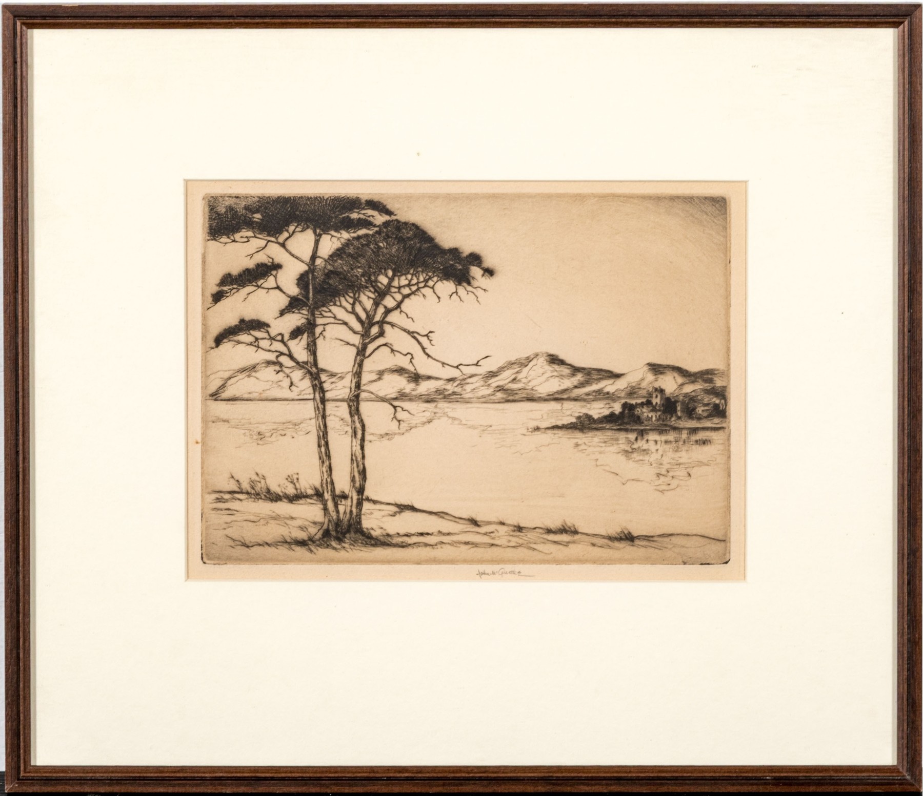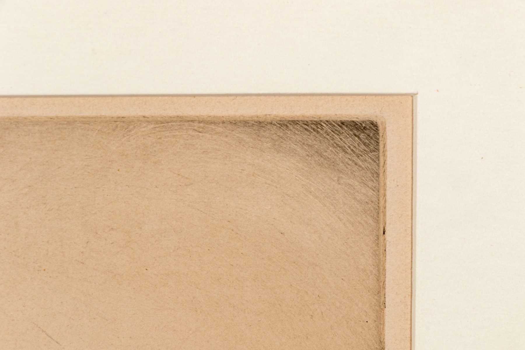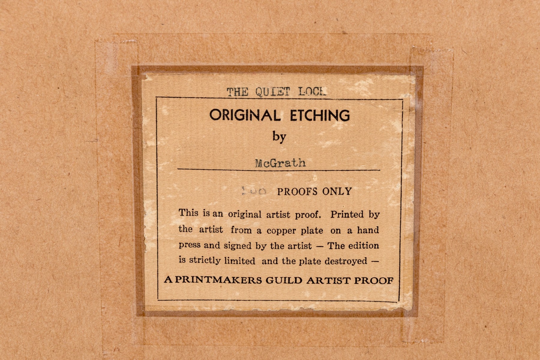 Labeled on verso denoting the work as an original artist proof. A Printmakers Guild Artist Proof. Pencil signed out of plate lower trim. Dimensions: 6 3/8 x 9" W, sight // 12 5/8 x 14 5/8" W, frame.