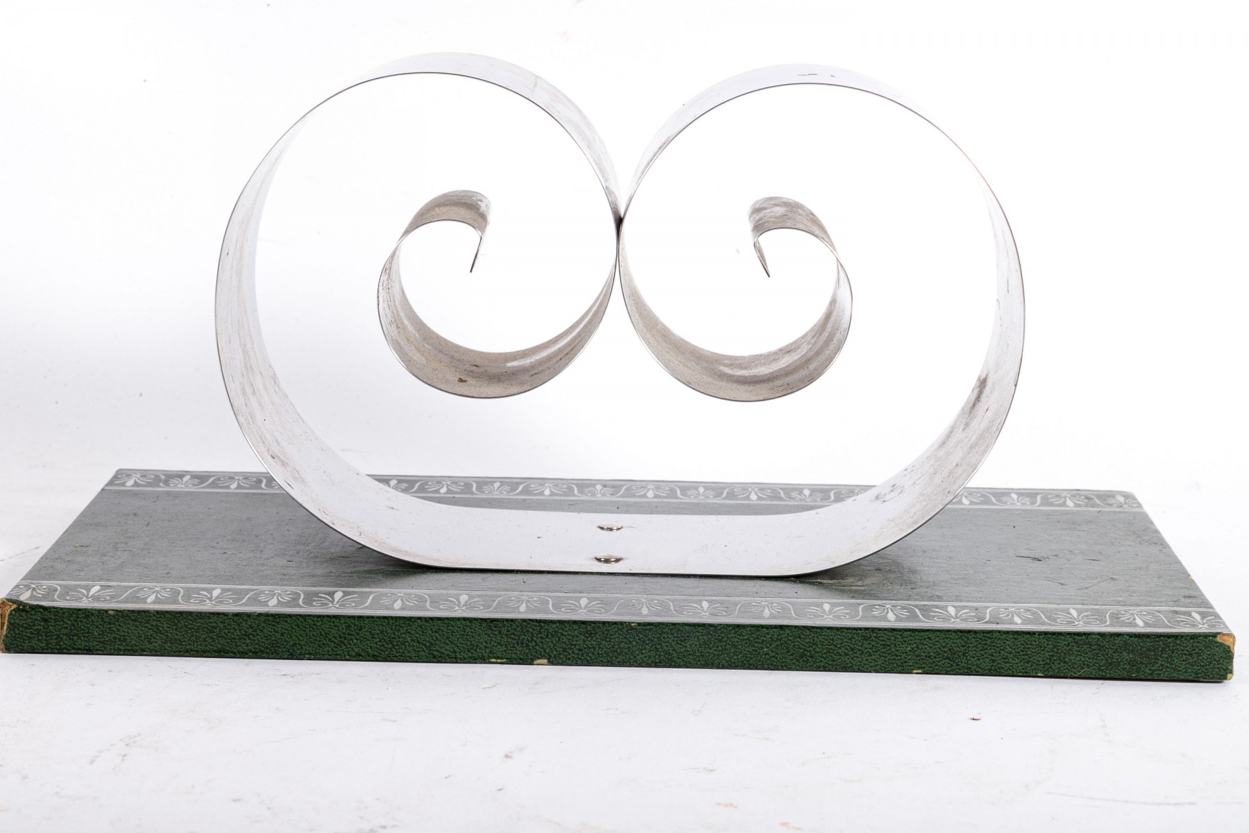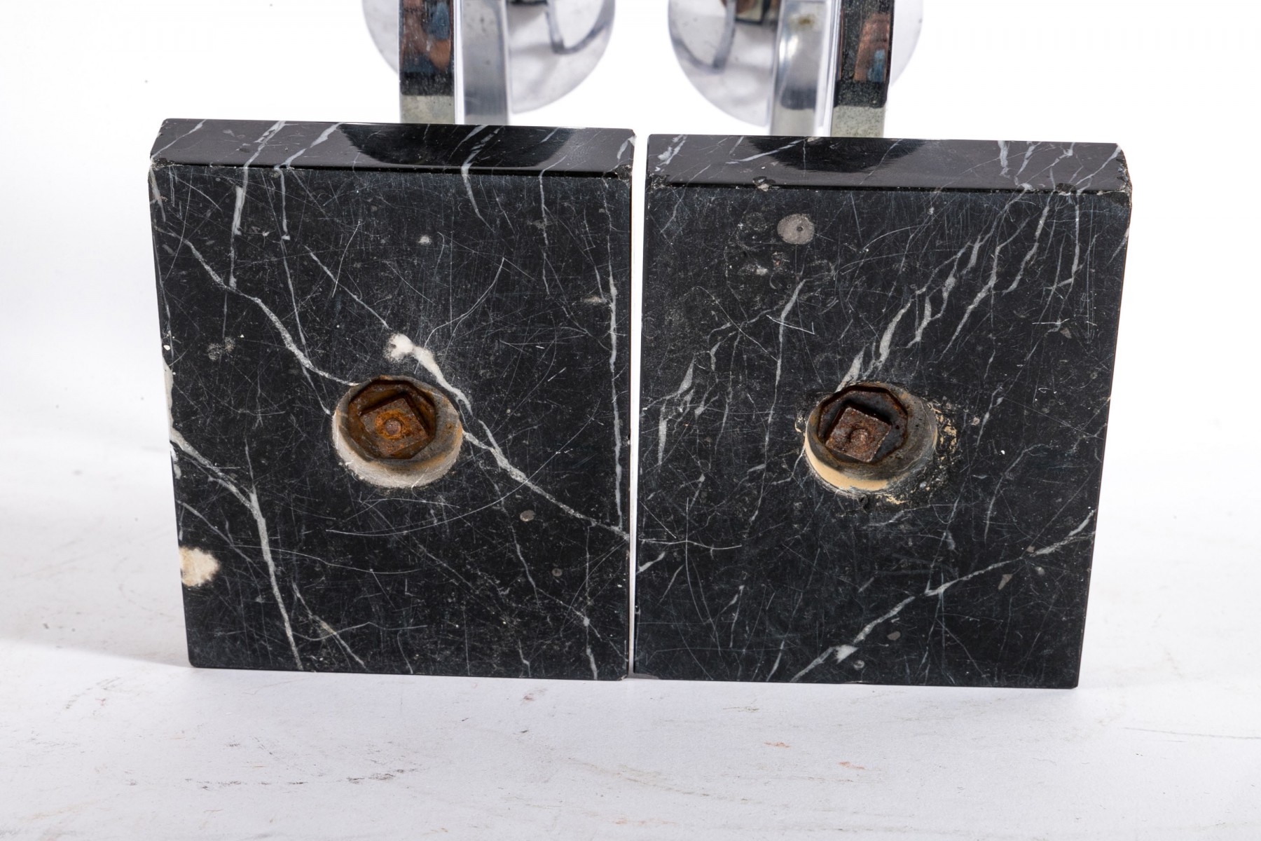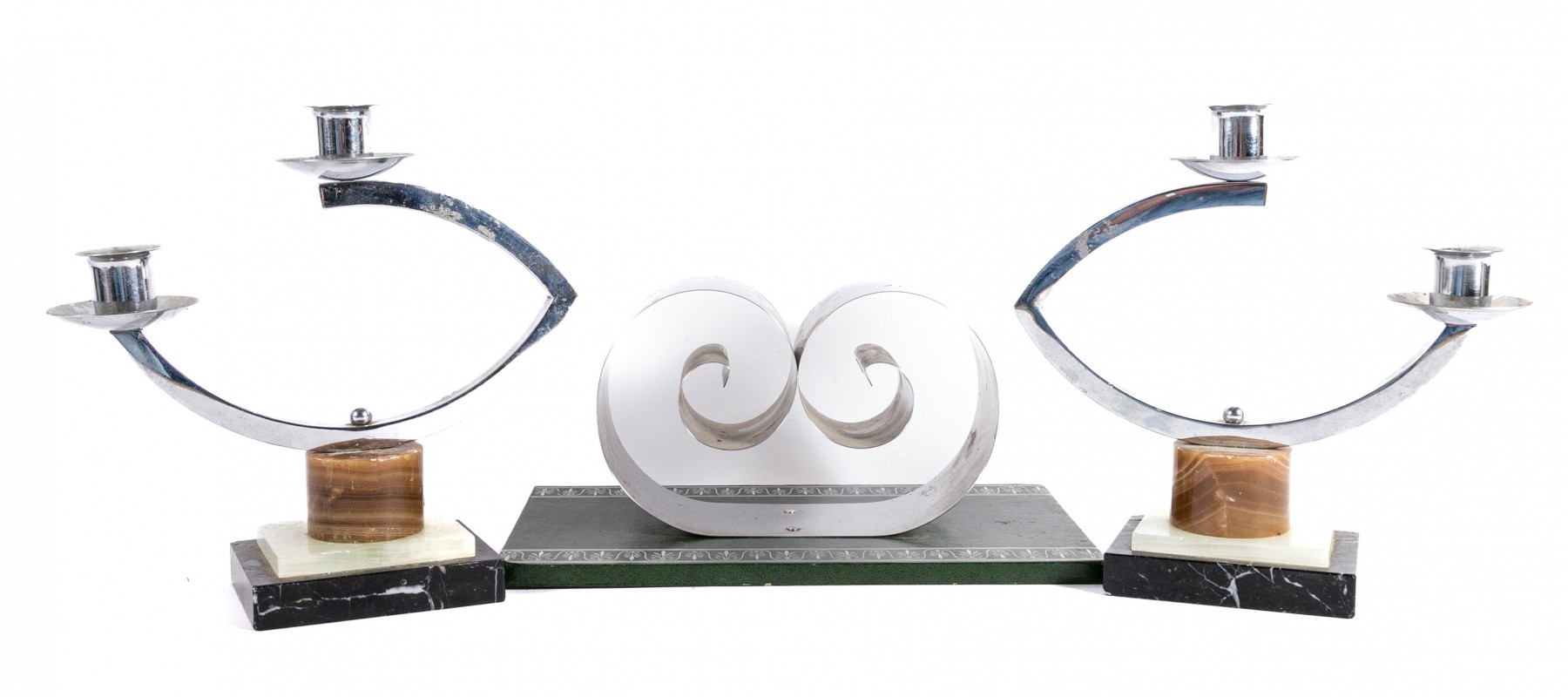 A group of metal table decor with wonderful mid century flare. Includes a large centerpiece bowl composed of gilt grids; a tension book stand with scrolled bookends over a green rectangular base; and a pair of candle holders with asymmetrical chrome arms over tiered brown, white, and black stone bases.