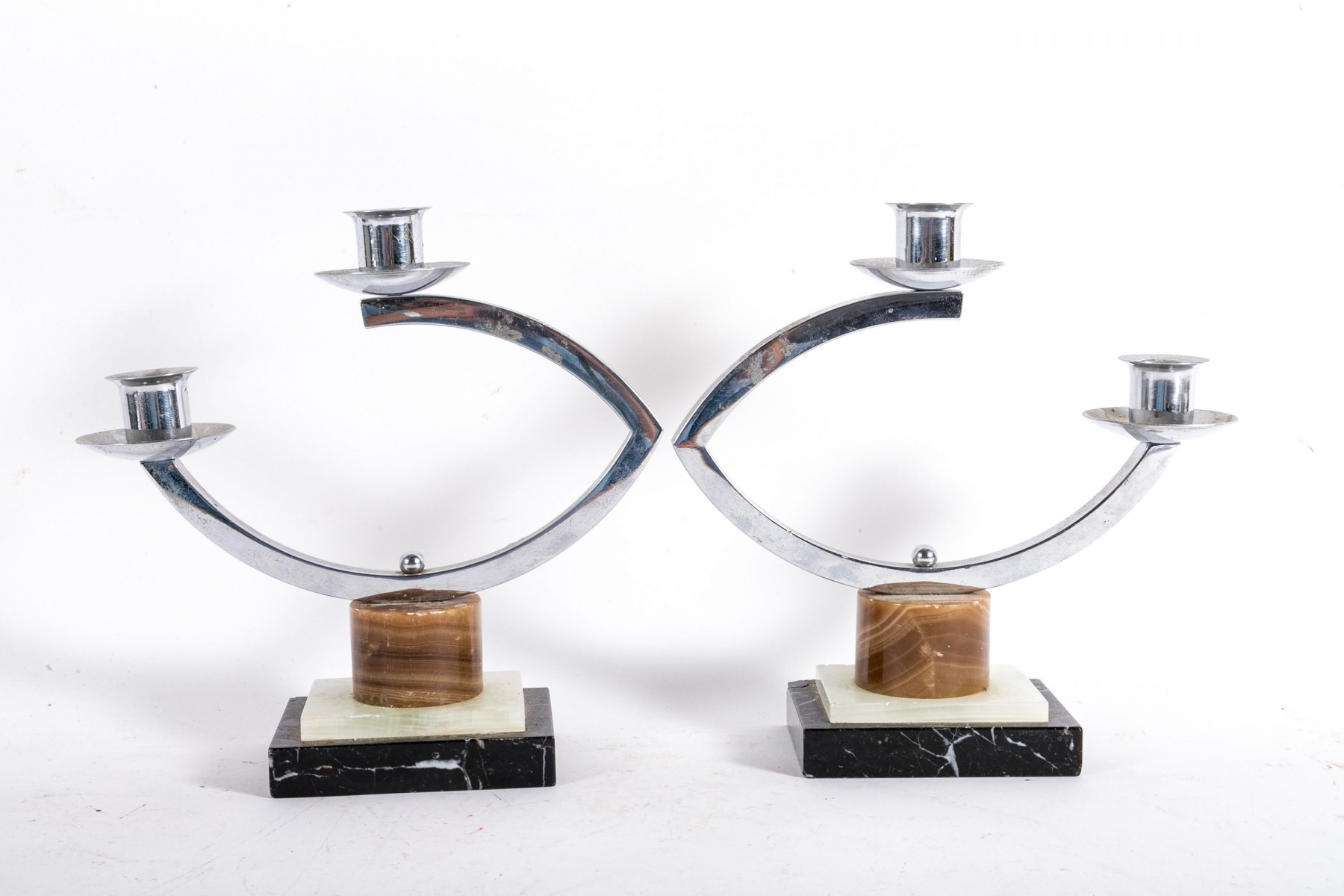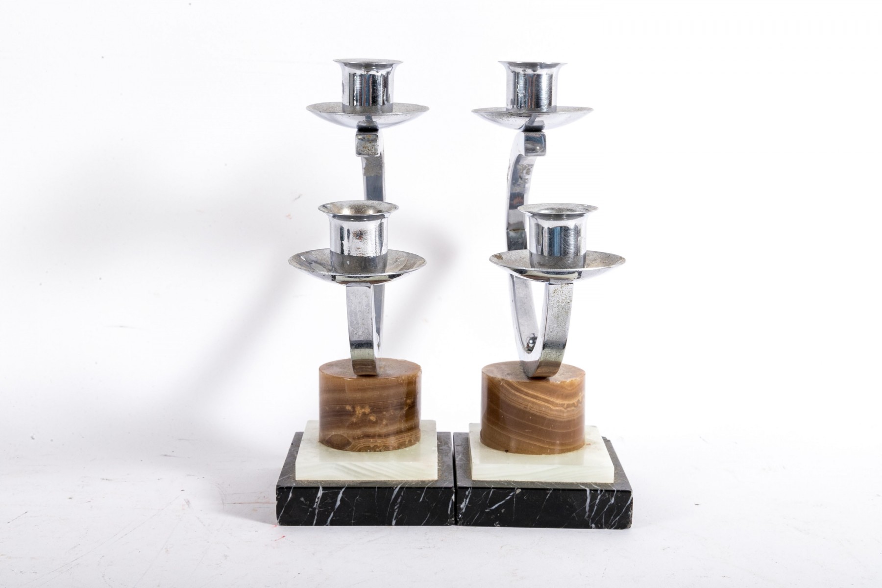 Pieces display well with minor wear around the edges. Wax and sticker residue to the candle holders. Chipped wear around the stone bases of the candle holders. Please review the pictures as they are a part of the condition report.