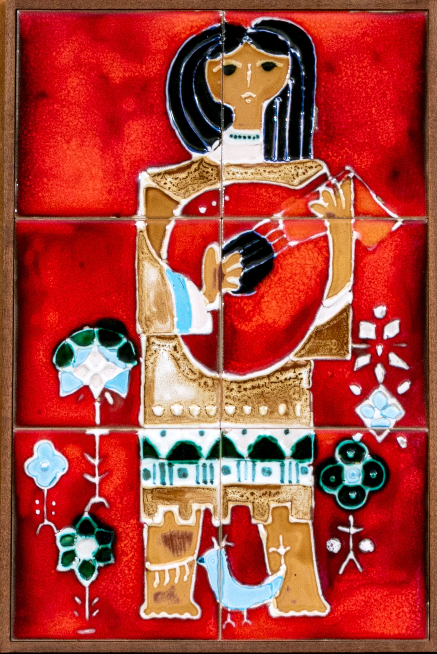 Depicting a native american woman playing a musical instrument. Dimensions: 18 3/8” H x 12 1/2” W