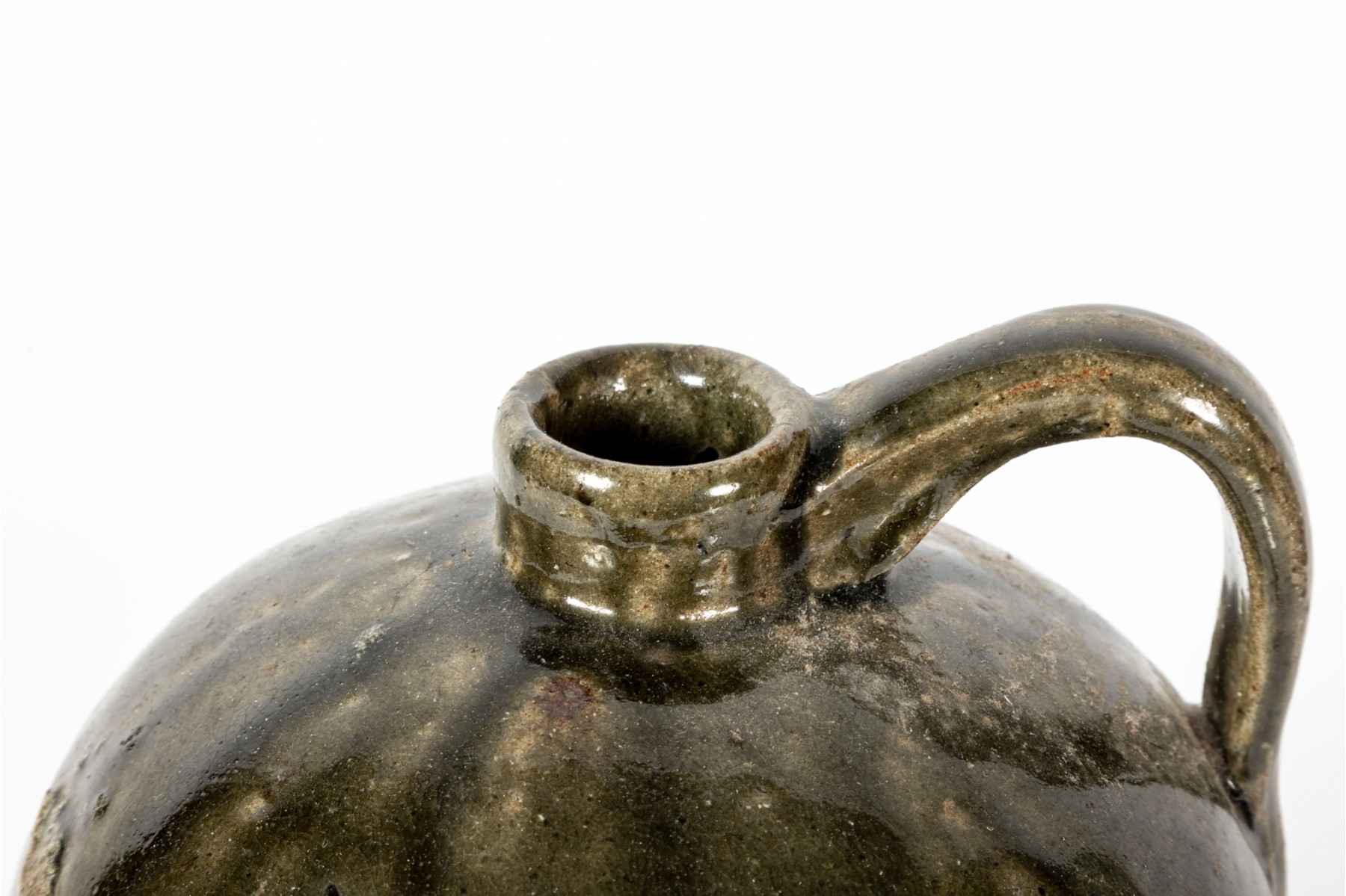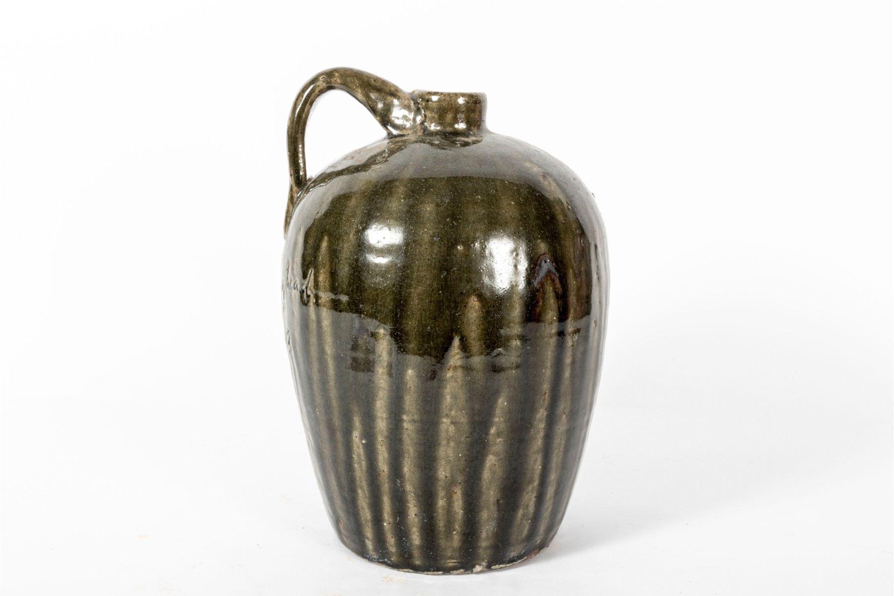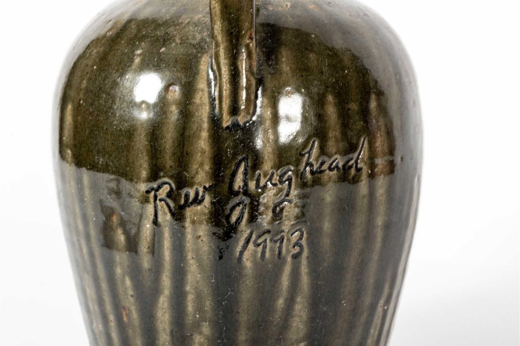 A folk art pottery jug, drip glazed in olive green with the words "Rev. Jughead - 1993" inscribed on the front which confirms the item is from the Meader's family, who often used the name "Jughead" as a radio handle.