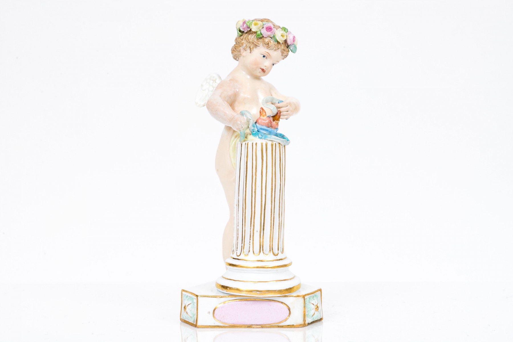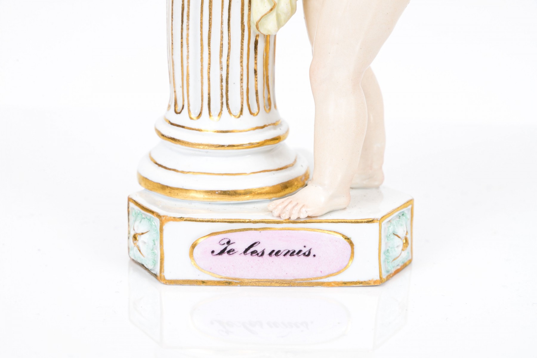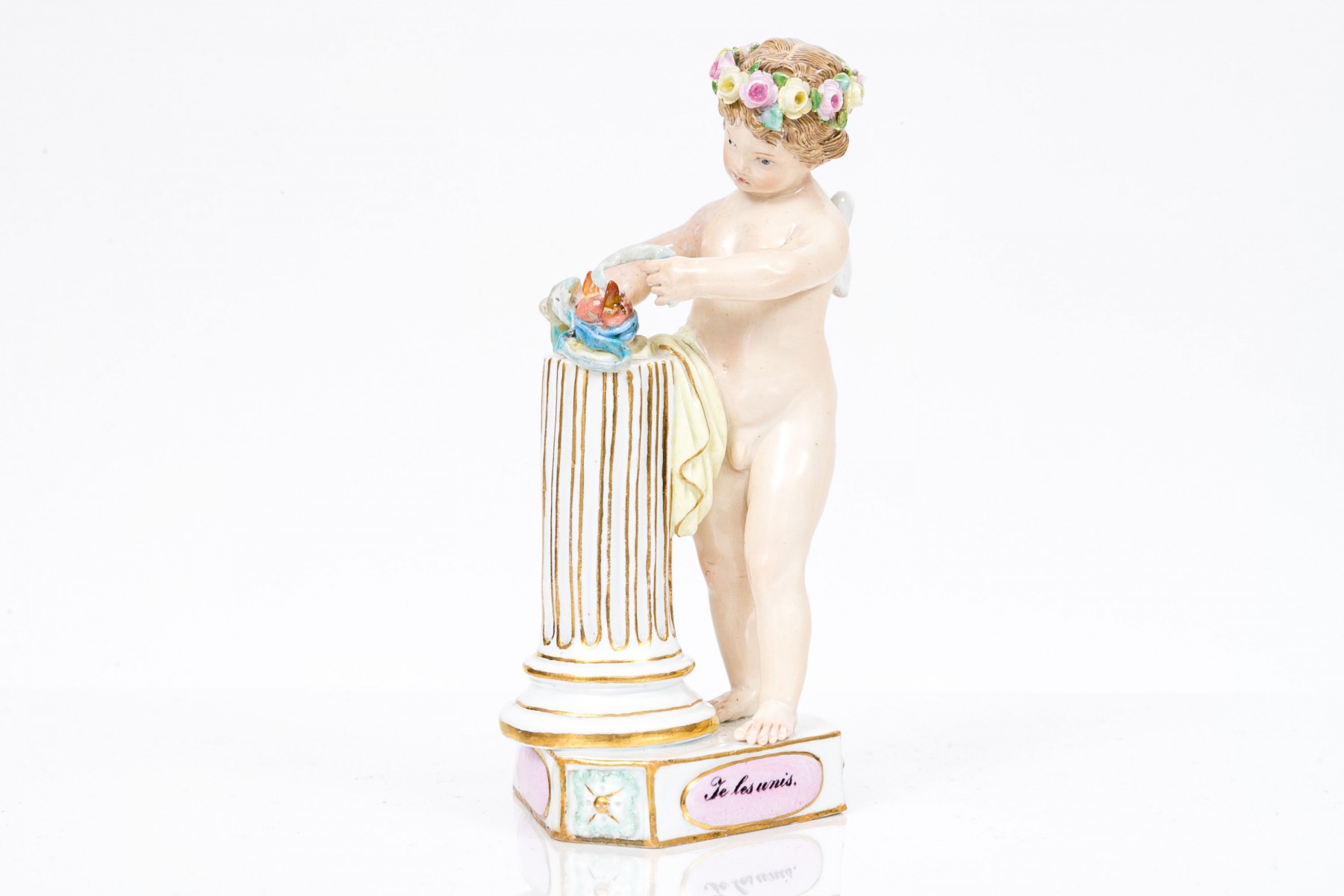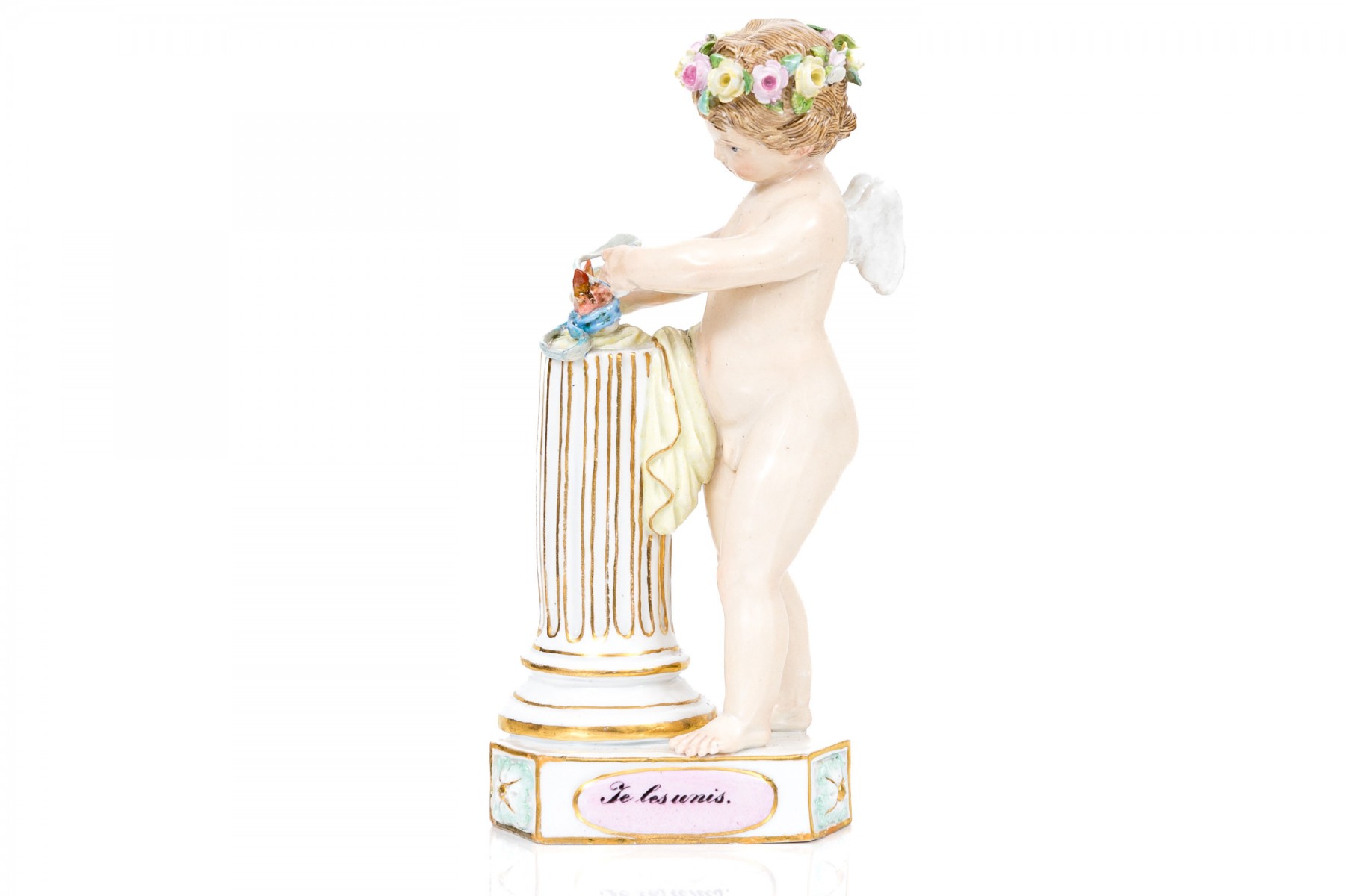 Meissen antique lovely crowned cupid and lovebirds "Te les unis." (to unite them) figure, with column and ribbon motifs