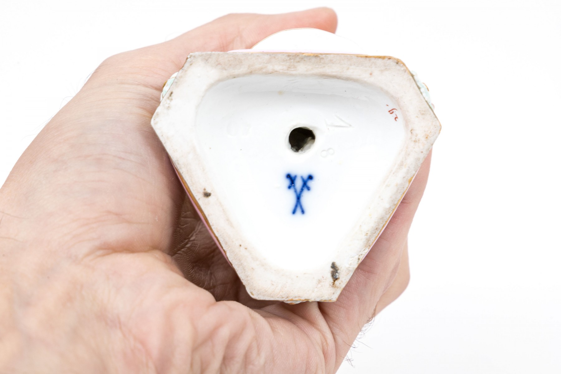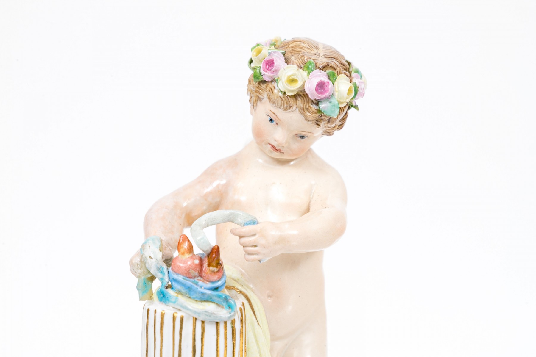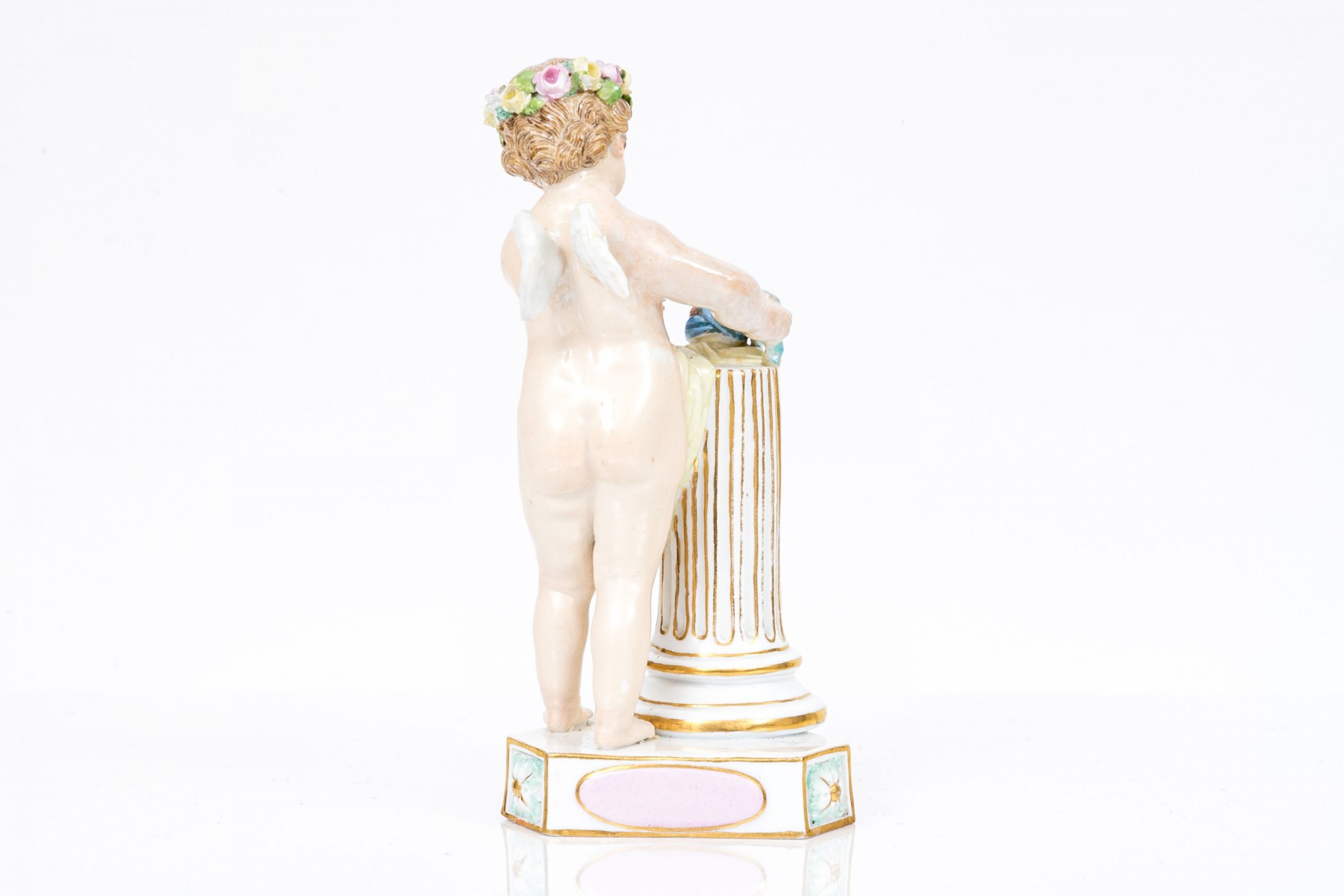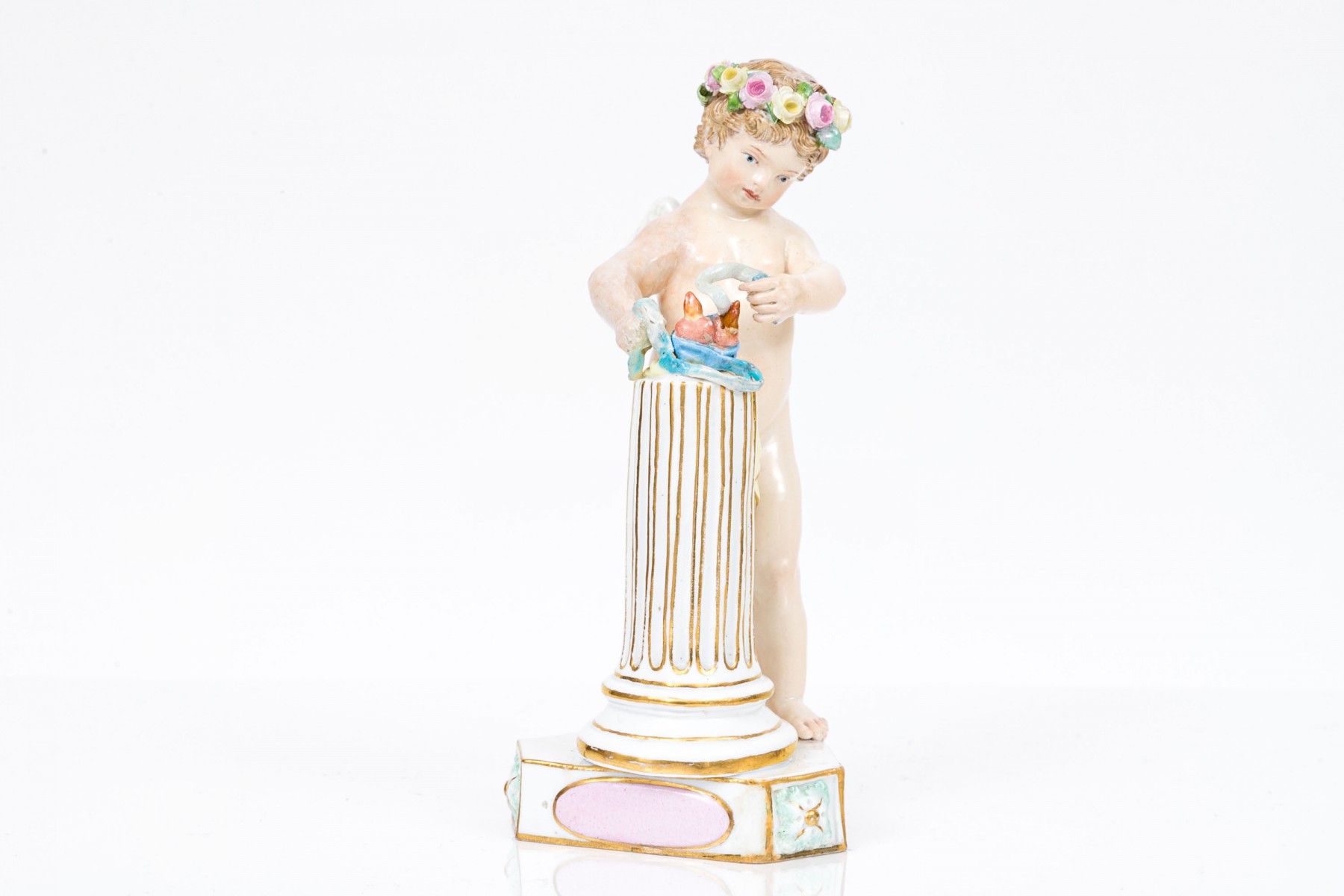 Meissen antique lovely crowned cupid and lovebirds "Te les unis." (to unite them) figure, with column and ribbon motifs