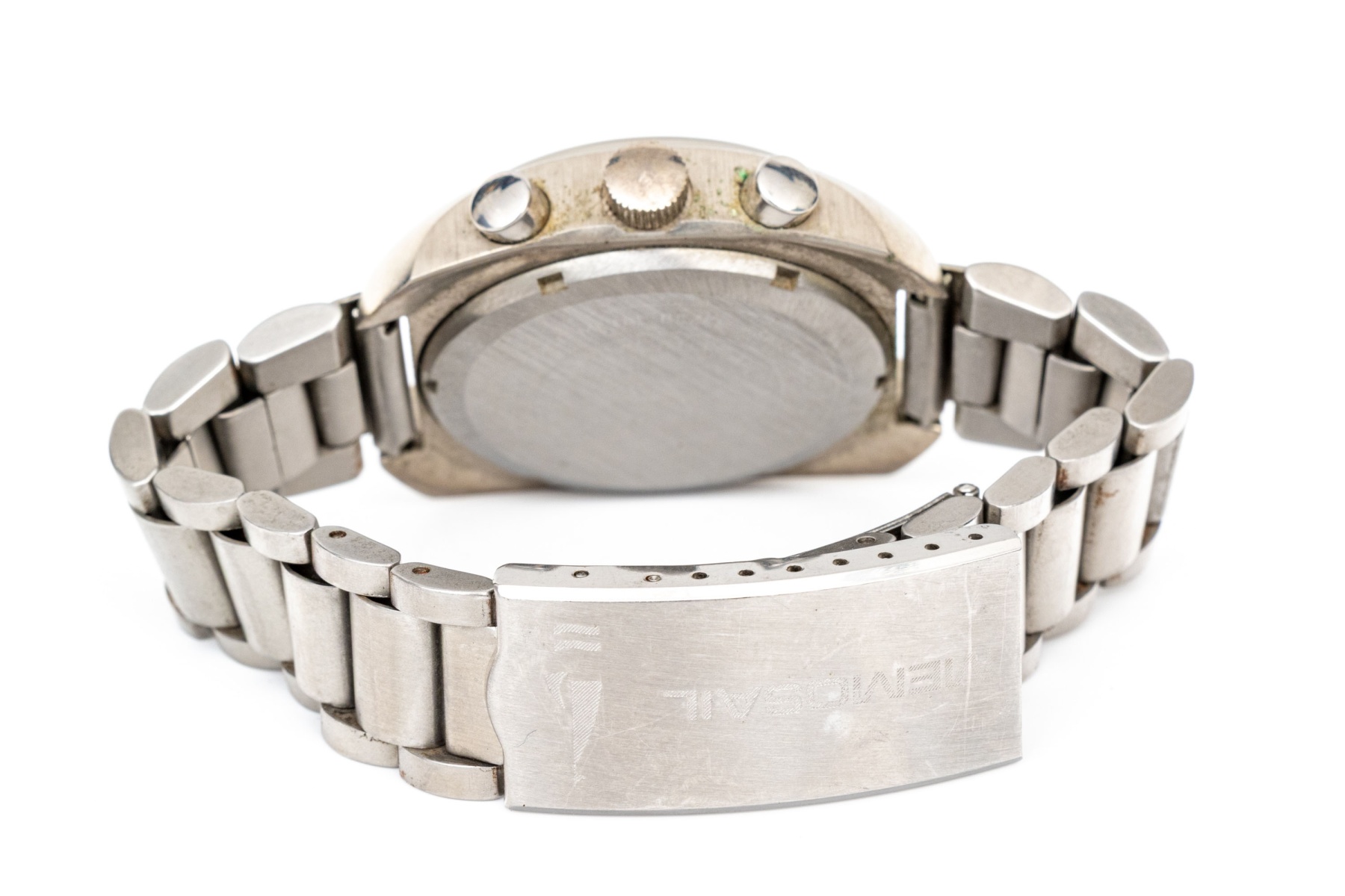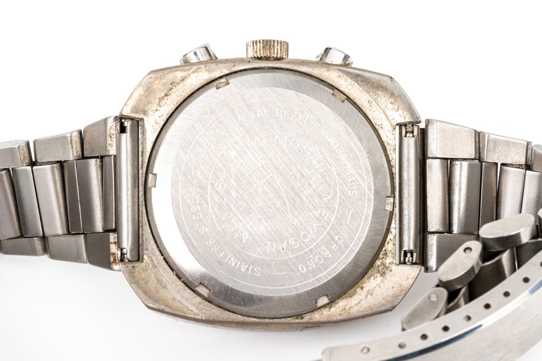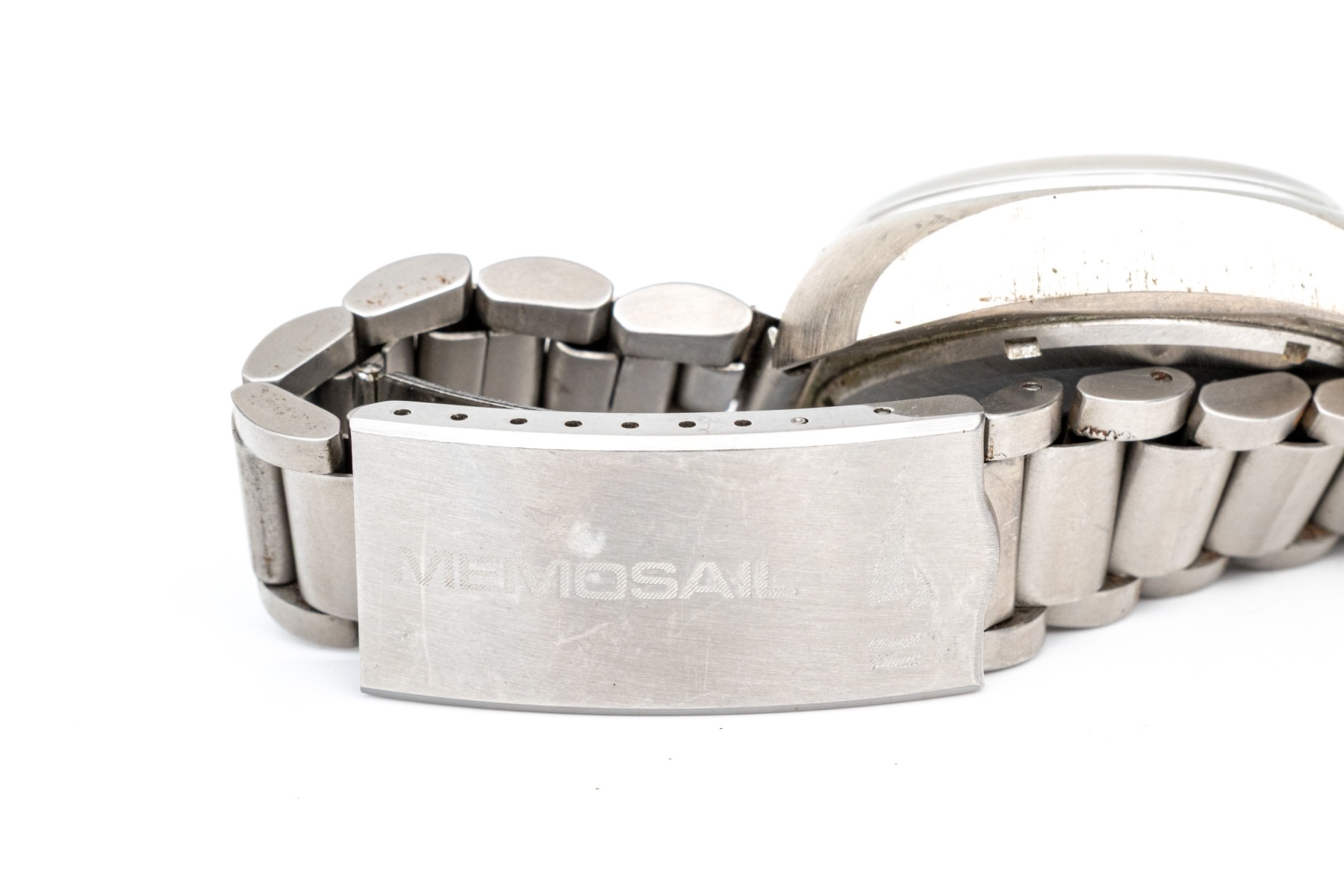 Memosail vintage stainless steel mechanical watch. This fabulous vintage mechanical ten minute, 17 jewel watch features a blue, white, yellow, and orange dial, a sixty second counter and is finished with a brushed steel bracelet.