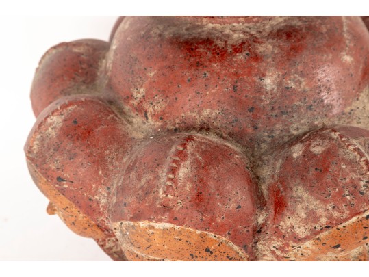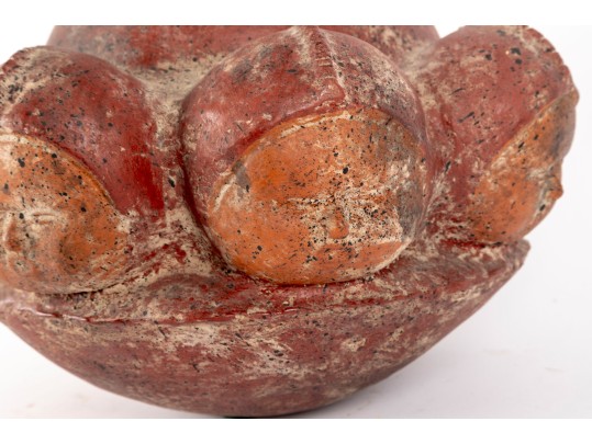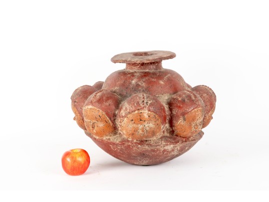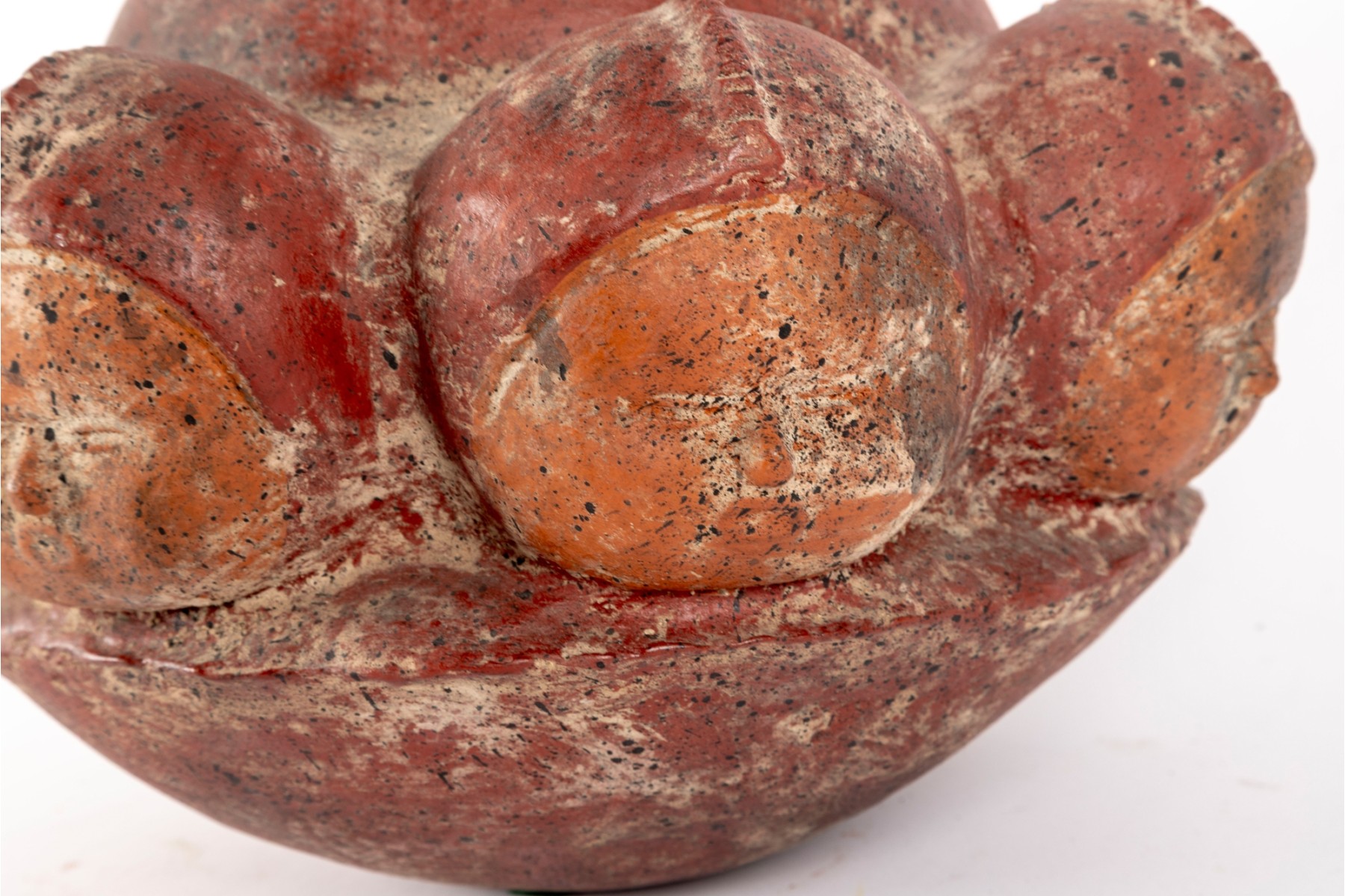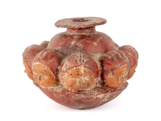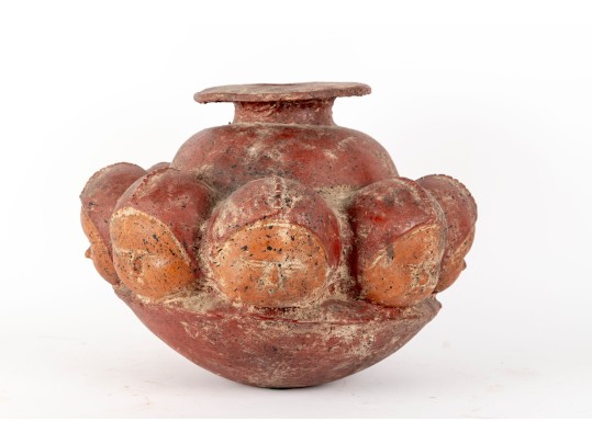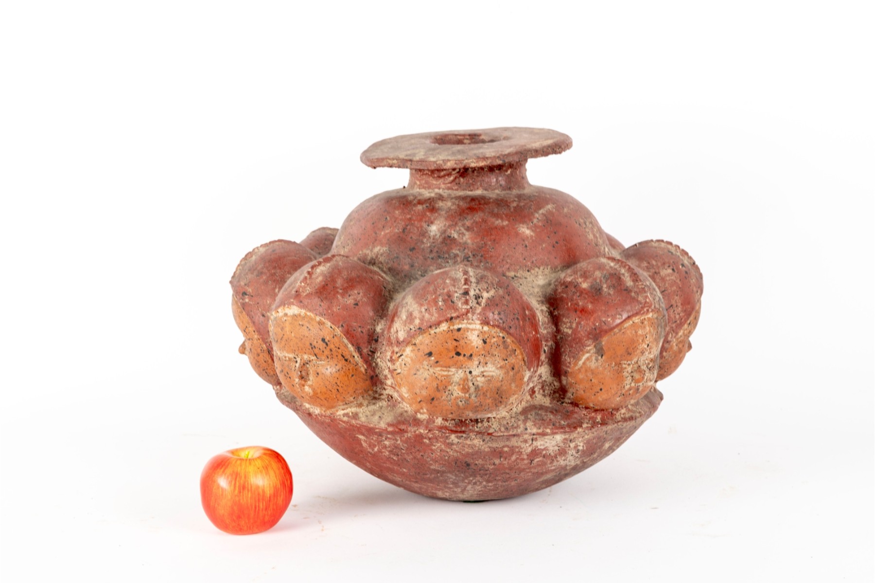 An extraordinary example of pre-Columbian-style ceramic art, this pot draws inspiration from the Comala tradition of Western Mexico, featuring a redware body with an unusual applied ring of stylized faces encircling the midsection.