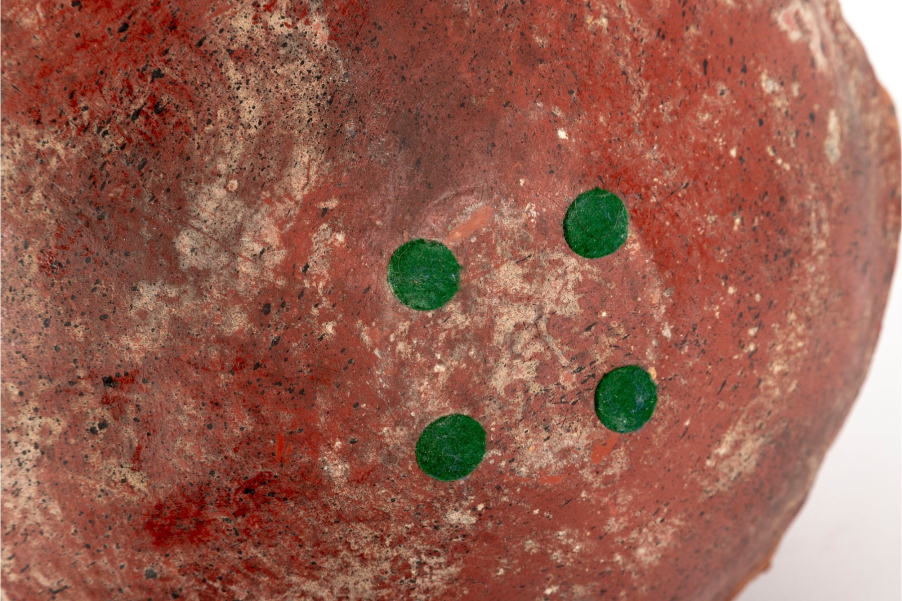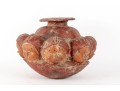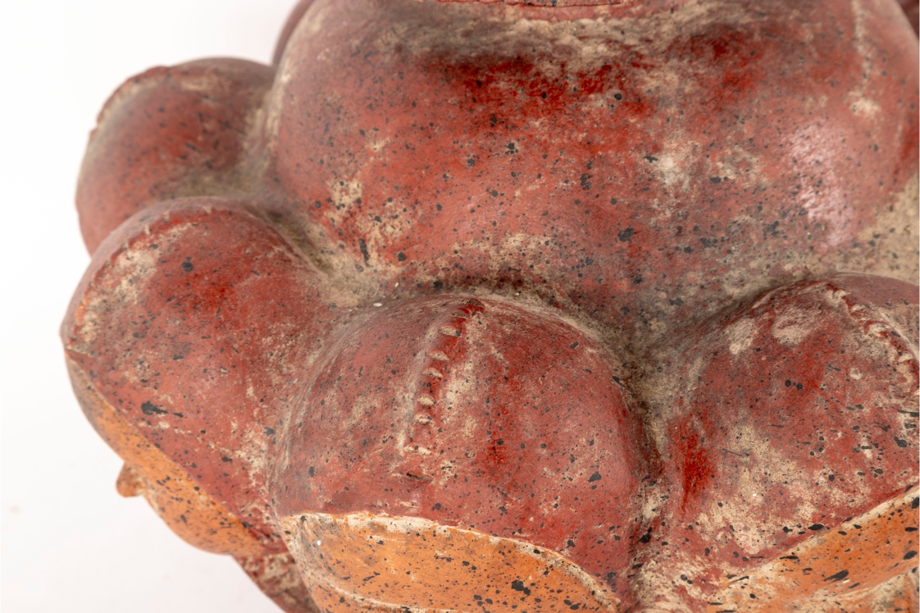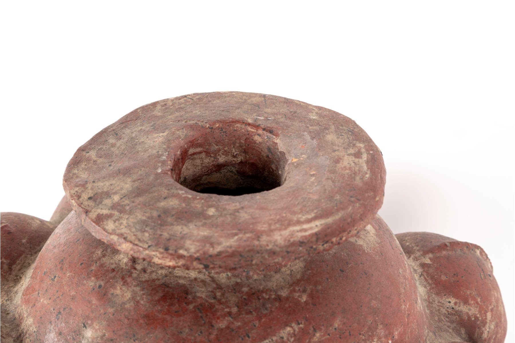 An extraordinary example of pre-Columbian-style ceramic art, this pot draws inspiration from the Comala tradition of Western Mexico, featuring a redware body with an unusual applied ring of stylized faces encircling the midsection.