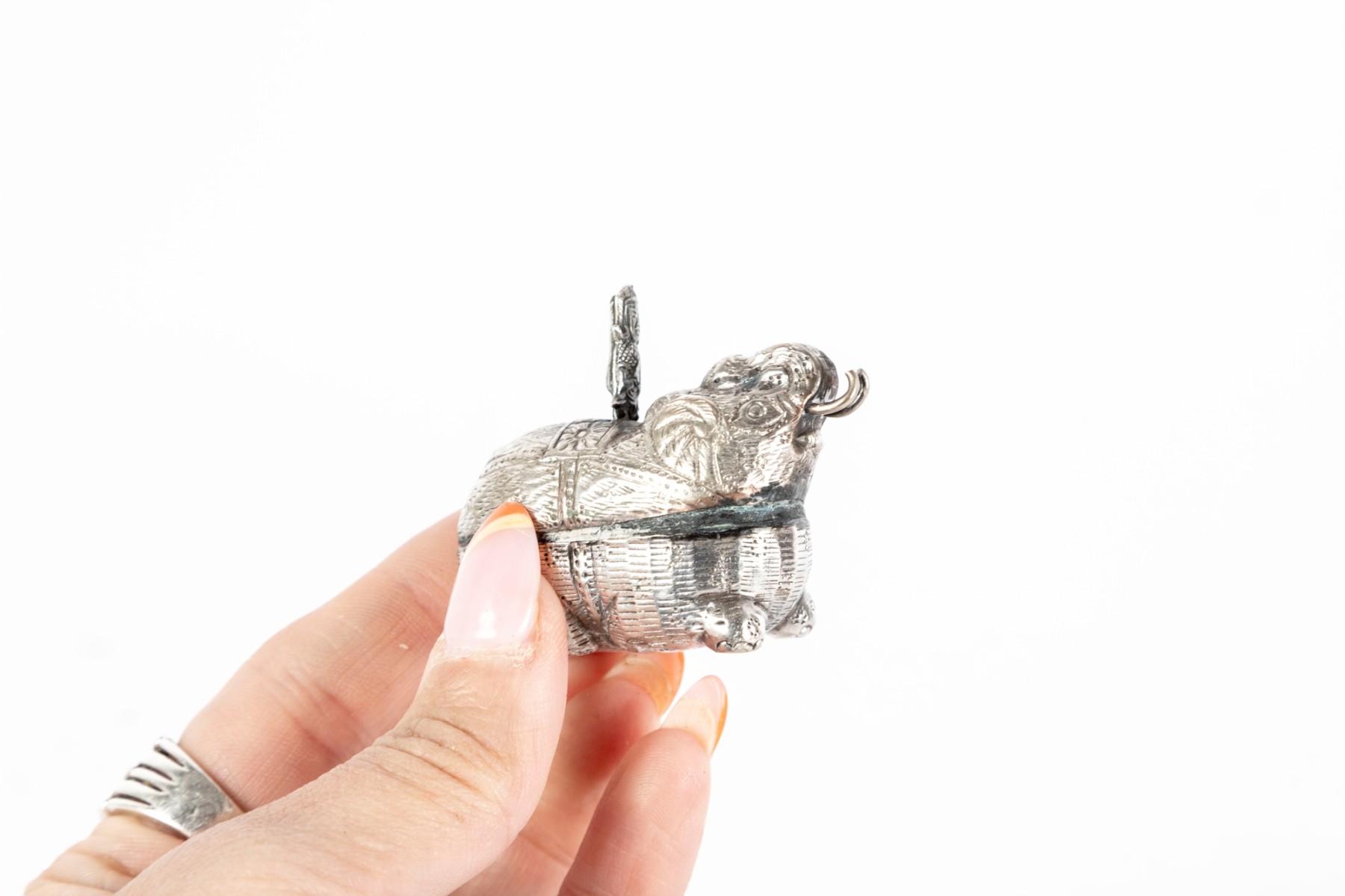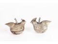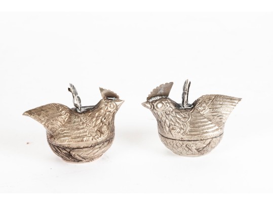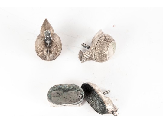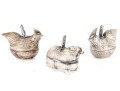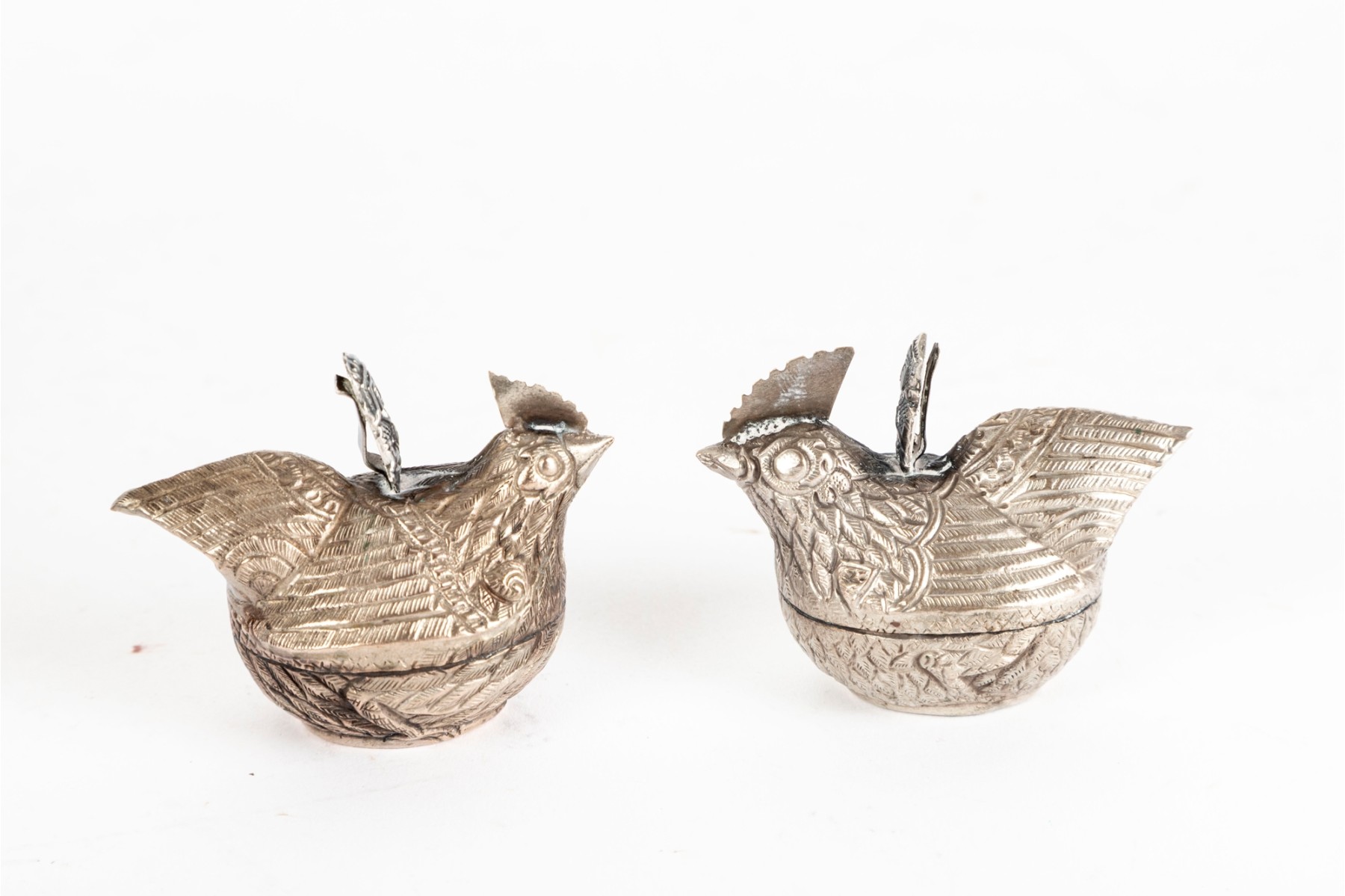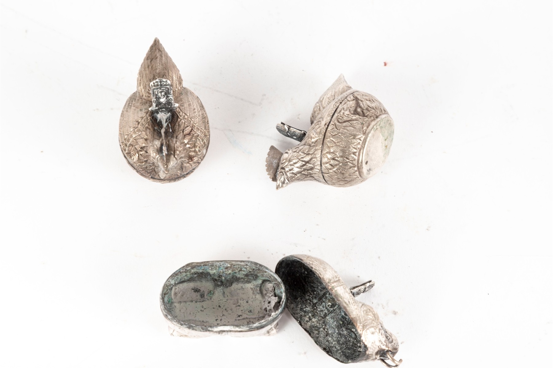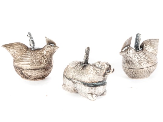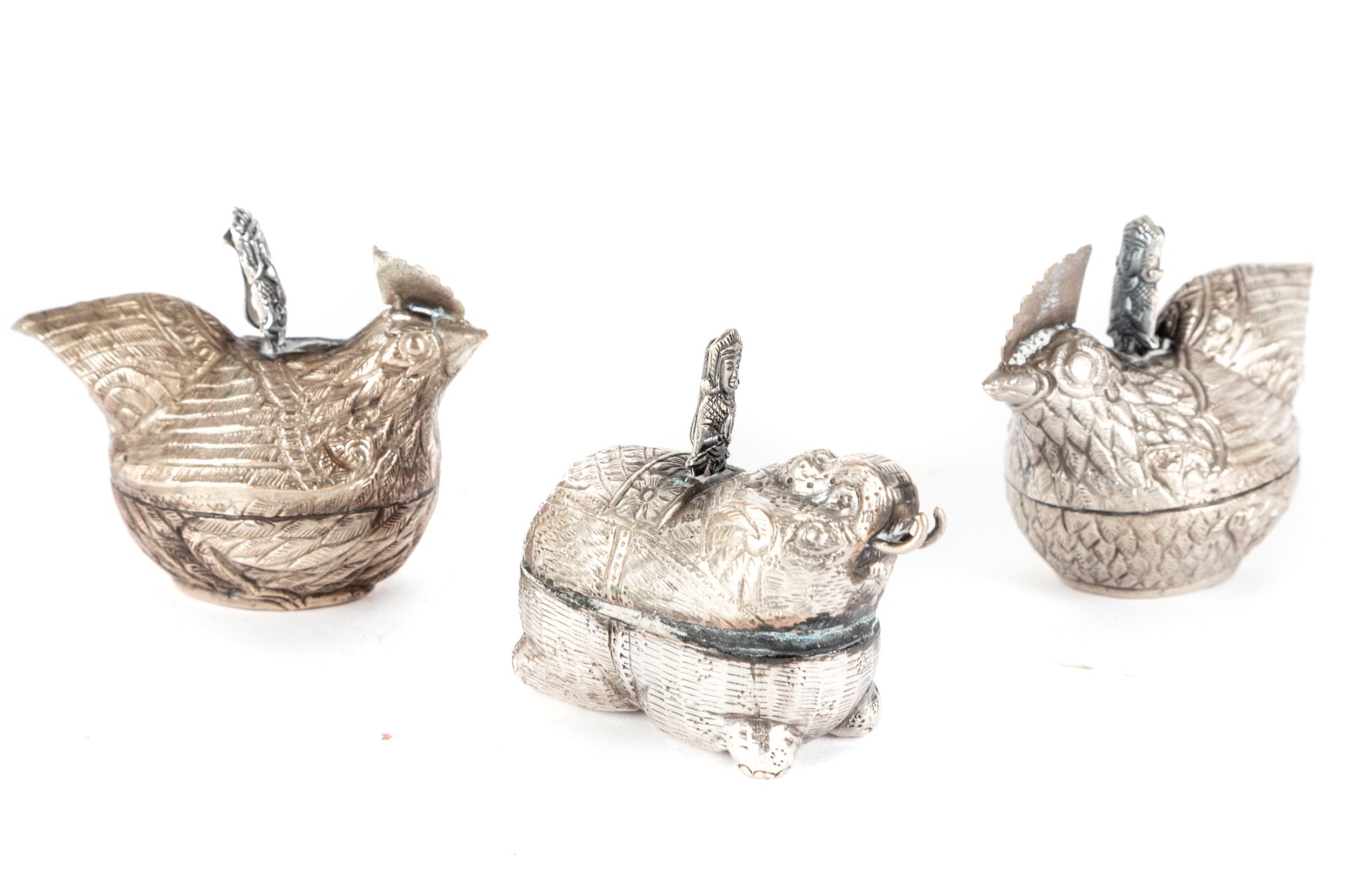 A lovely trio of metal betel boxes, likely Cambodian. Includes a pair of hens with beautiful detail throughout the feathers and a single elephant with a curled tusk and decorated saddle. All topped with finely detailed figural handles.